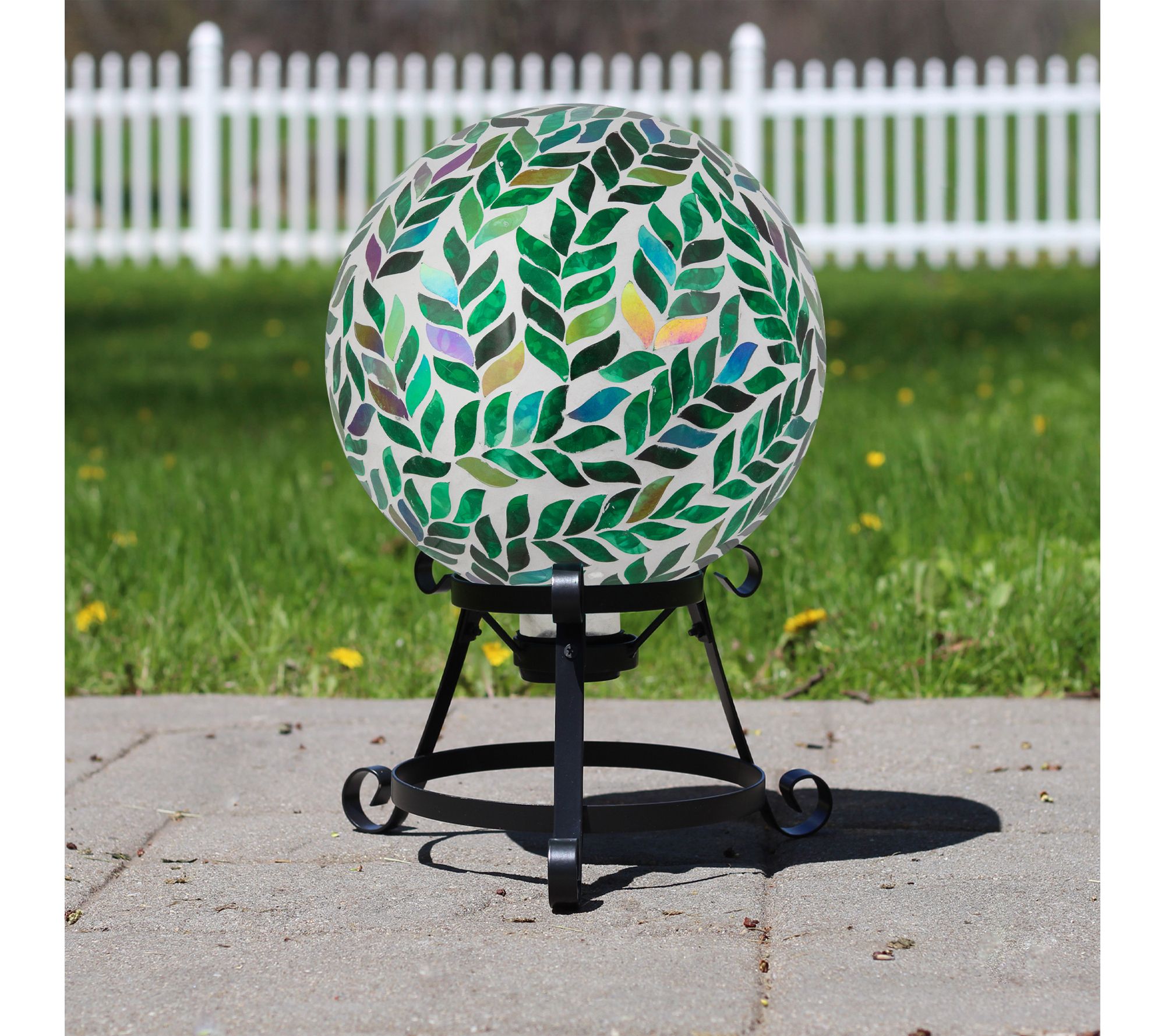 Create a garden retreat that feels magical with this glass gazing ball -- an eye-catching accent featuring a serene white base adorned with a mosaic of iridescent green leaves. As sunlight streams through its shimmering patterns, your outdoor space is filled with captivating reflections, whether you nestle it among blooms or place it as a stunning focal point. From Northlight.