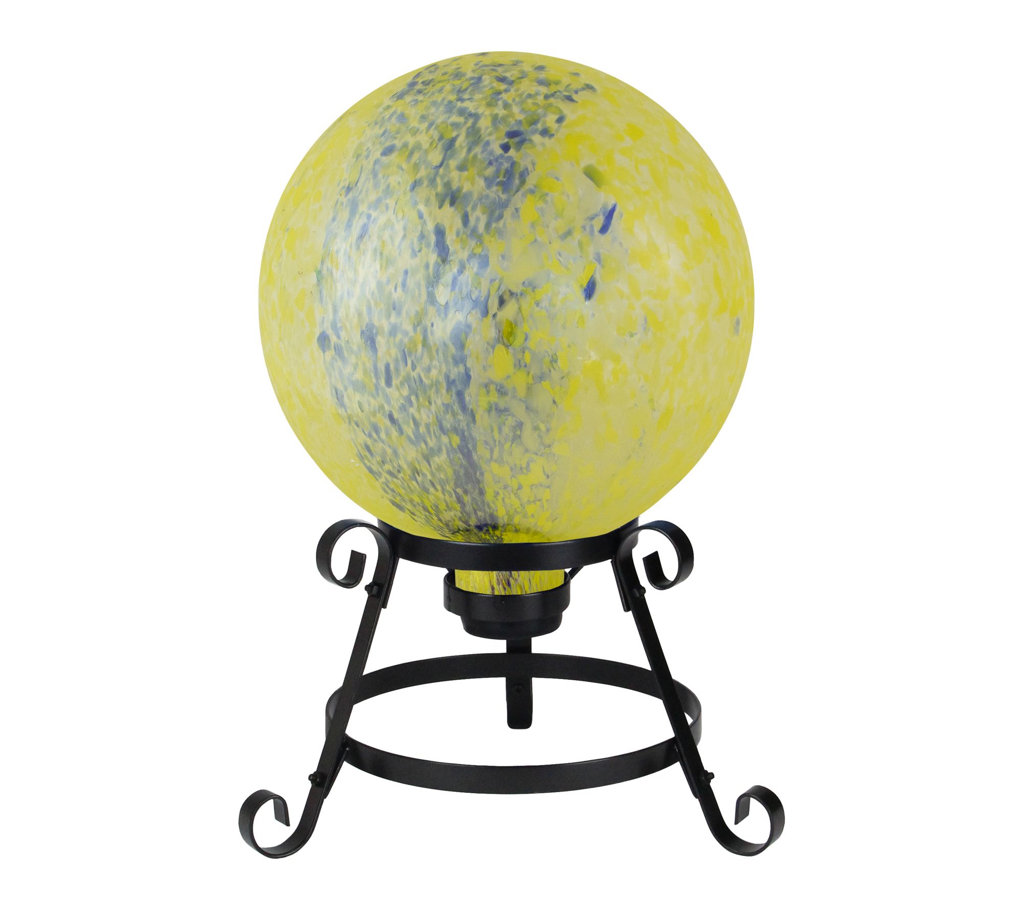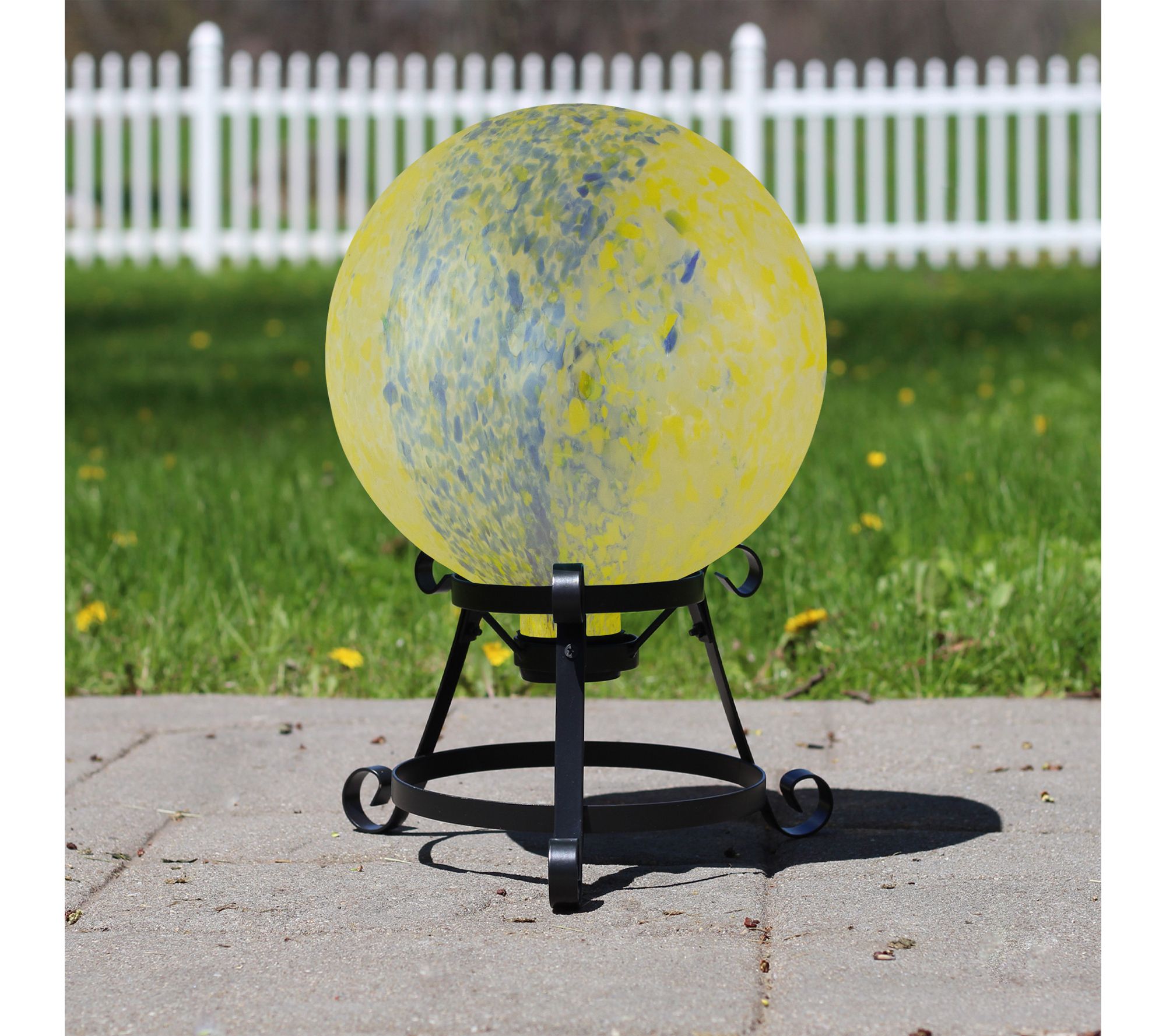 Add a splash of color and whimsy to your outdoor space with this garden gazing ball. Its yellow and blue reflective glass finish catches the sunlight, creating dazzling displays, while the stemmed bottom with rubber cap makes placement easy in your favorite stand. Whether nestled among flowers or displayed on a patio, this vibrant accent infuses charm in any setting. From Northlight.