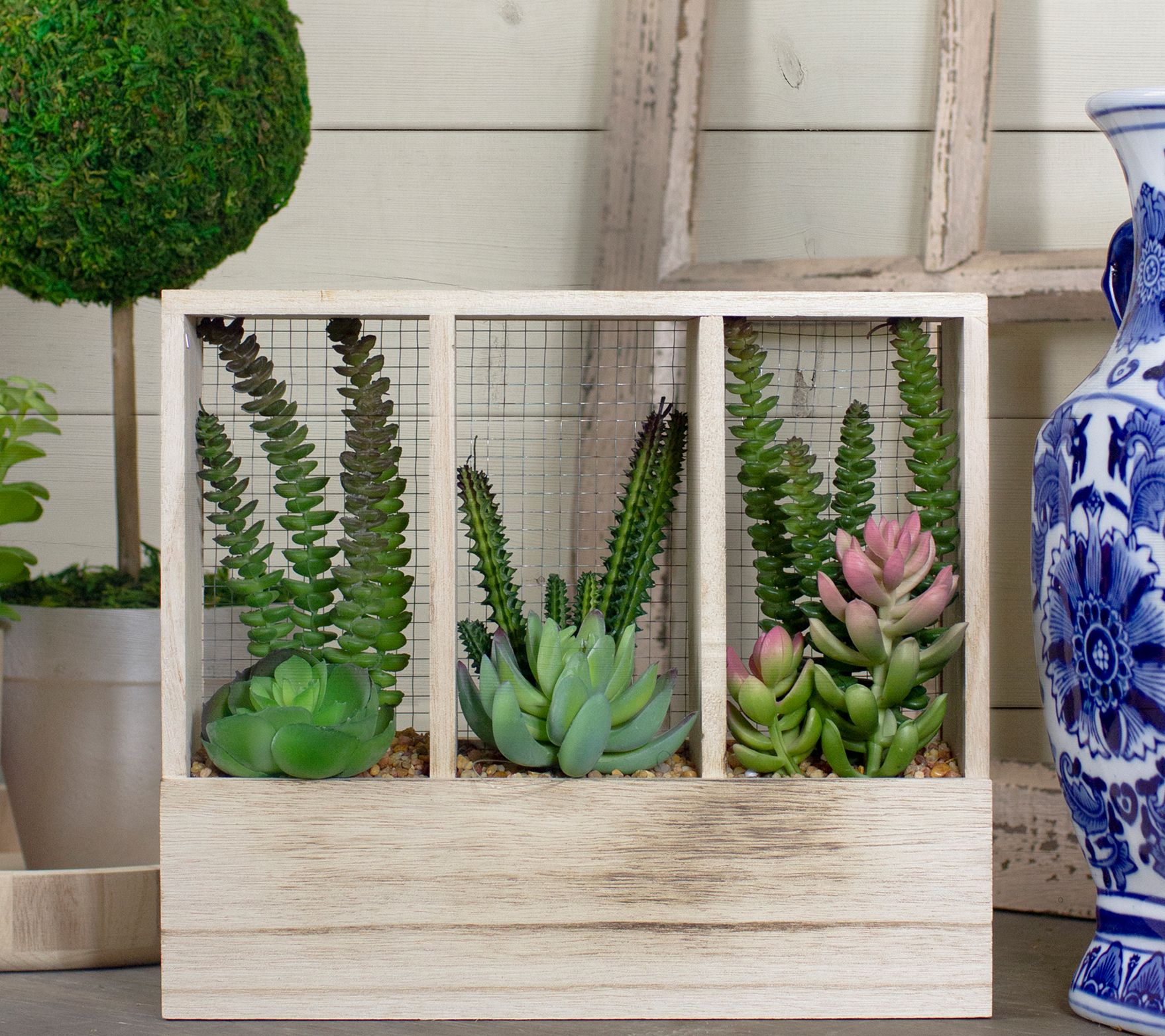 Add earthy beauty to your space with this stunning arrangement, featuring a wire-backed wooden box with a lovely assortment of lifelike faux succulents. From Northlight.