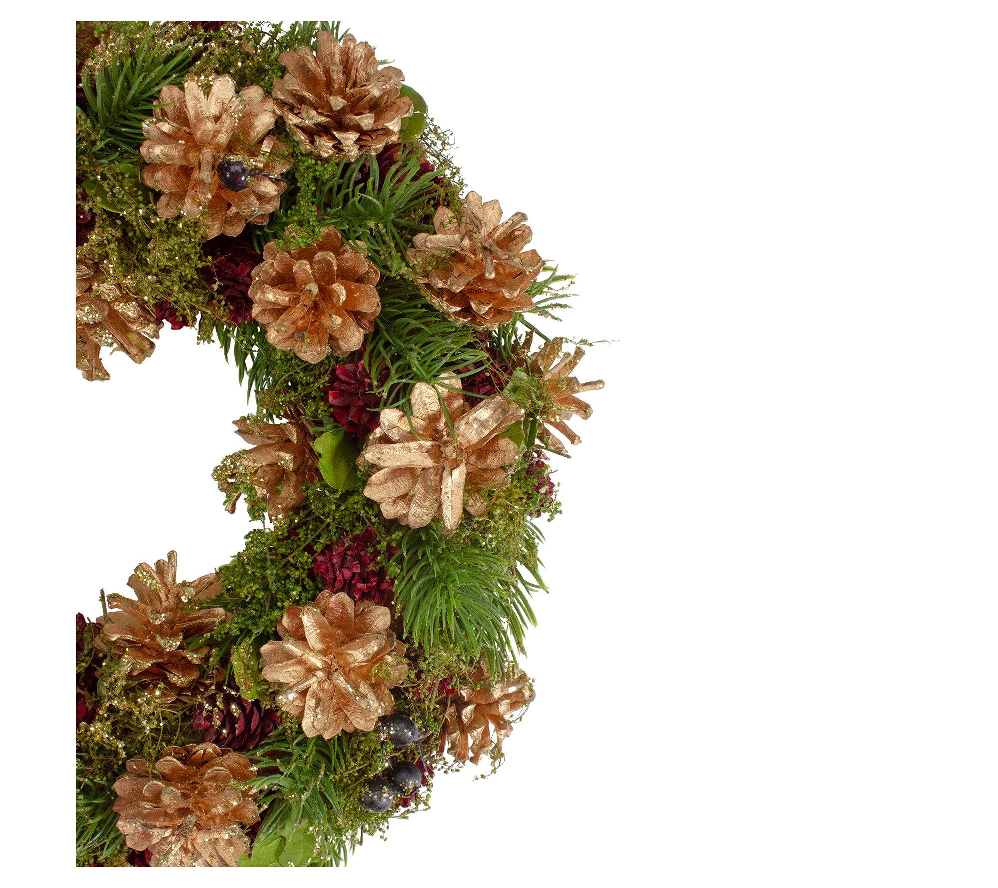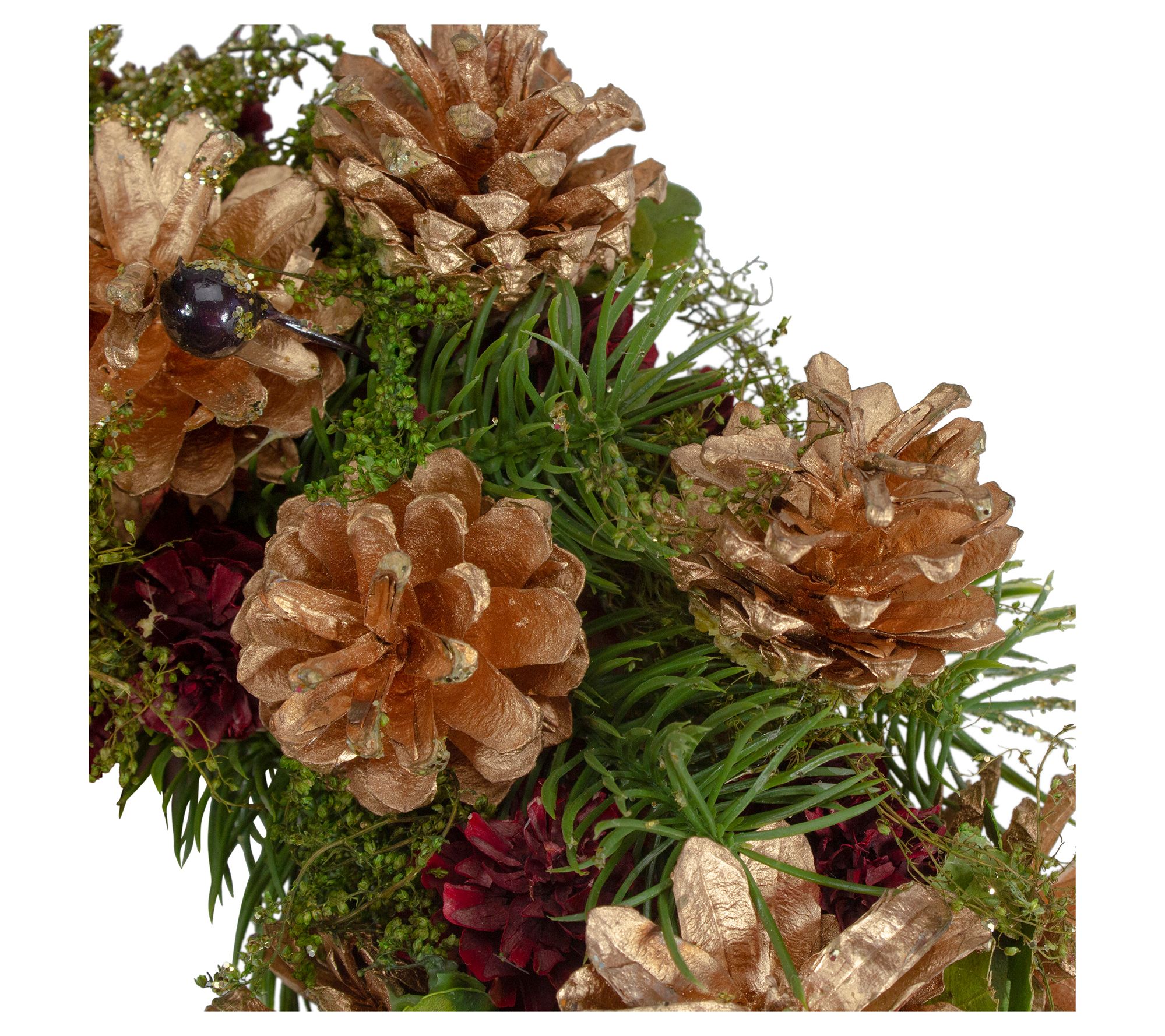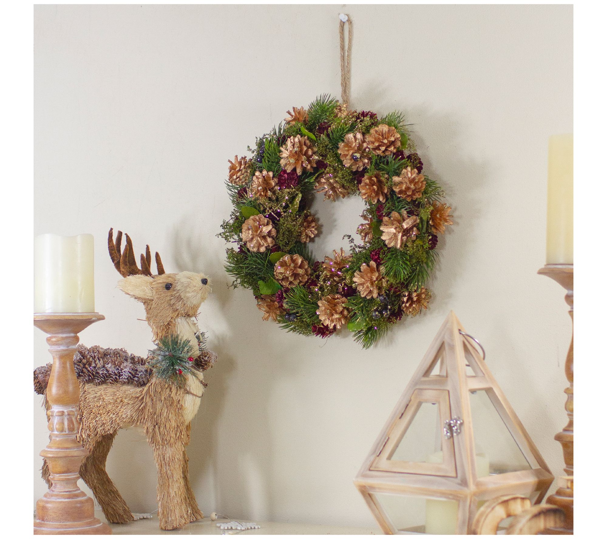 Add festive flair to your entryway or mantel with a burst of holiday sparkle. This glittering pinecone wreath welcomes guests with shimmering goldtone and red accents and lush foliage, whether hung on your door or set on the table with a candle at its center. Decorating is effortless -- just fluff and hang for instant cheer. From Northlight.