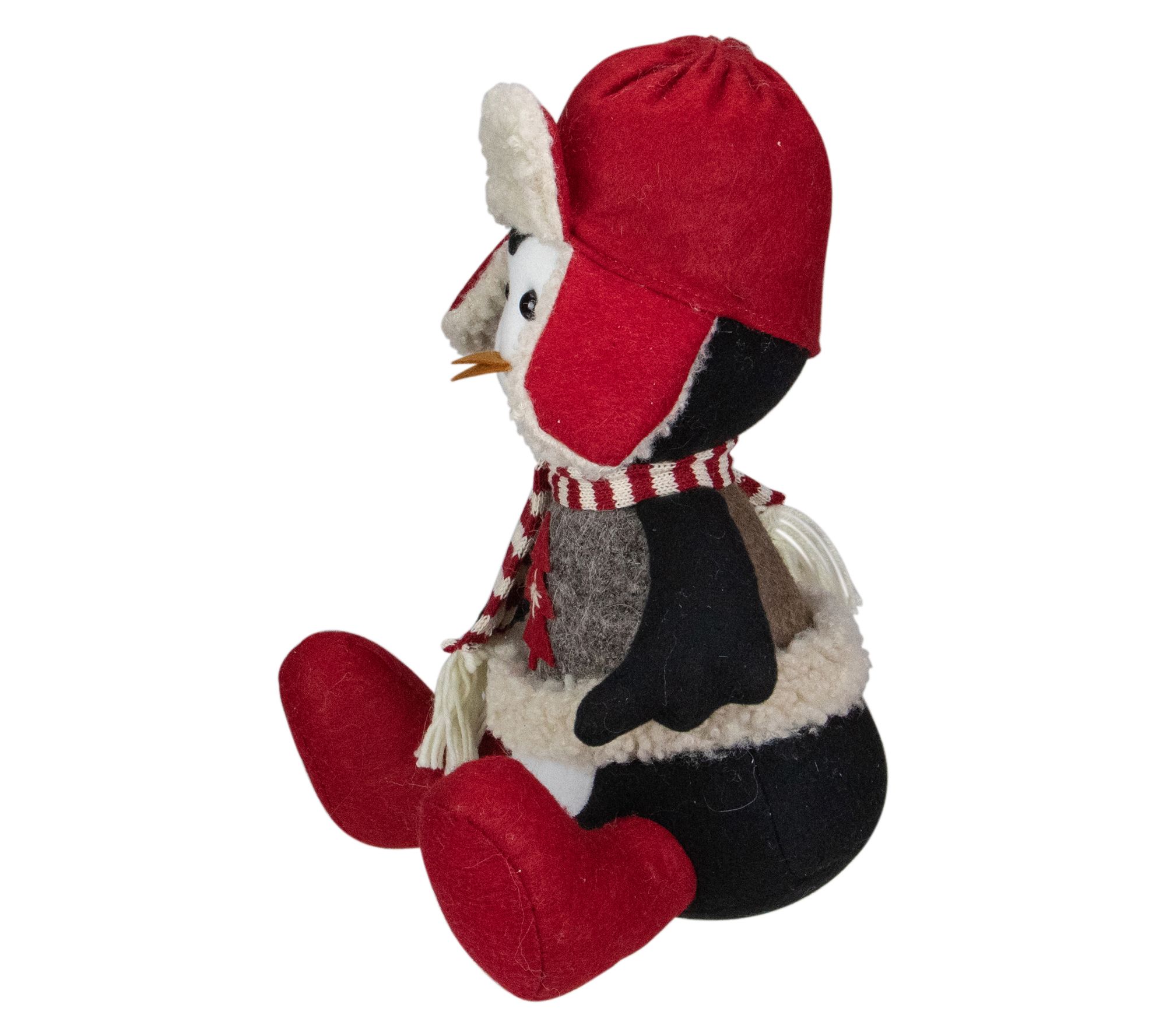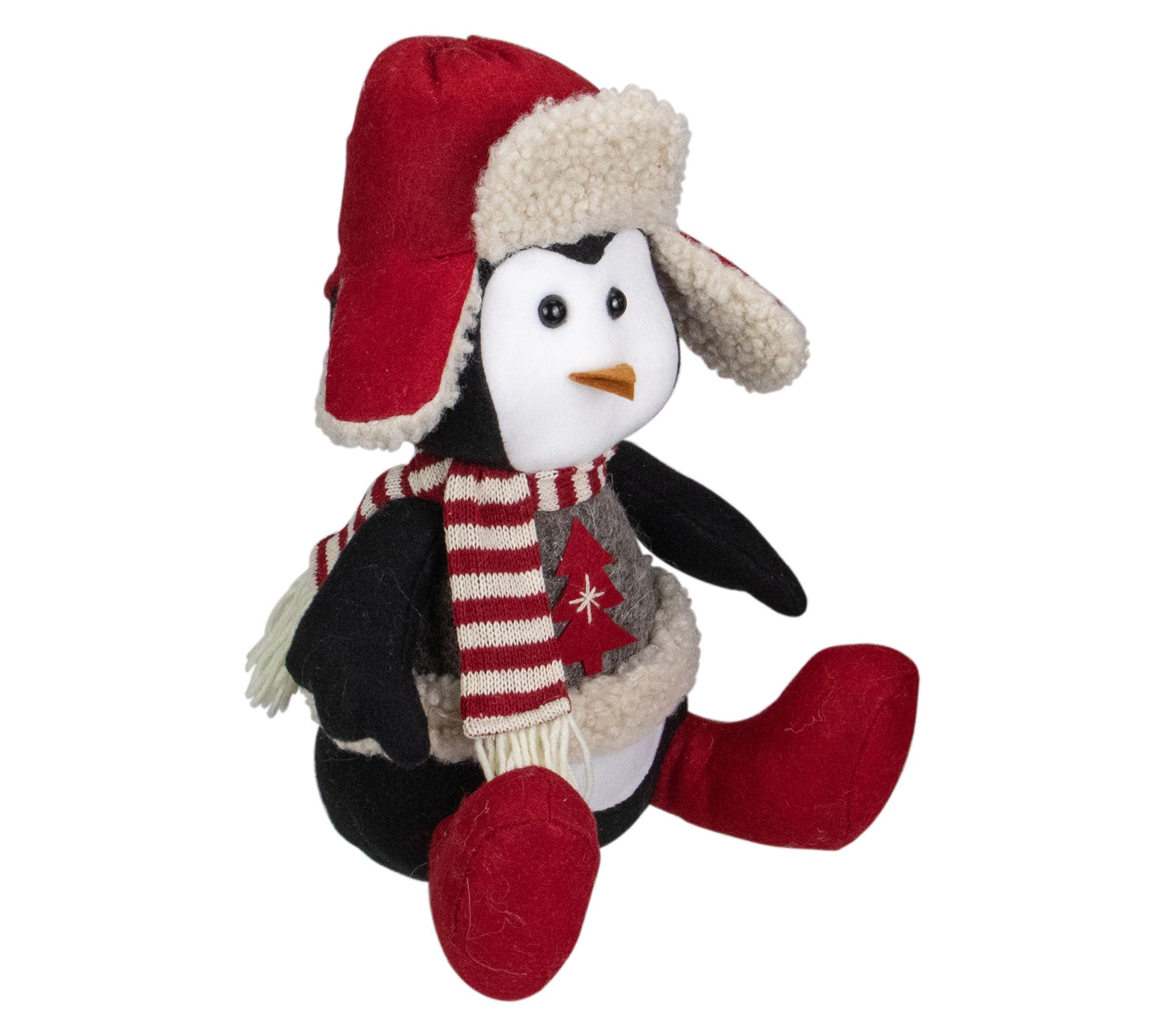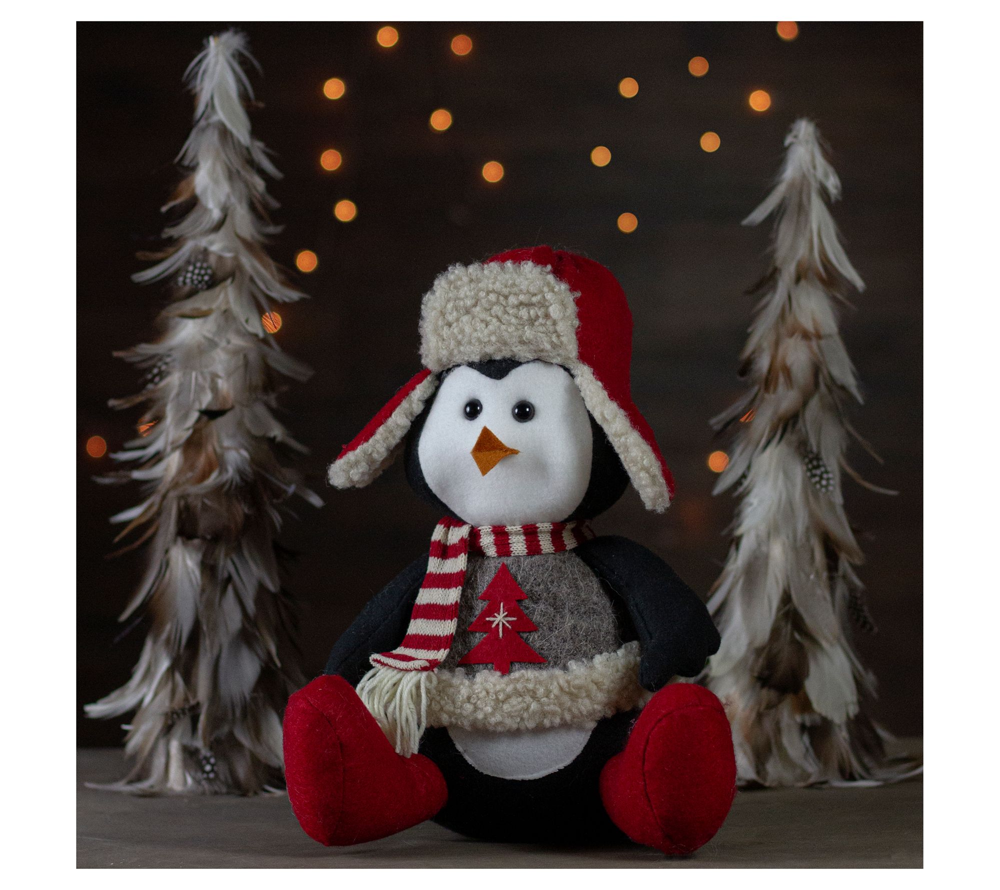 Spruce up your holiday setup with this delightful wintery guest. Perched comfortably, this charming penguin dons a festive red cap with luxurious faux ivory trim, a playful red- and ivory-striped scarf, and a cozy gray vest adorned with a classic Christmas tree design. Perfect for the mantel or a welcoming entryway display, the adorable penguin embodies the spirit of joy and warmth during the festive season. From Northlight.
