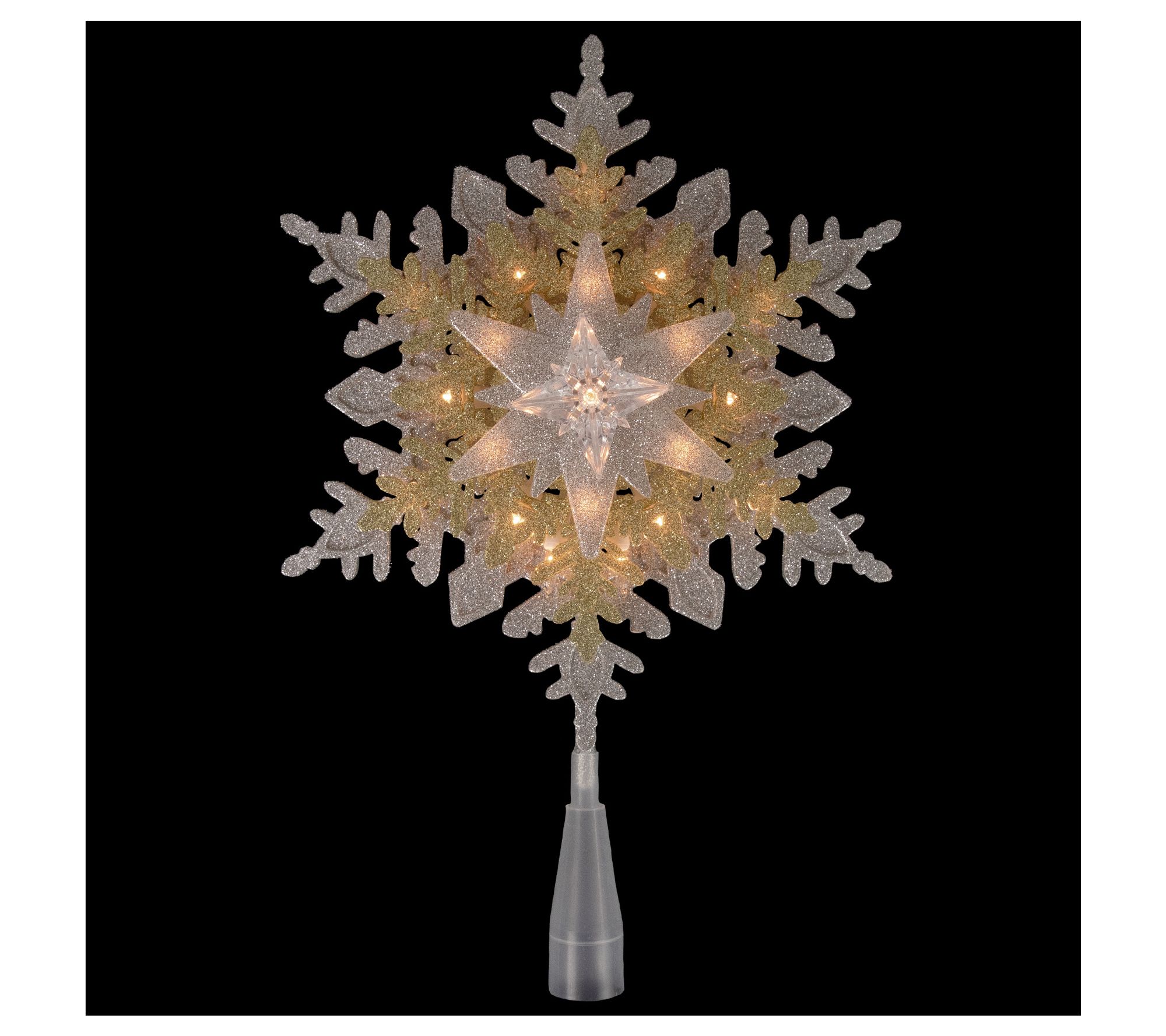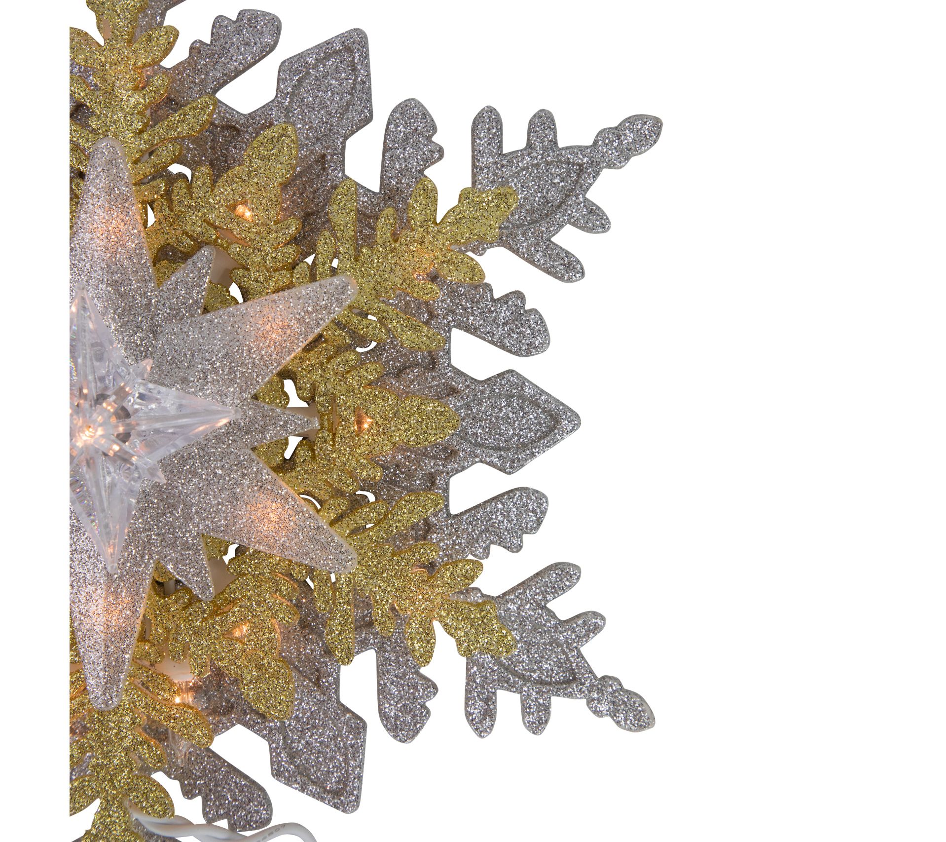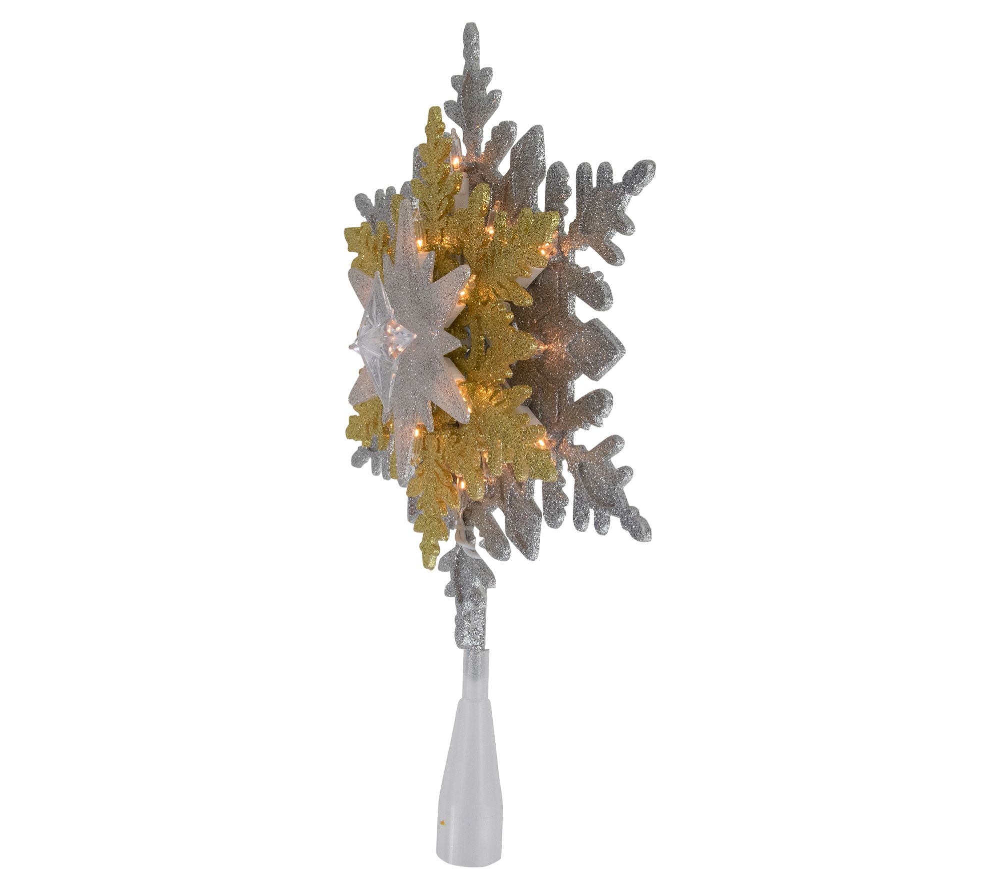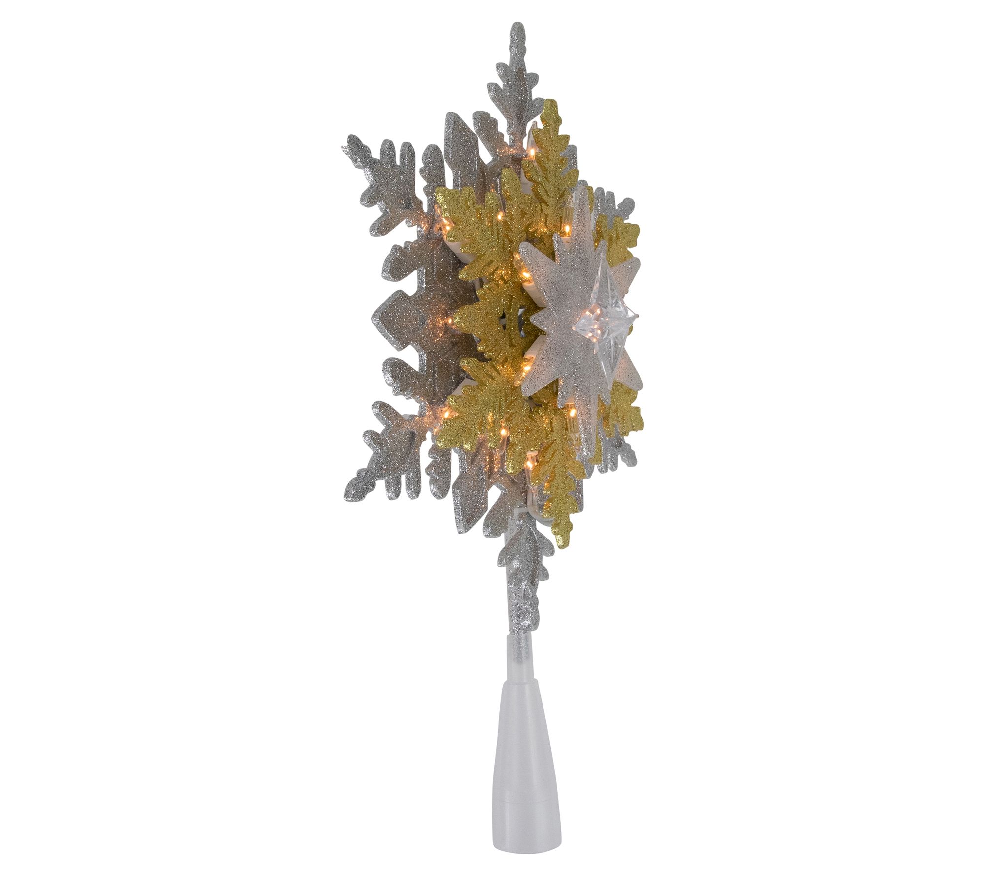 Holiday evenings feel especially magical when your tree shines with the radiant glow of this snowflake. Clear lights sparkle across the silvertone and goldtone design, casting a cozy light through the room and bringing the finishing touch to every festive gathering. An easy-to-attach cone and included extras let you set up and enjoy in minutes. From Northlight.
