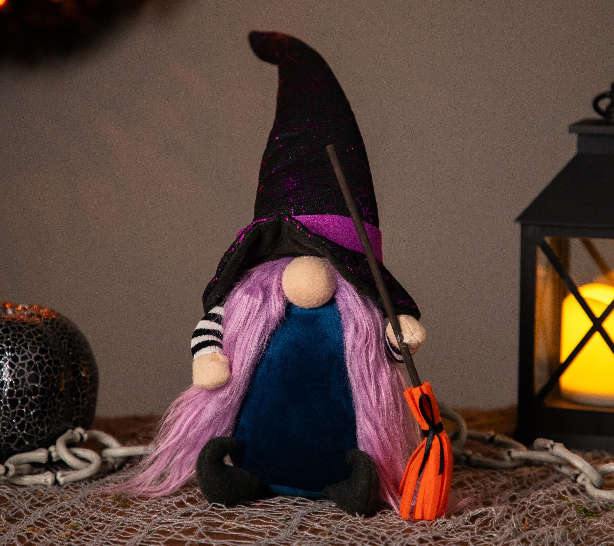 Dark nights and spooky frights fill the air when you have this adorable witch gnome. Her black hat is adorned with a purple spiderweb design and she's holding her favorite mode of transportation -- her trusty broom! From Northlight.