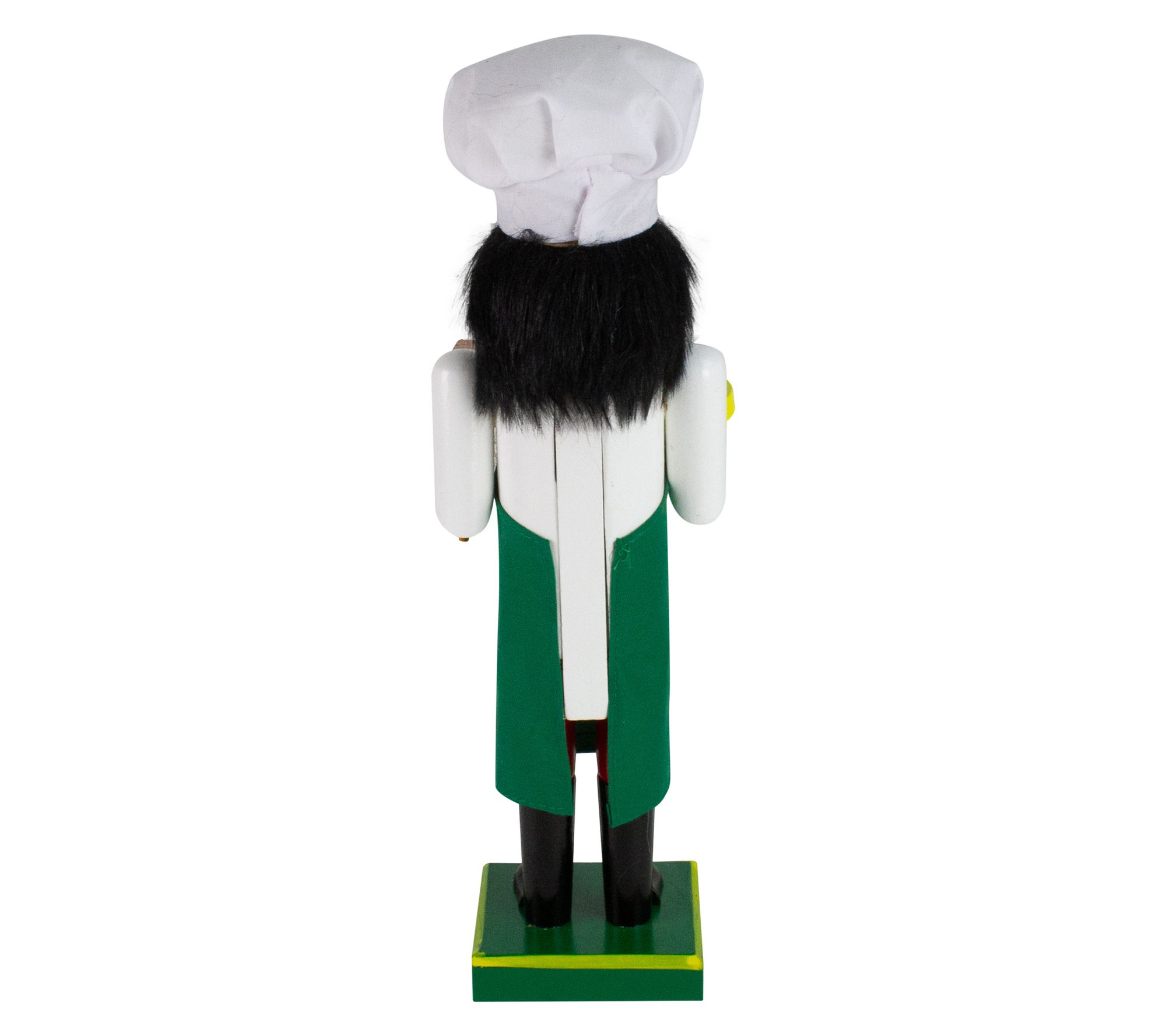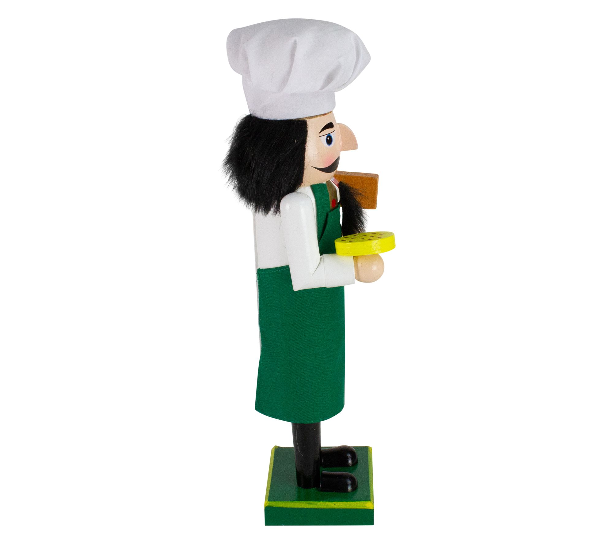 Craft a delightful holiday scene with this enchanting wooden nutcracker. Dressed in a vibrant green apron and classic white chef's hat, this pizza maker holds a tantalizing pizza and peel, offering a whimsical addition to your tabletop or mantel. Whether accentuating your holiday gatherings or serving as a cherished keepsake gift, it brings a playful charm to any festive setting. From Northlight.