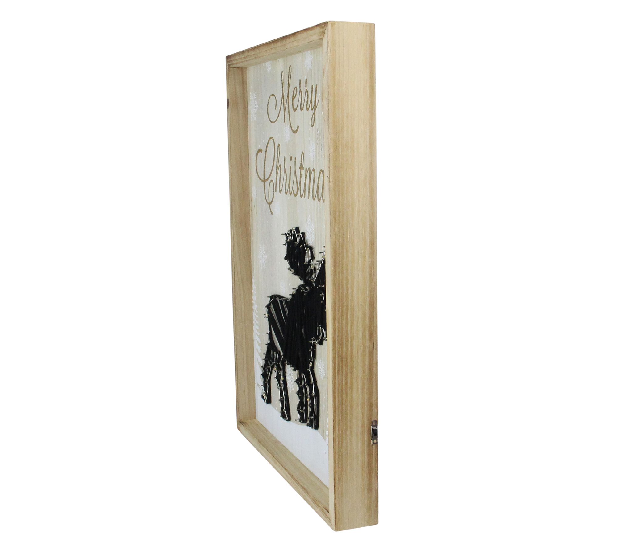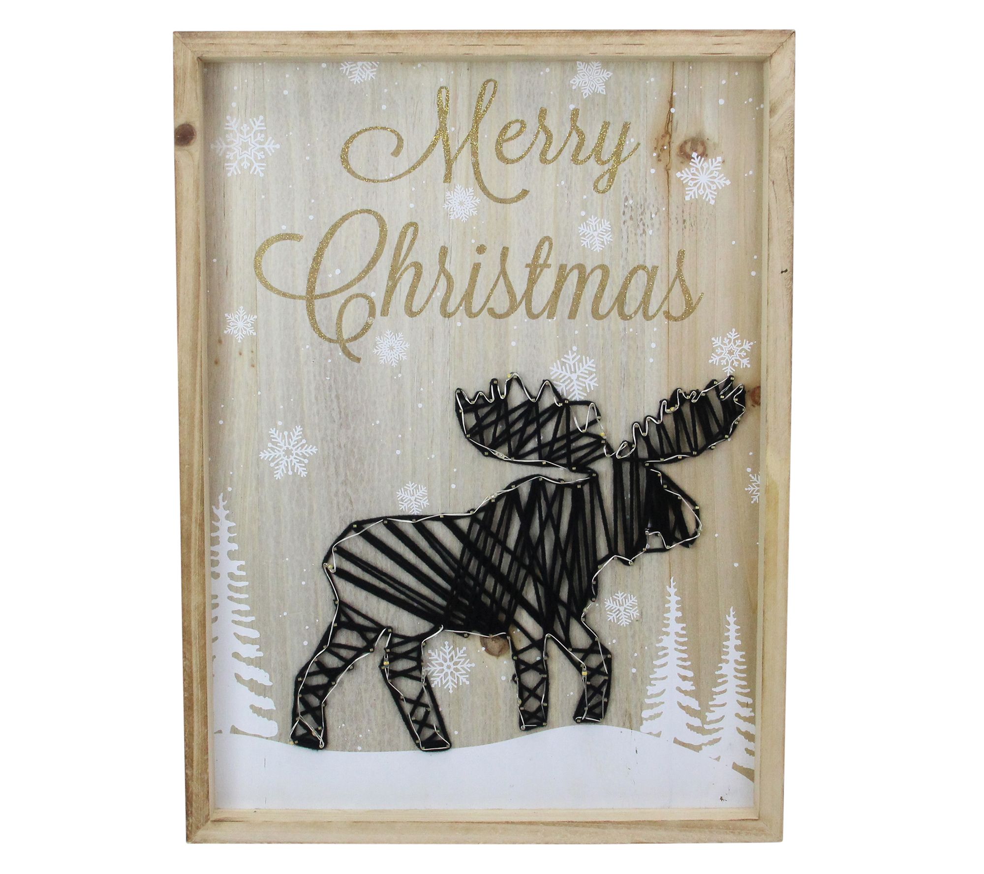 Adorn your wall with this festive touch that brings the wilderness charm indoors. This Christmas wall piece features a moose at the center, accented by white trees and shimmering snowflakes, all brilliantly illuminated by 14 LED lights. Perfect on a mantel or dresser, it becomes a visual centerpiece in your holiday decor. The convenient on/off switch allows easy moments of holiday cheer at any time. From Northlight.