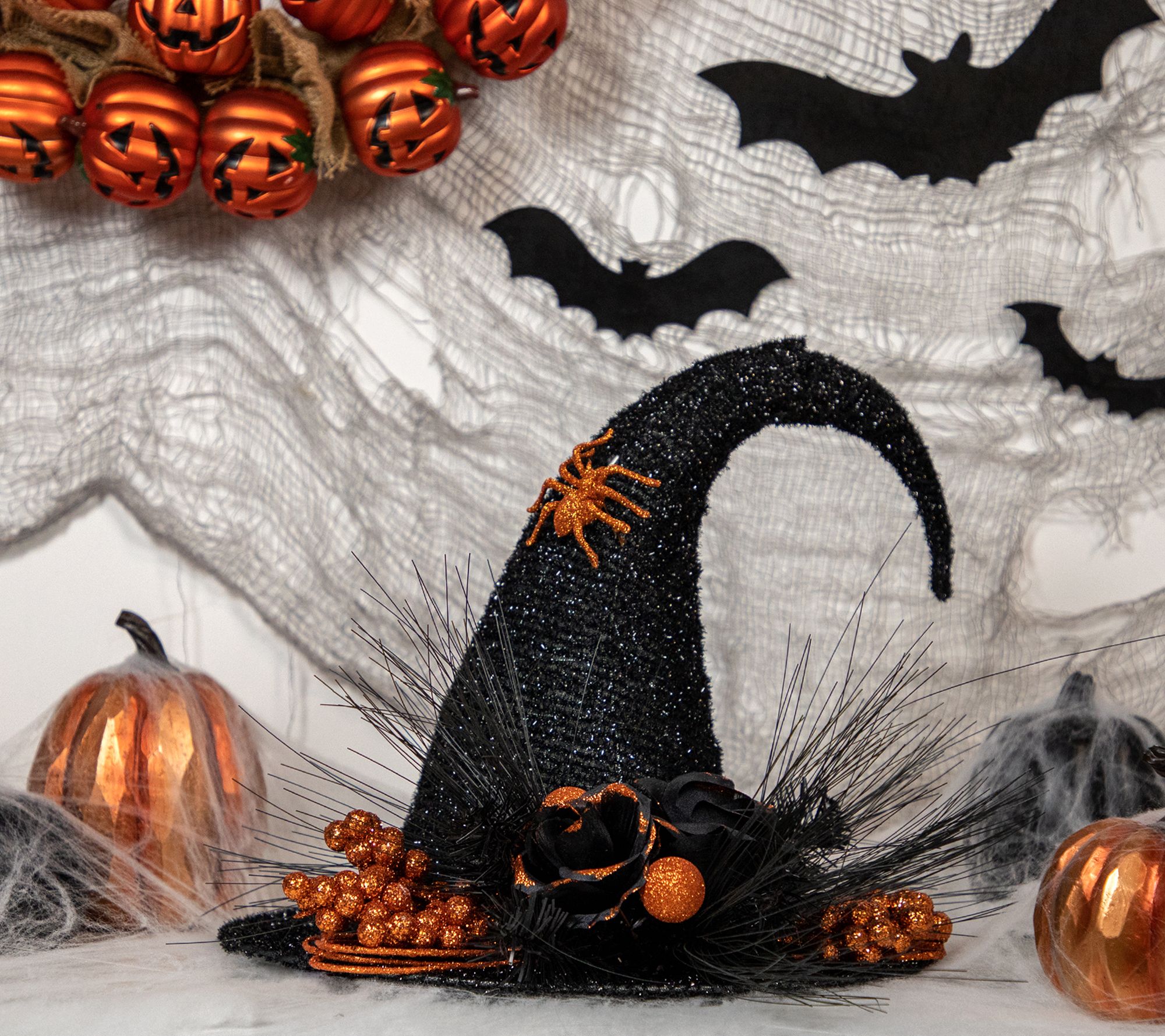 • Black tinsel witch''s hat adorned with glittered orange roses, berries, and spider