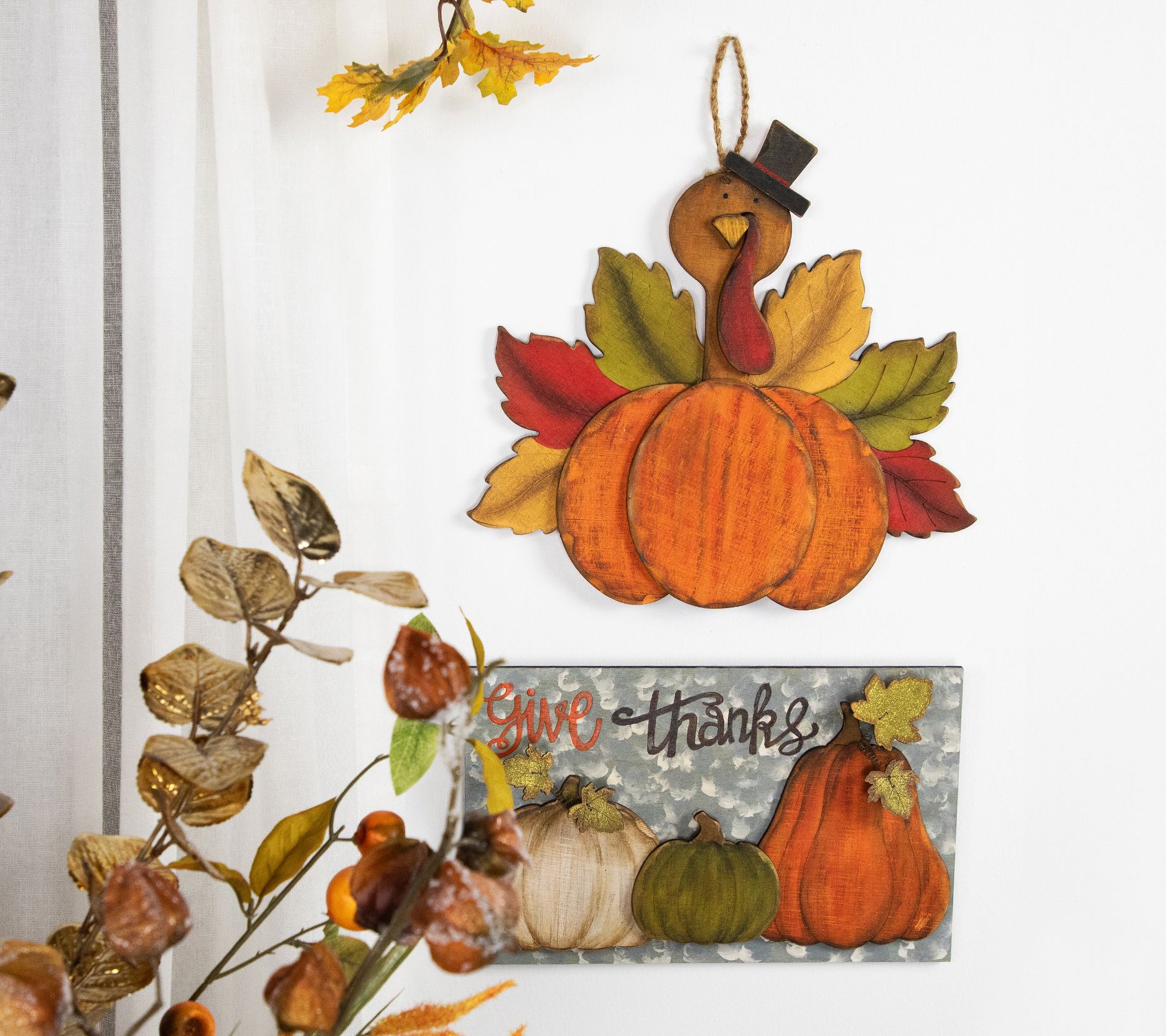 • Pumpkin-shaped wall sign with autumnal orange, green, and white colors