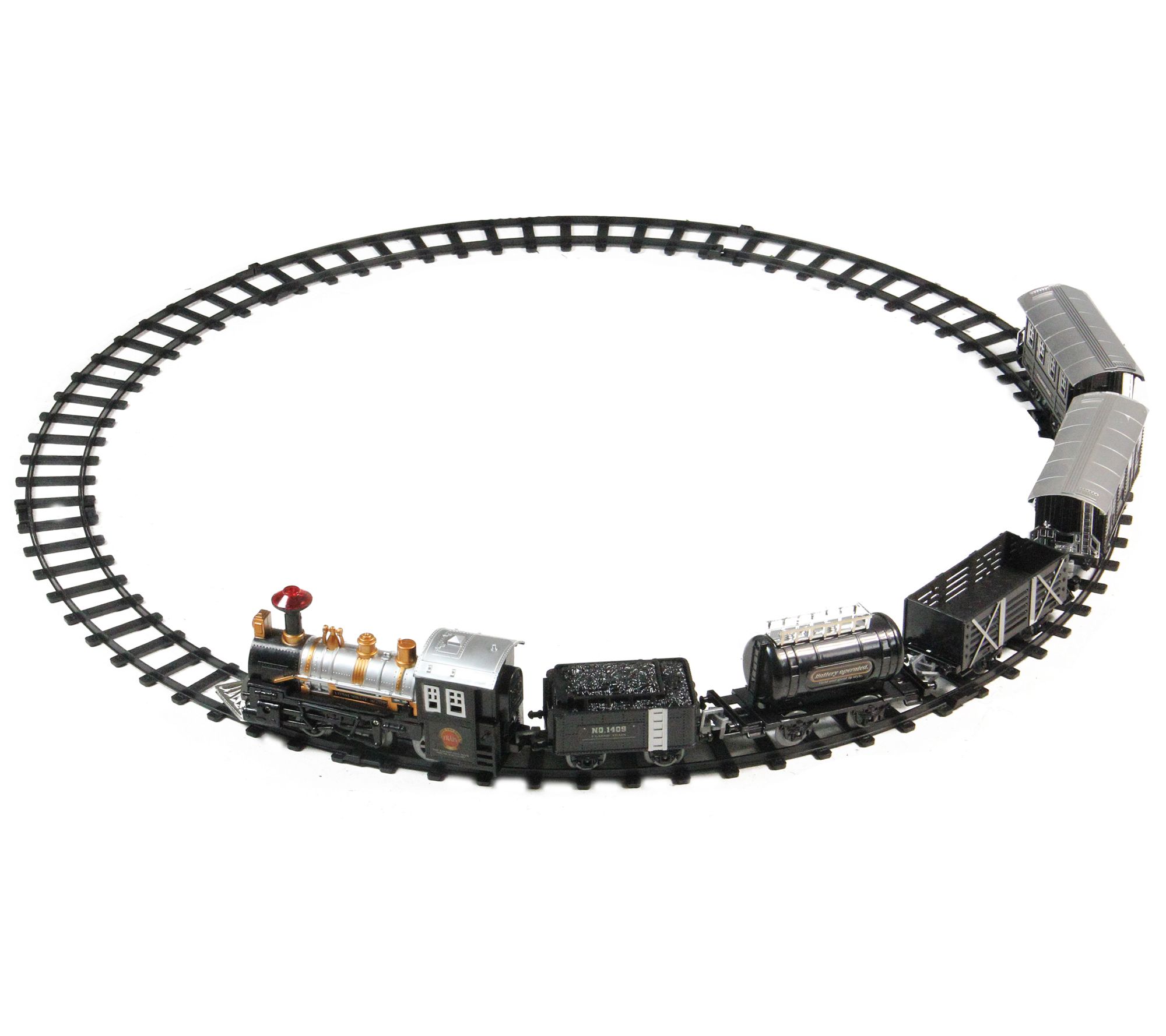 • Includes 11-piece track and six train cars: locomotive, coal tender, oil tanker, livestock car, passenger car, and caboose