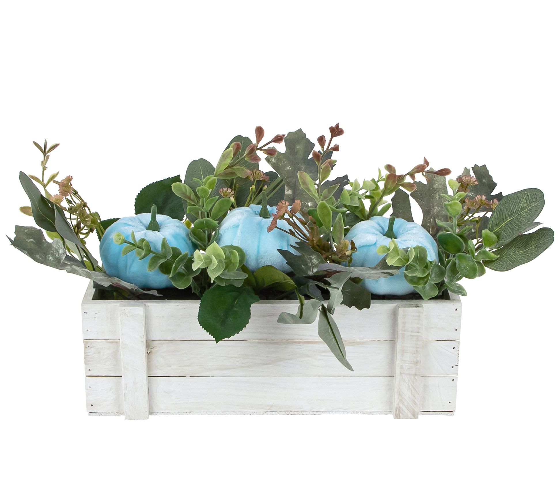 • Includes white distressed box with sky blue pumpkins accented with green foliage