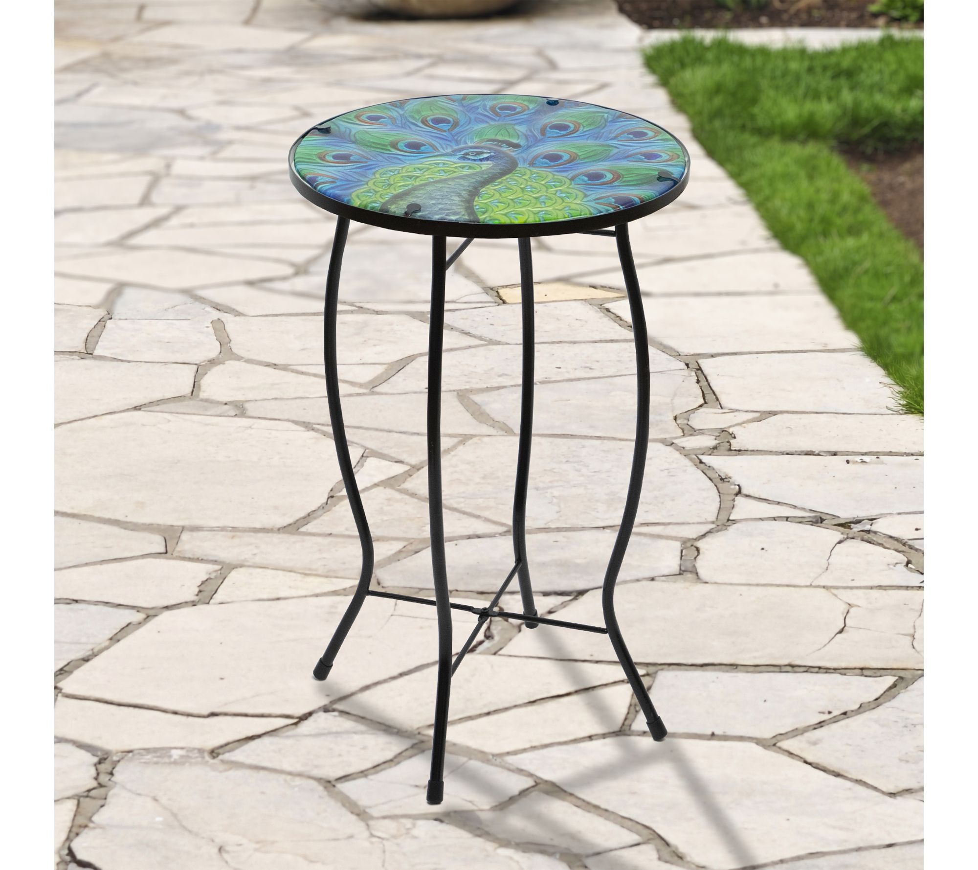 Brighten up your outdoor space with this vibrant glass patio side table, featuring a striking blue and green peacock design that brings a lively touch to any setting. Whether you're relaxing on the porch or entertaining in the garden, use the table to set down a drink, snack, or even your favorite potted plant. From Northlight.