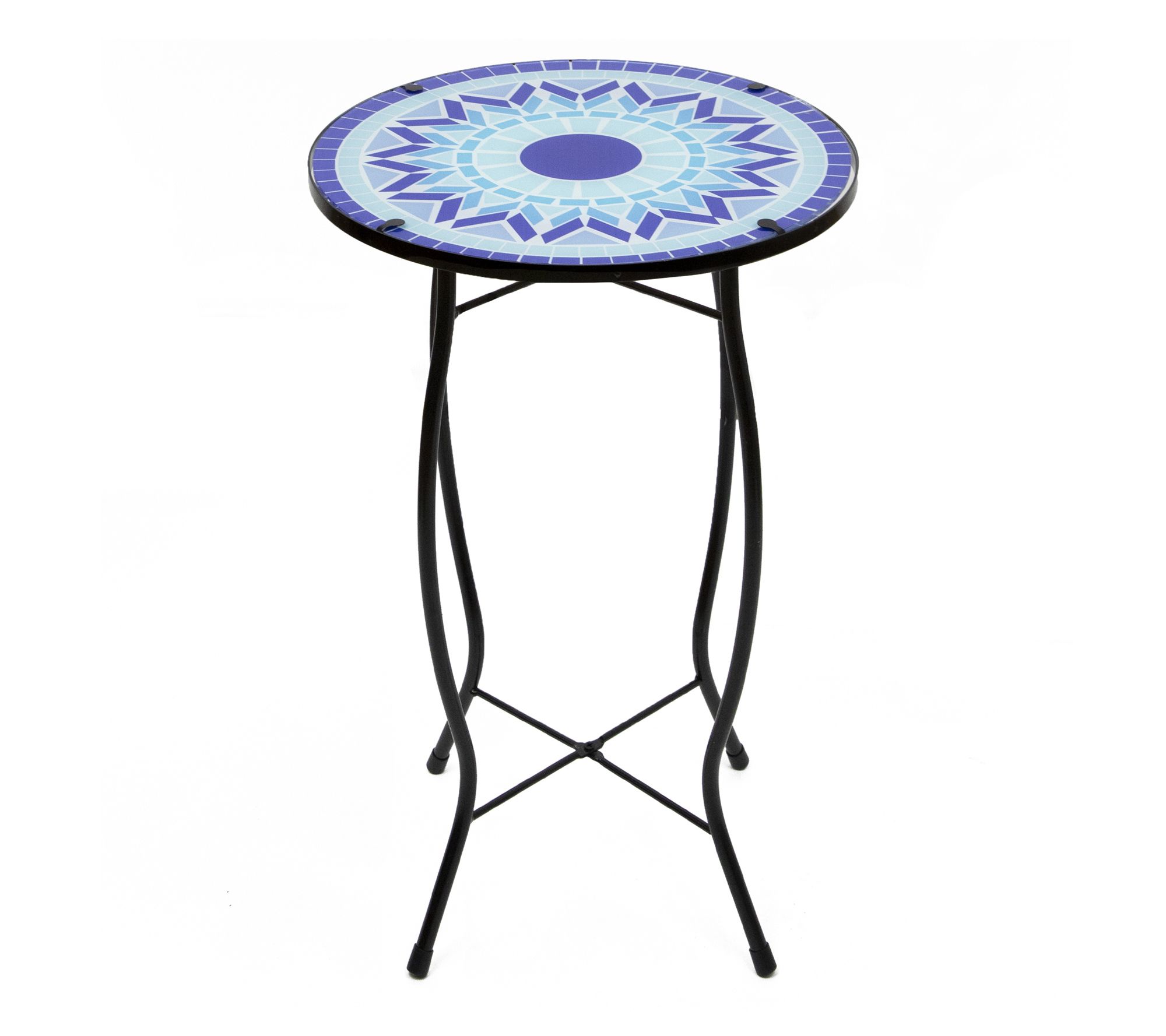 Bask in the warmth of outdoor gatherings with this patio side table, featuring a striking blue sun mosaic design that instantly brightens your garden, porch, or balcony. Sturdy black metal legs provide stable support, making it ideal for holding drinks, snacks, or a favorite potted plant while you relax outdoors. From Northlight.
