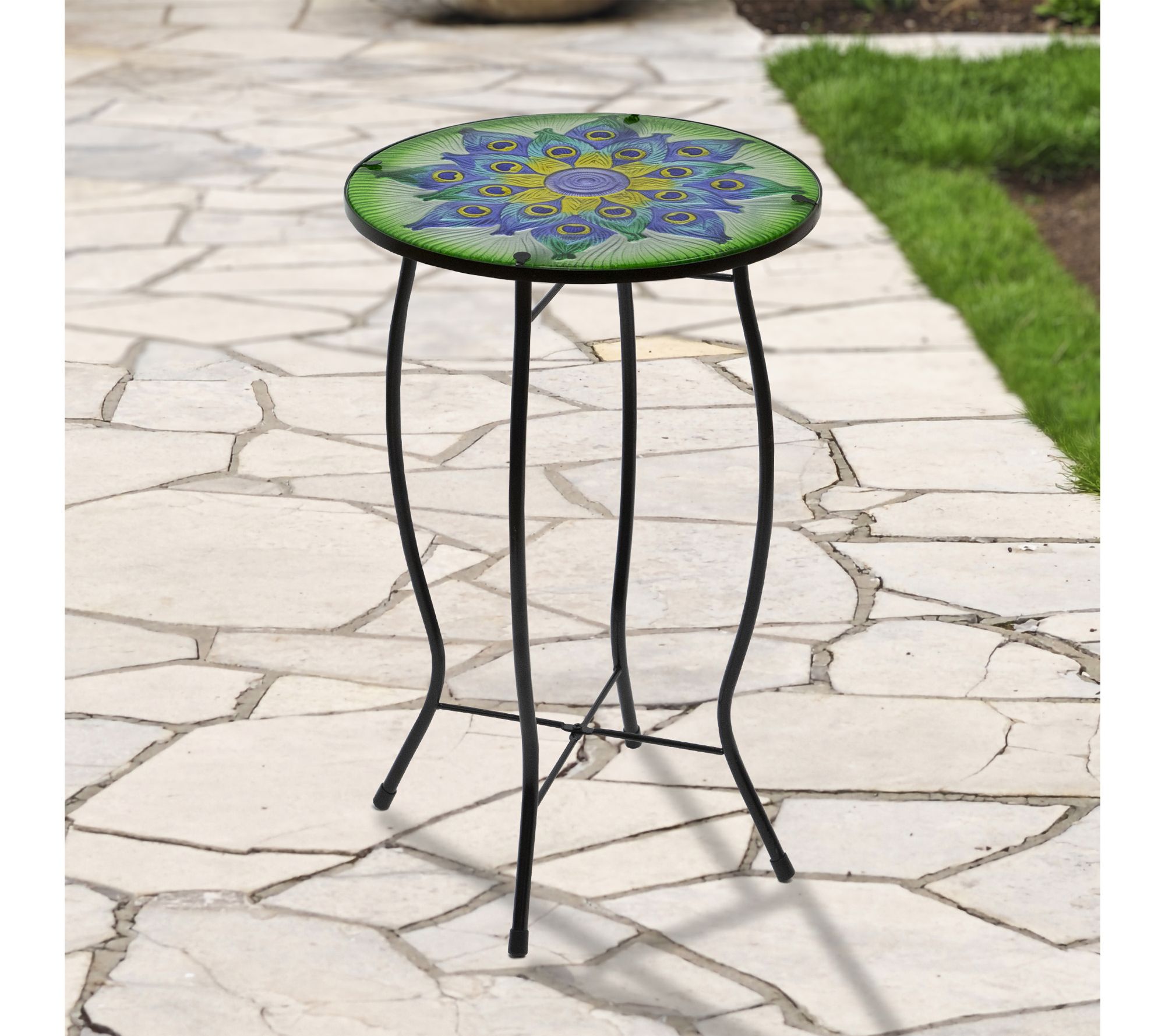 Bring vibrant color and charm to your outdoor space with this peacock glass patio side table. The blue and green feather design paired with sturdy black metal legs complements your garden seating, offering the perfect spot for refreshments, a book, or your favorite plant during those relaxing afternoons outside. From Northlight.