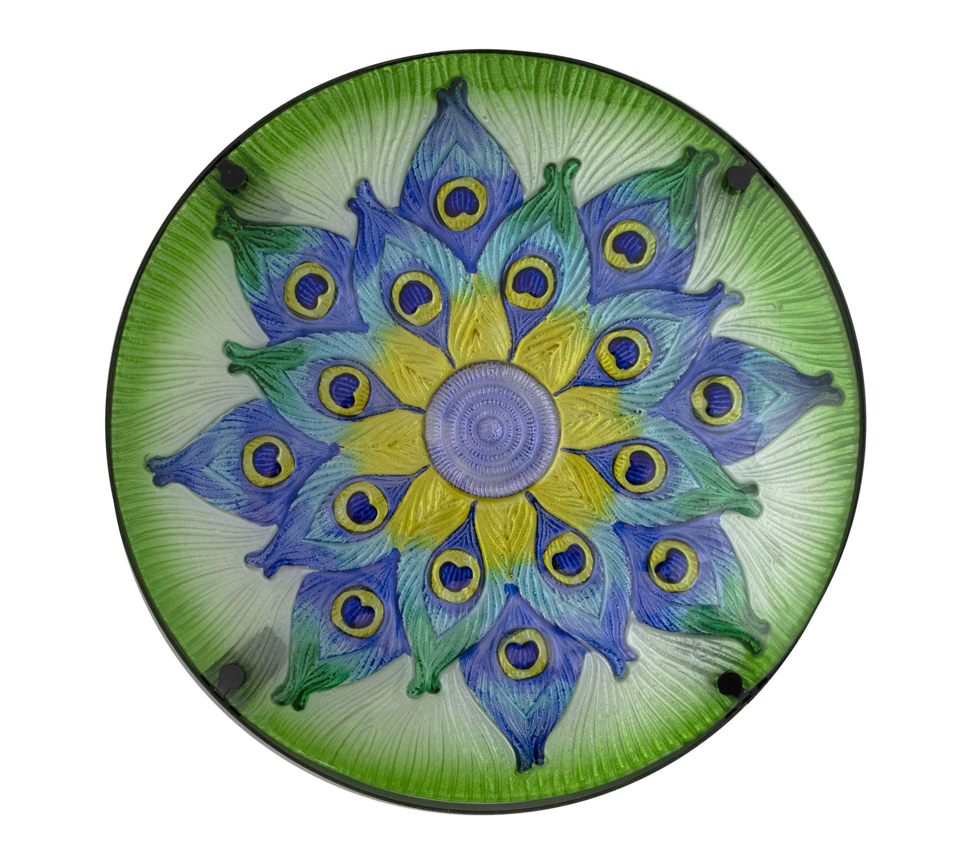 • Features a peacock-inspired blue and green floral glass top