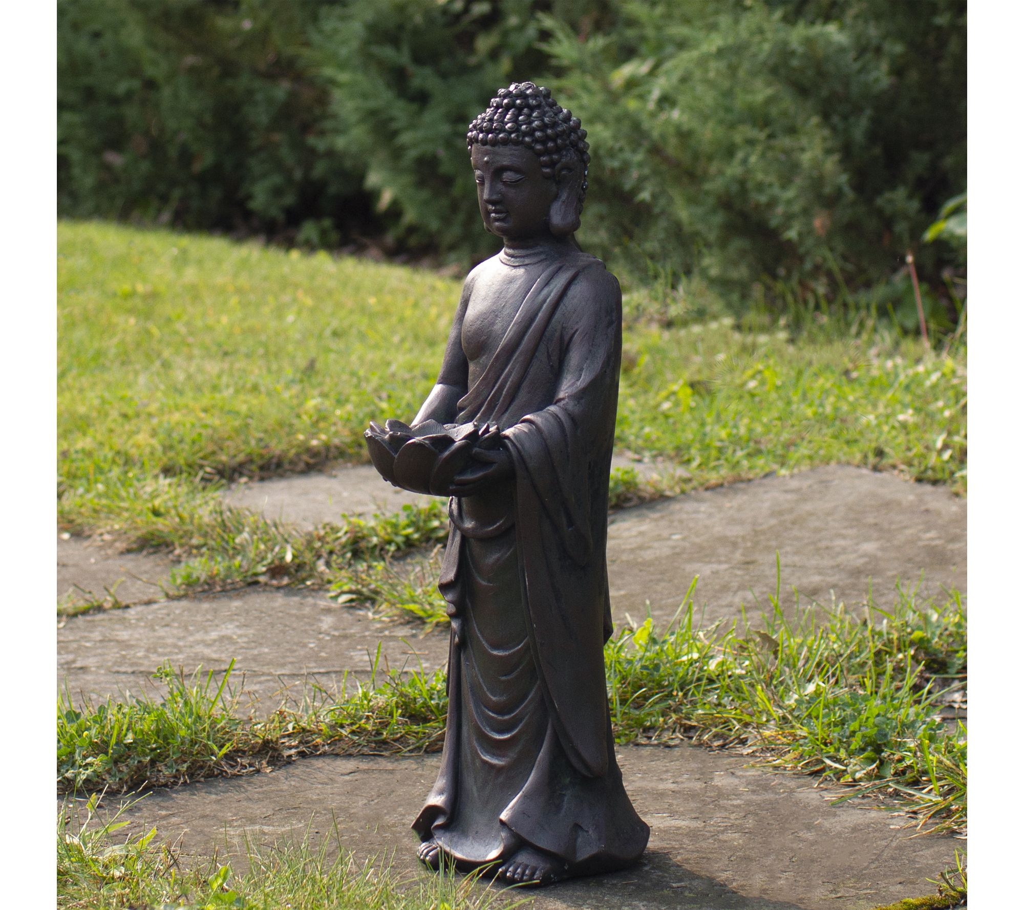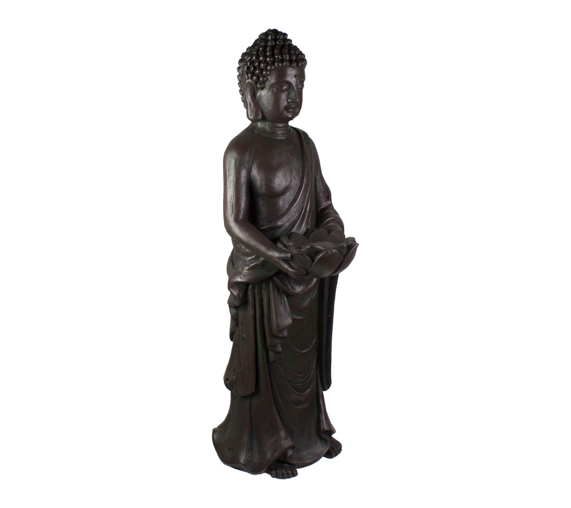 • Polyresin standing Buddha garden statue holding a lotus flower
