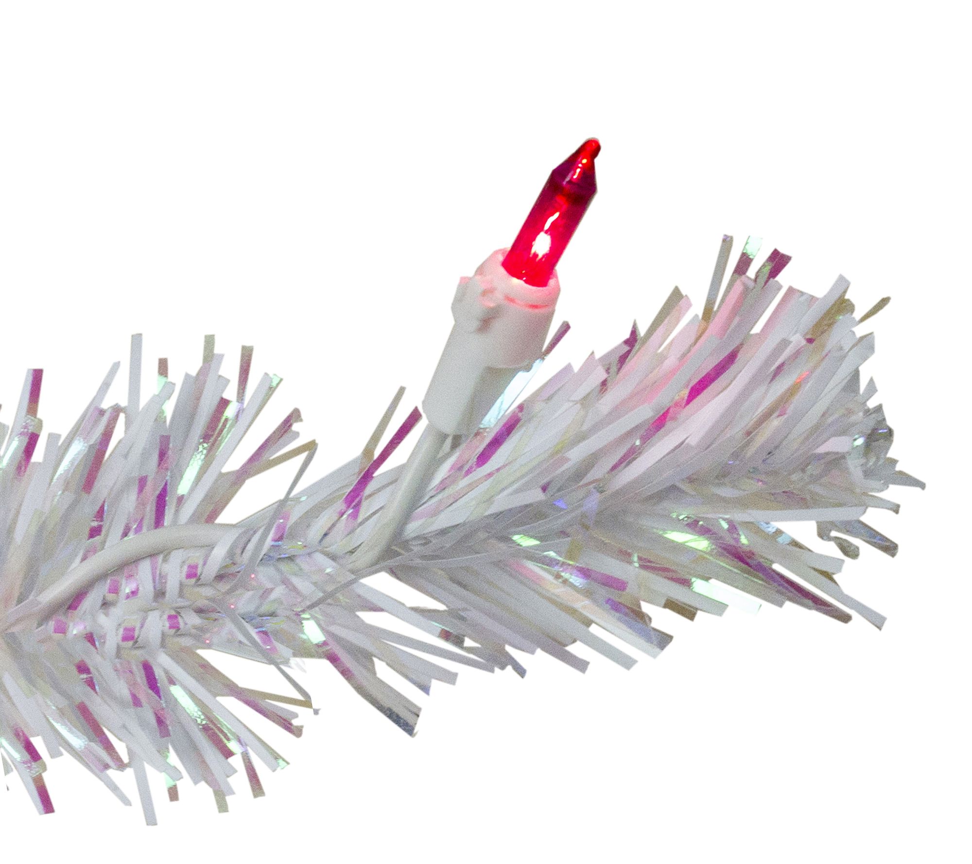 Pint-sized holiday magic that adds pizazz to your seasonal display, this artificial tree showcases white branches, iridescent tinsel, a slim profile, and bright pink lights for an extra dash of fun. From Northlight.