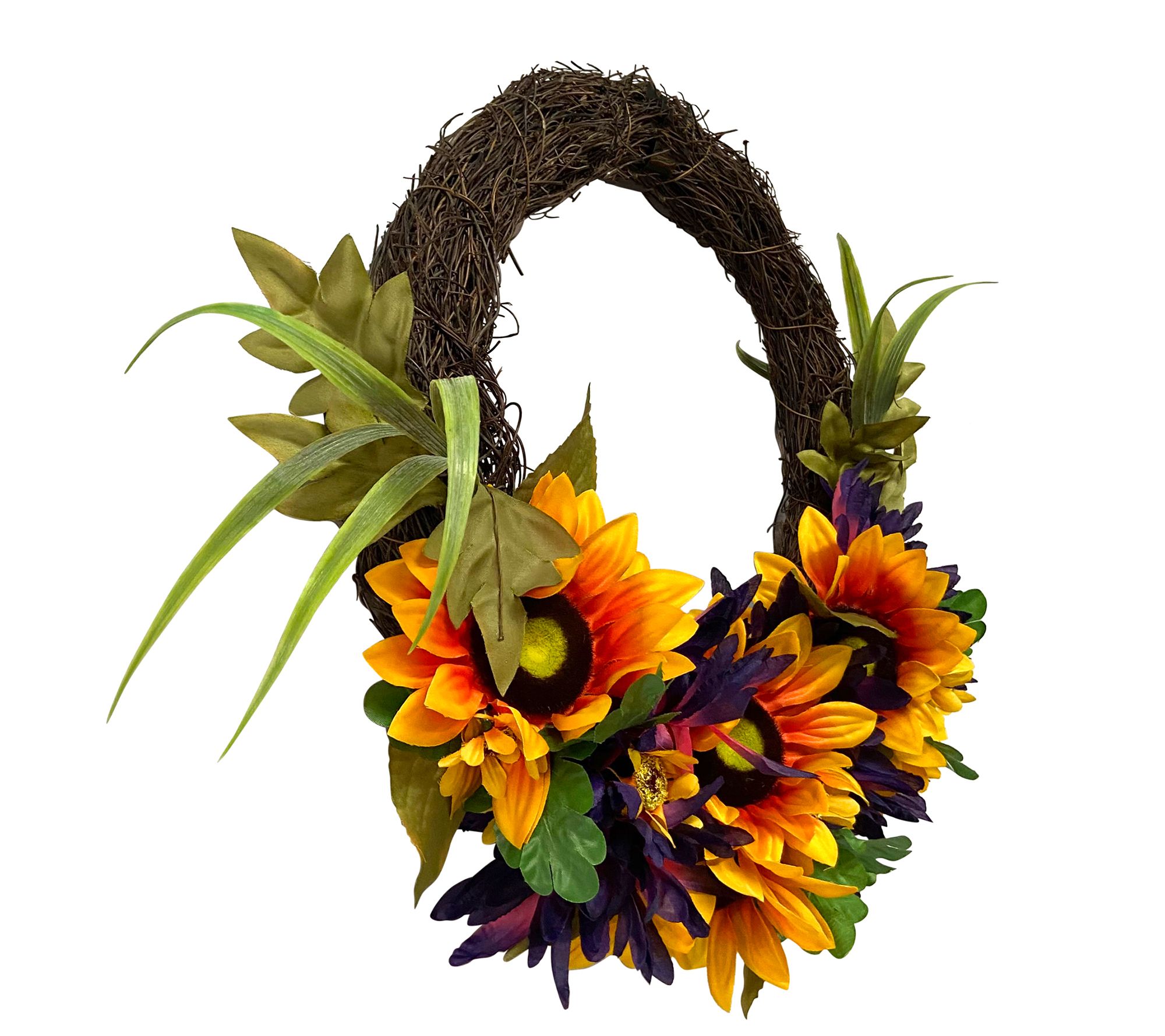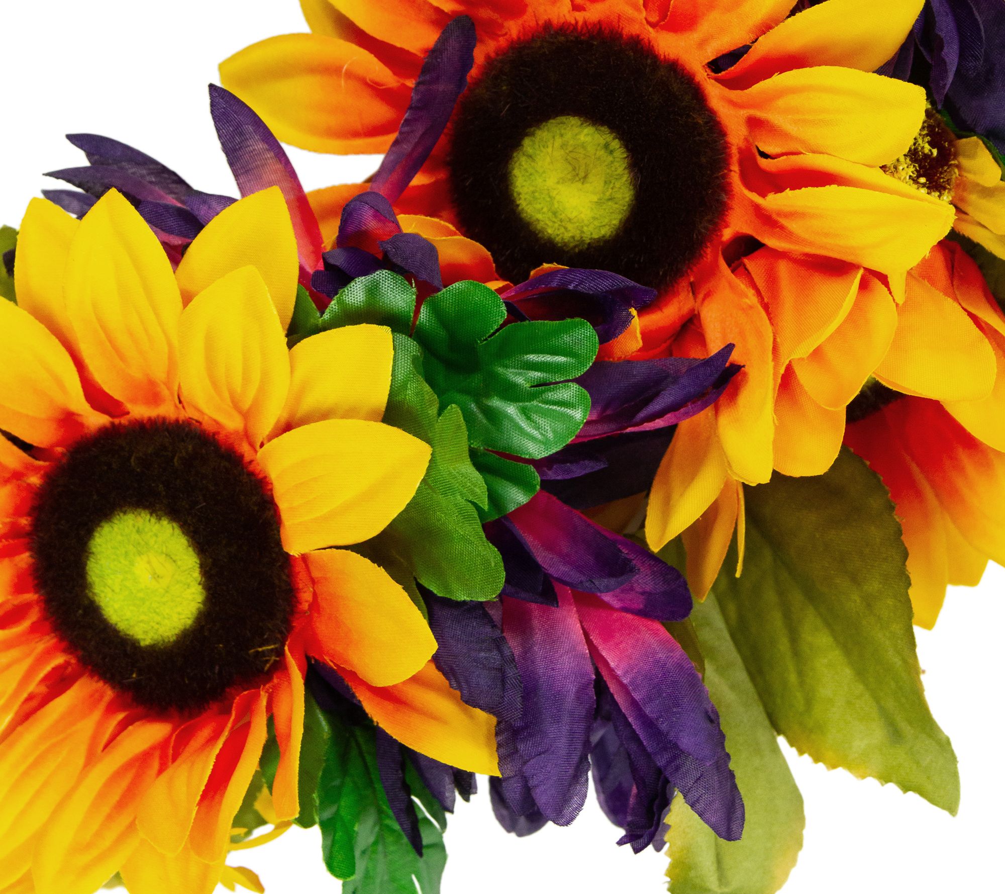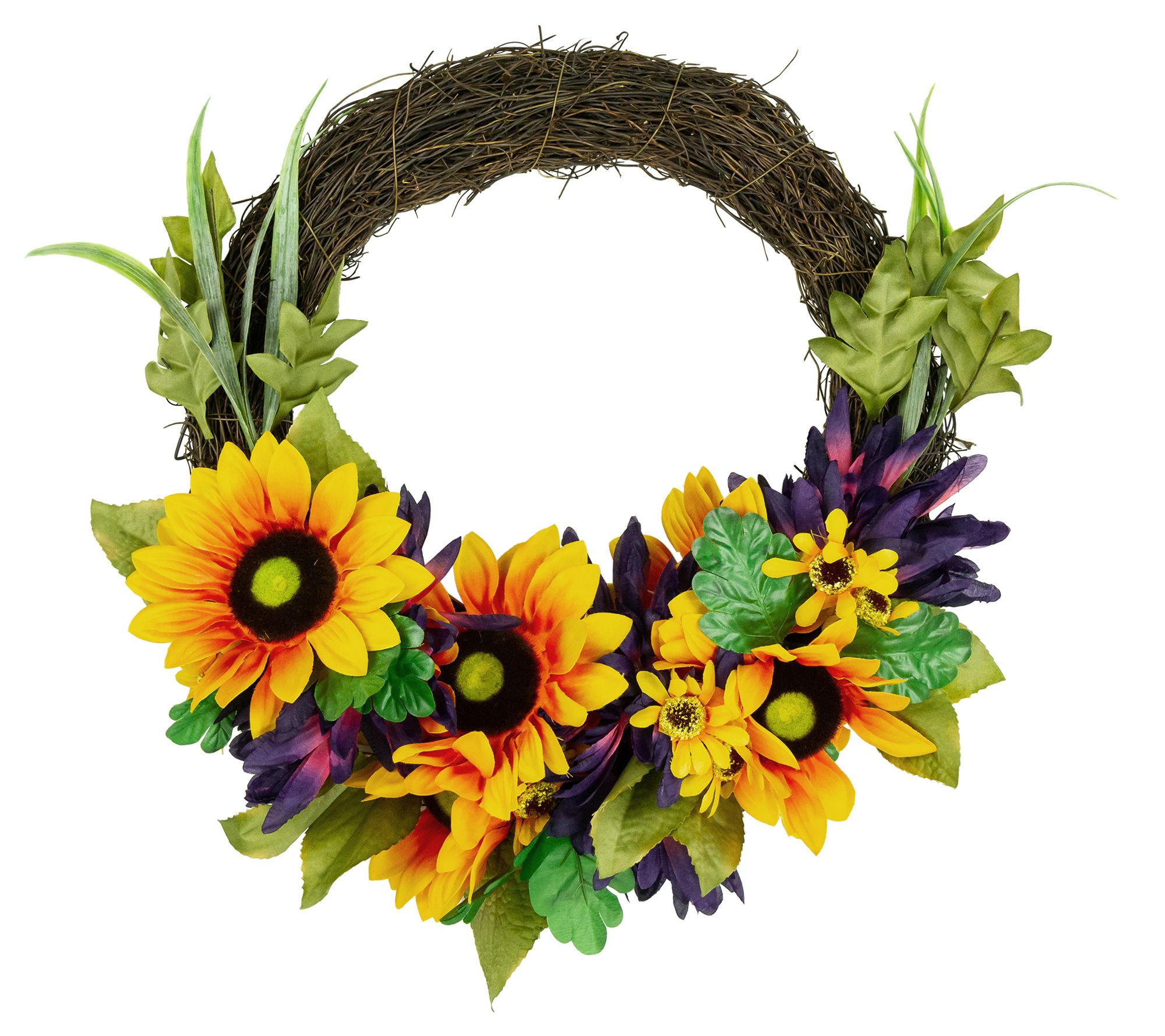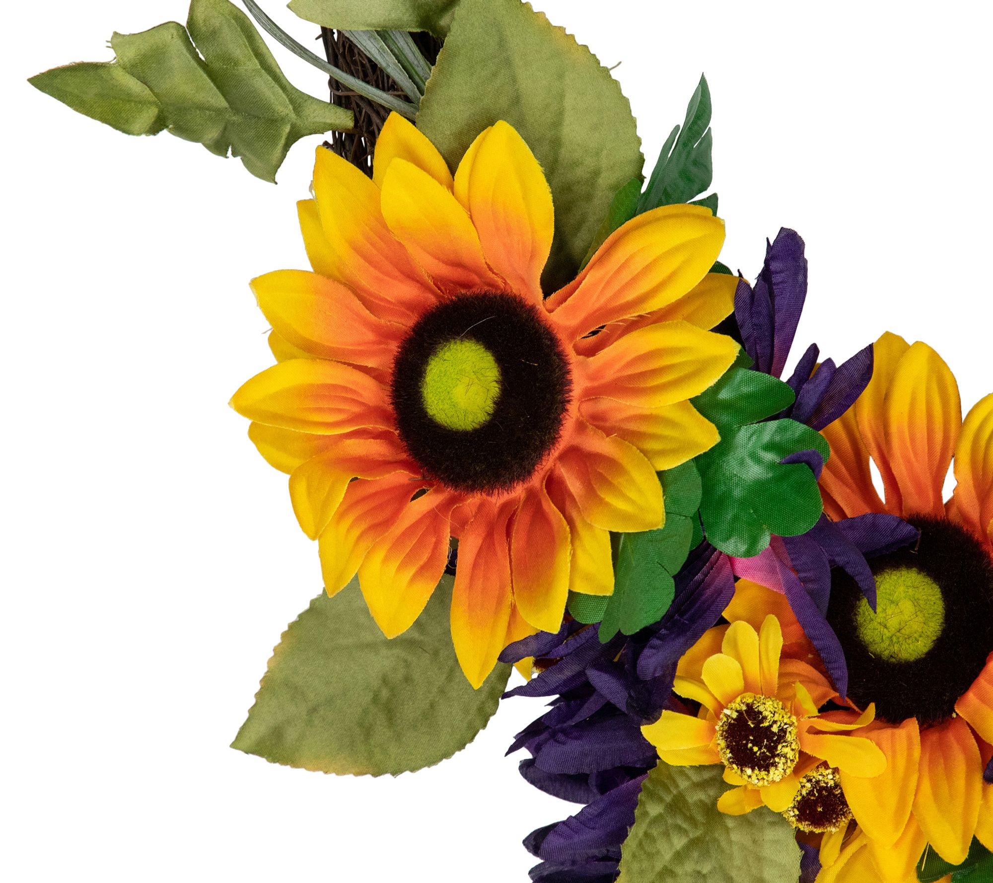 Welcome guests to your home with this half-floral wreath featuring sunflowers and mums in a cheerful palette. From Northlight.