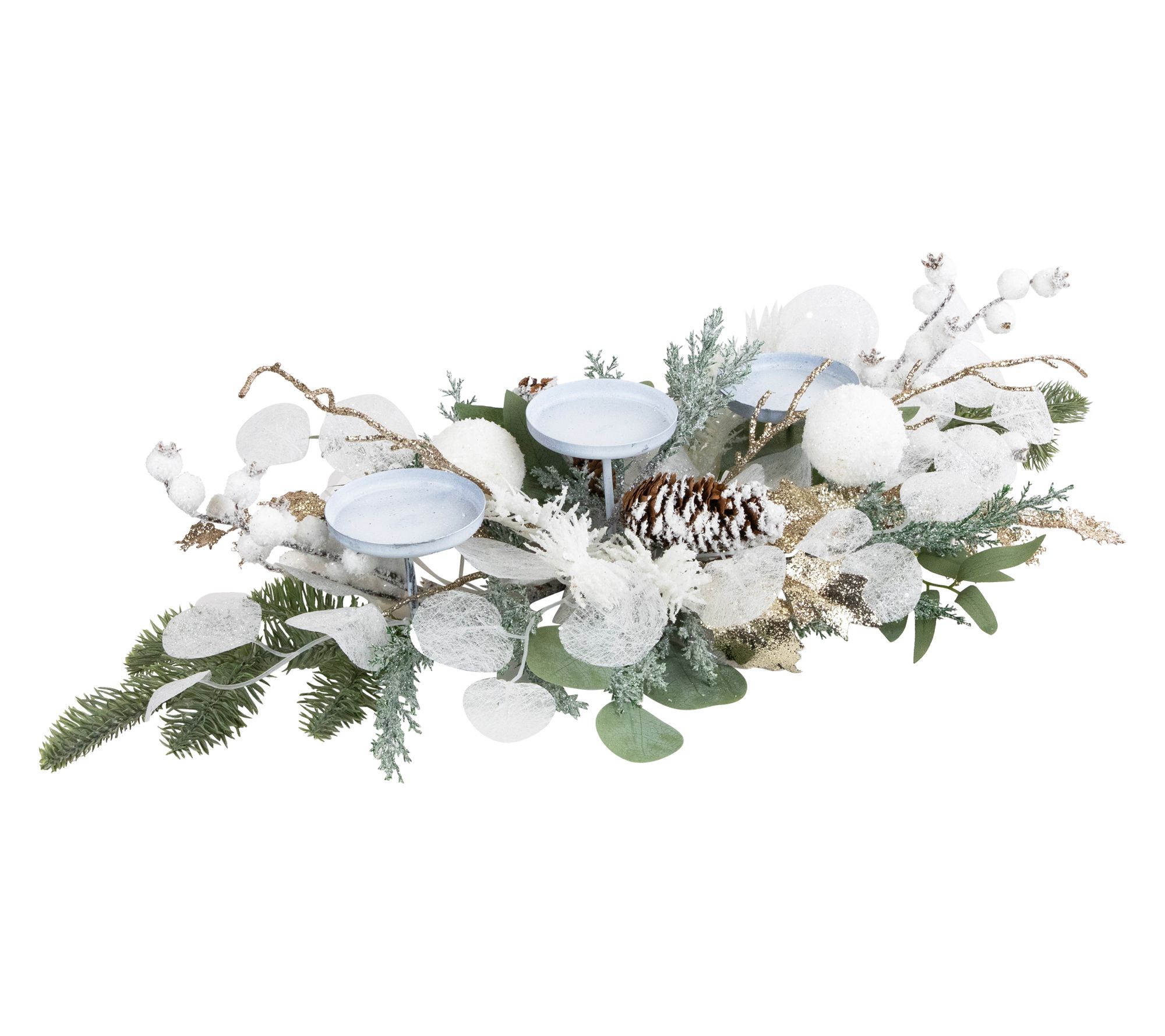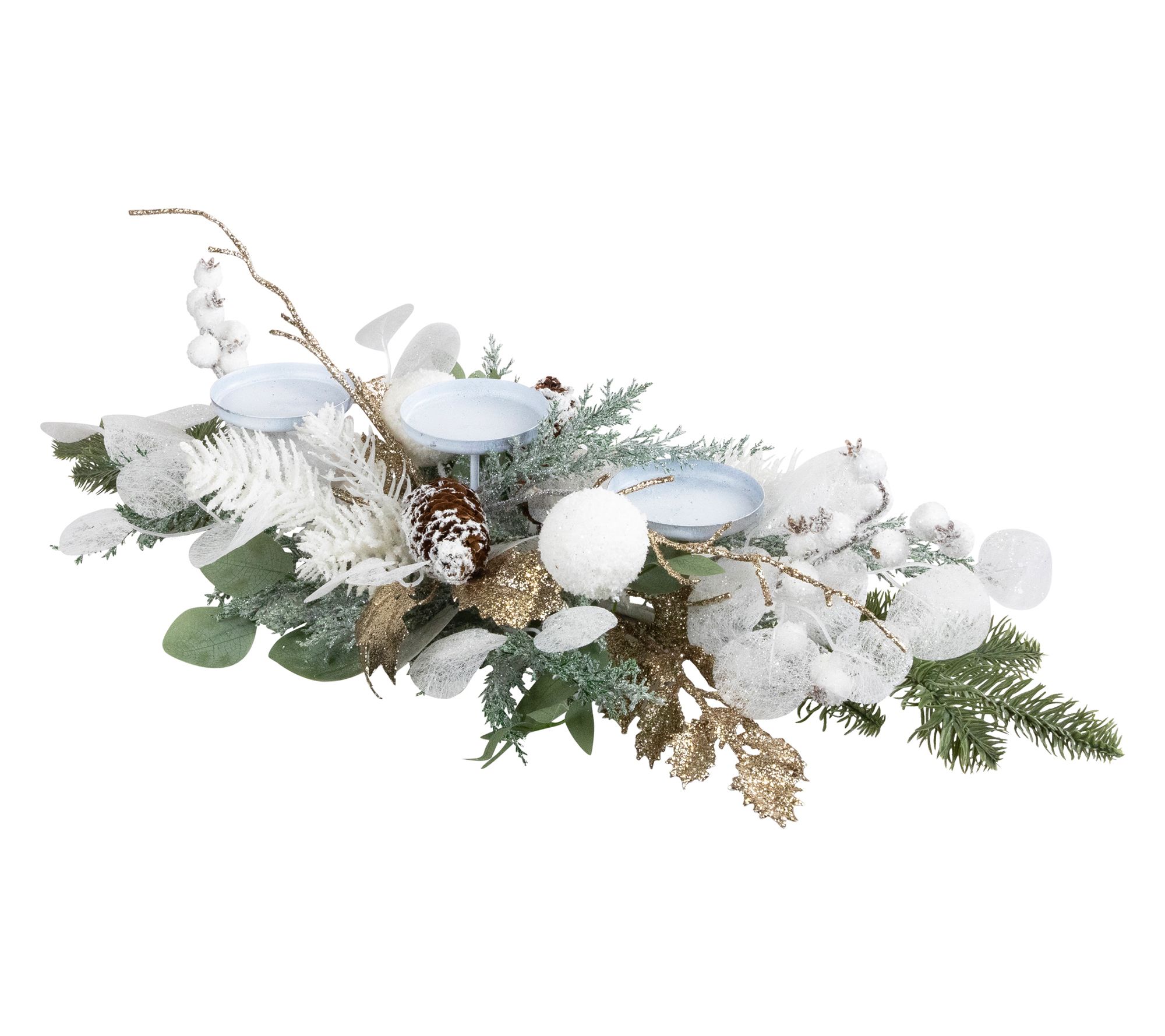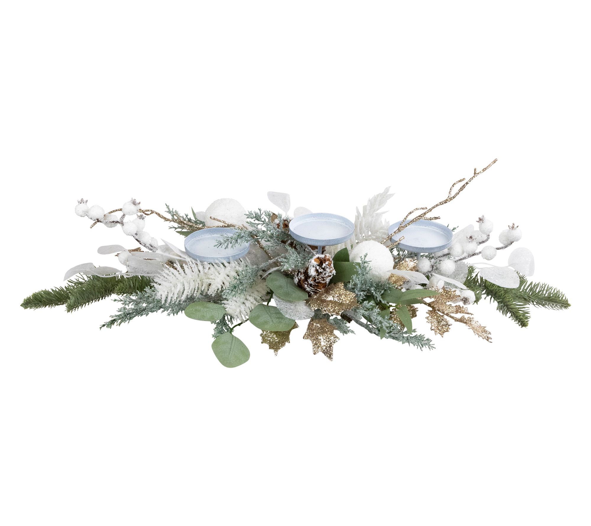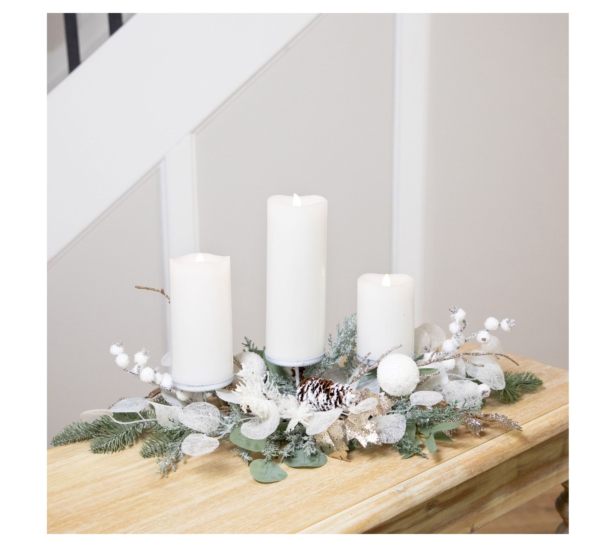Envision your home basking in the radiance of holiday cheer with this exquisite pillar candle holder. This centerpiece artfully blends lifelike winter greenery, embellished with white berries, goldtone holly leaves, pinecones, and shimmering ball ornaments, each element adding a sparkle reminiscent of a winter wonderland. Designed to embrace the soft glow of three flameless pillar candles (not included), this piece invites warmth and festive delight into your space. From Northlight.