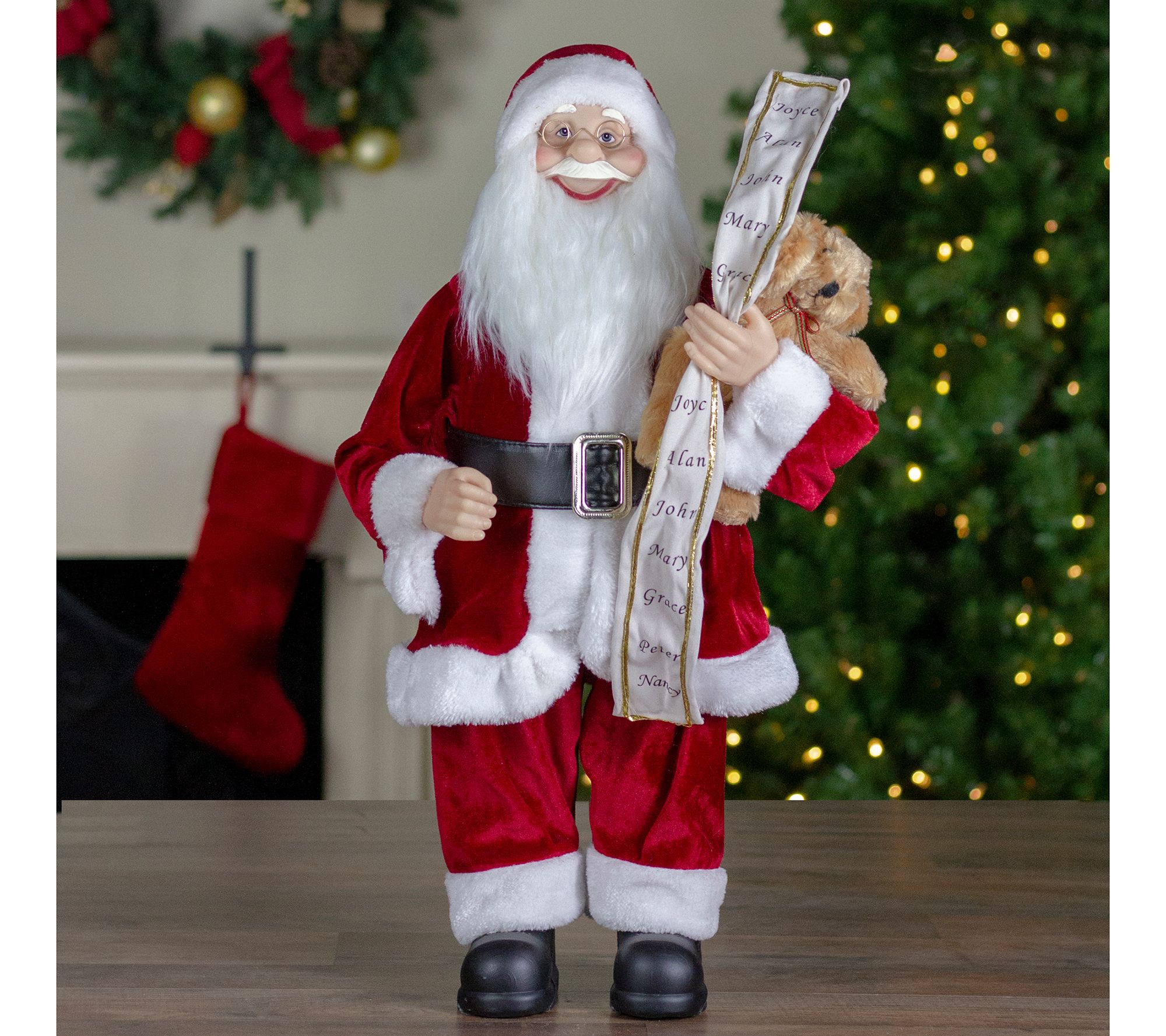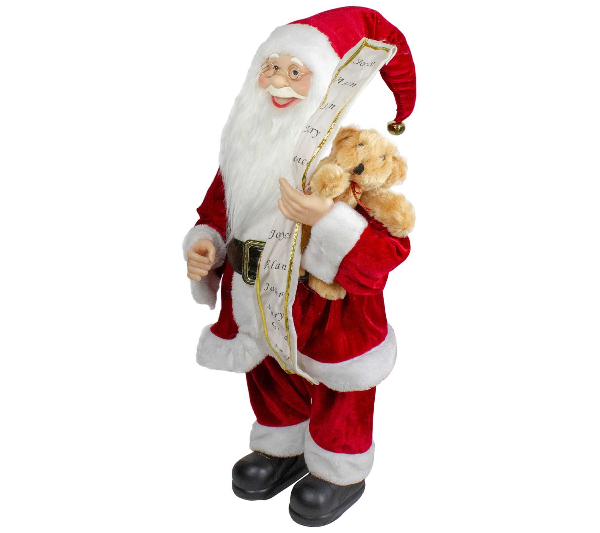Holding his famous list and a cuddly teddy bear, this freestanding Santa is dressed in his best red and white suit, and he's ready to greet your guests with a smile. From Northlight.