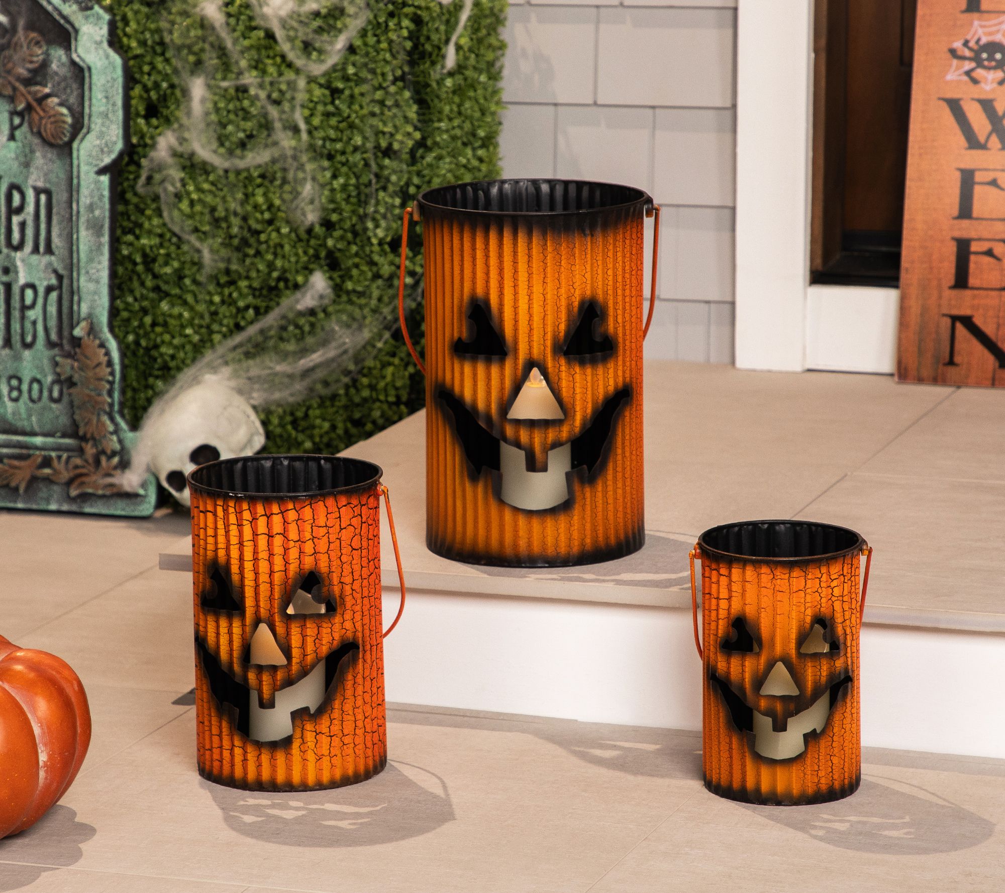 Add a spooktacular touch to your Halloween decor with the Northlight metal pumpkin lantern set. Featuring a crackled orange paint finish and traditional jack-o-lantern smiles, these three lanterns are perfect for creating a festive atmosphere both indoors and outdoors. Nest them for easy storage when not in use. From Northlight.