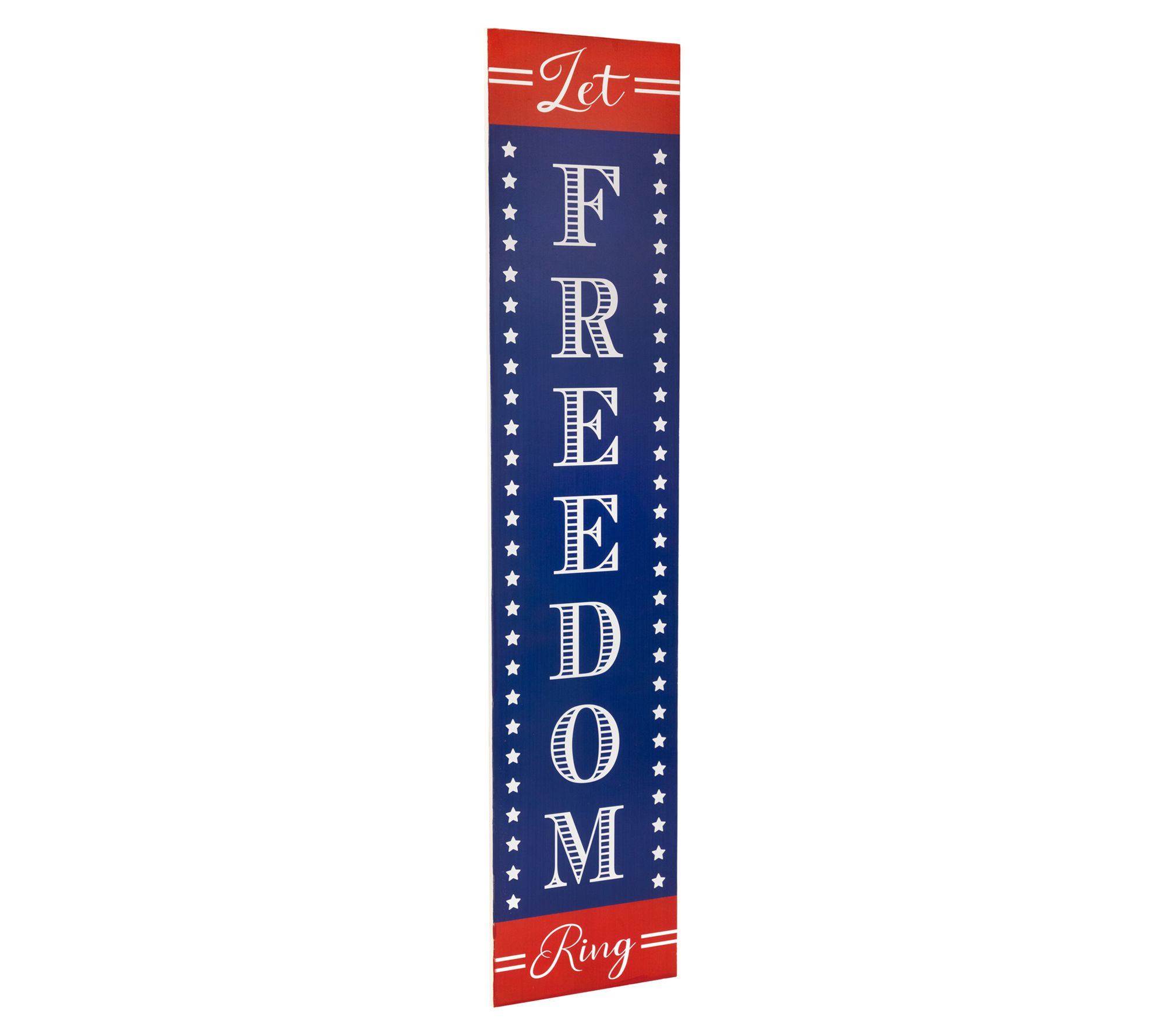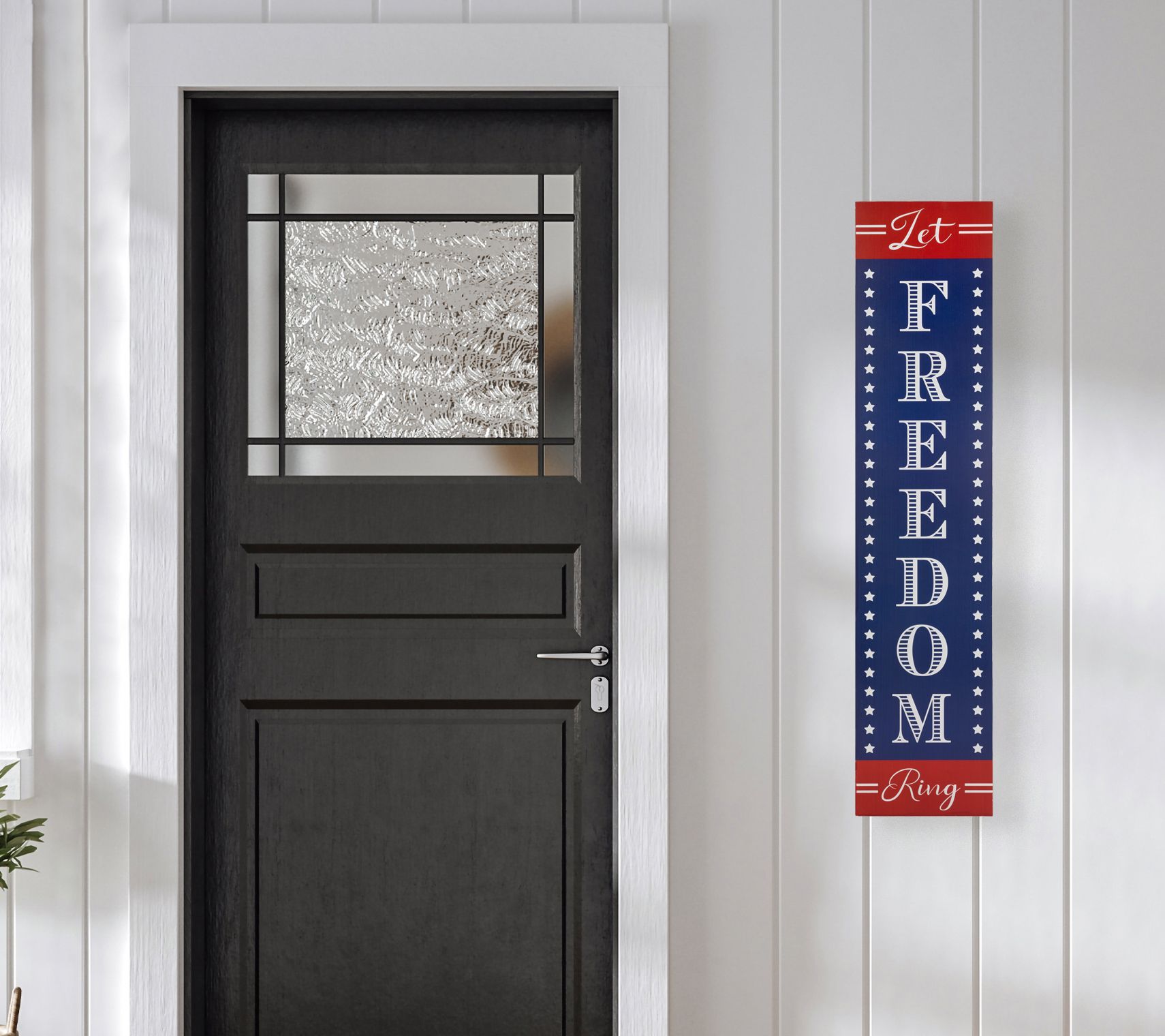 Celebrate the spirit of freedom with this patriotic wooden wall sign. This vibrant piece features bold red and blue hues, accented with white stars and "Let freedom ring" in striking white lettering. Perfect for adding a touch of Americana to any room, this plaque inspires pride and unity. From Northlight.