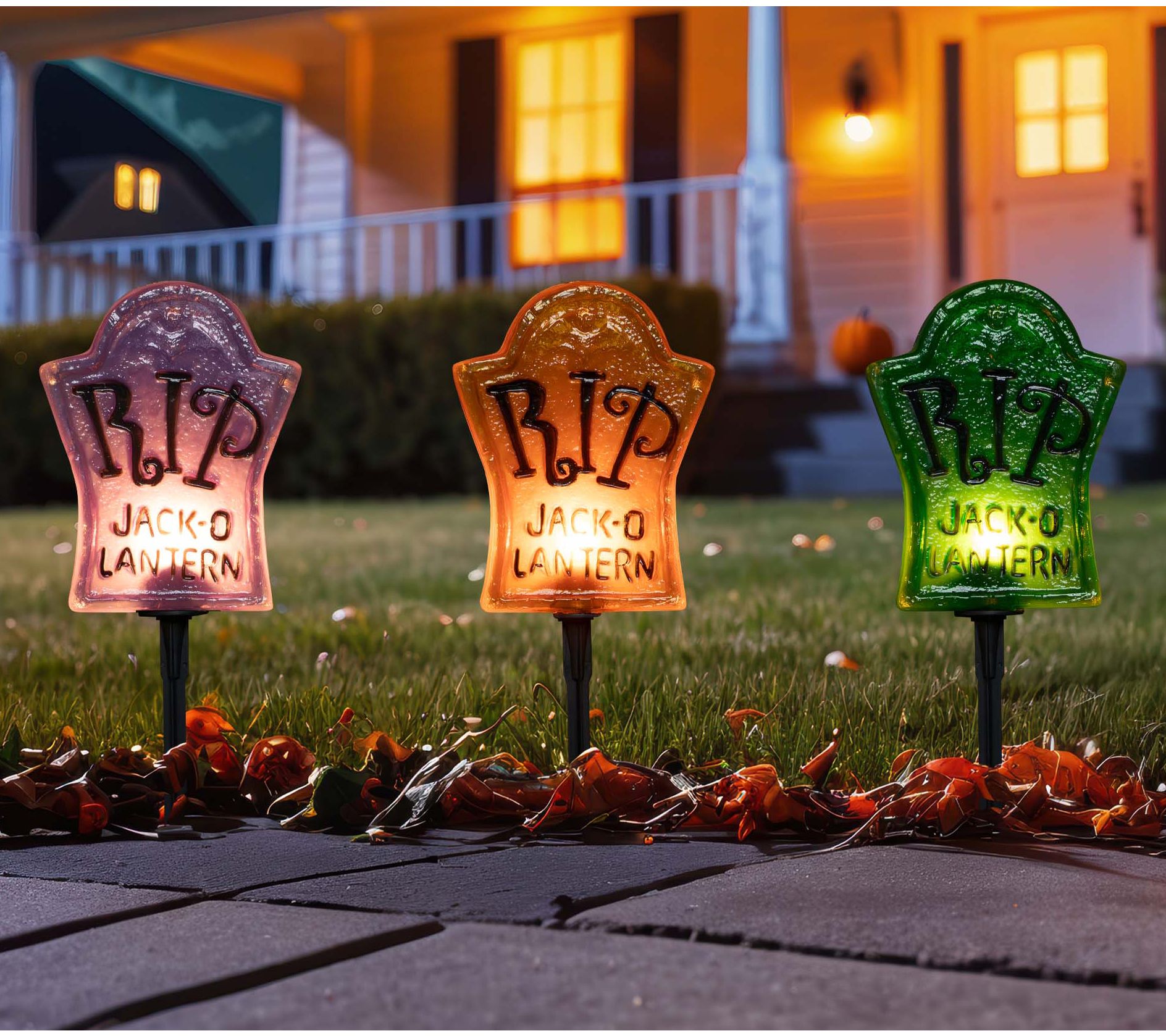 • Includes three-piece tombstone Halloween pathway markers, 10 ground stakes