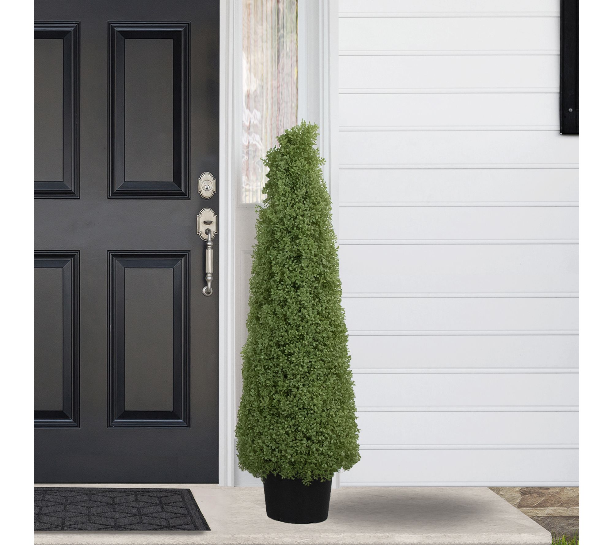 • Artificial boxwood cone topiary tree in weighted black round pot