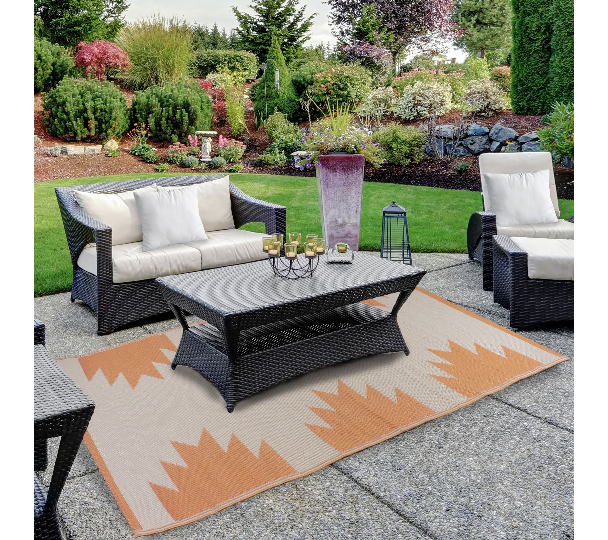 Brighten up your favorite gathering space with this area rug featuring a vibrant orange and beige Southwestern print and a delightfully textured weave that feels soft underfoot. Whether placed beneath your outdoor seating set, in a high-traffic entryway, or along your backyard patio, its durable flat weave design withstands color fading and resists mold and mildew, so you're always ready to entertain. From Northlight.