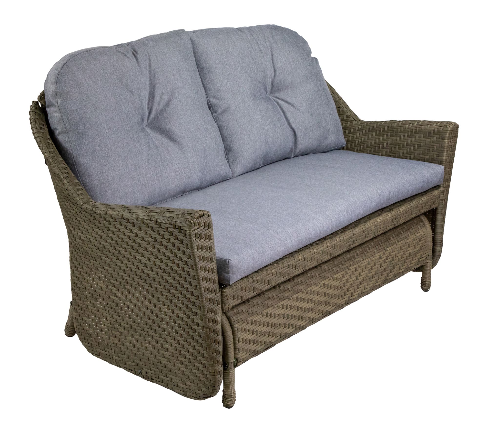 • Taupe gray resin wicker double glider with plush gray seat and back cushions