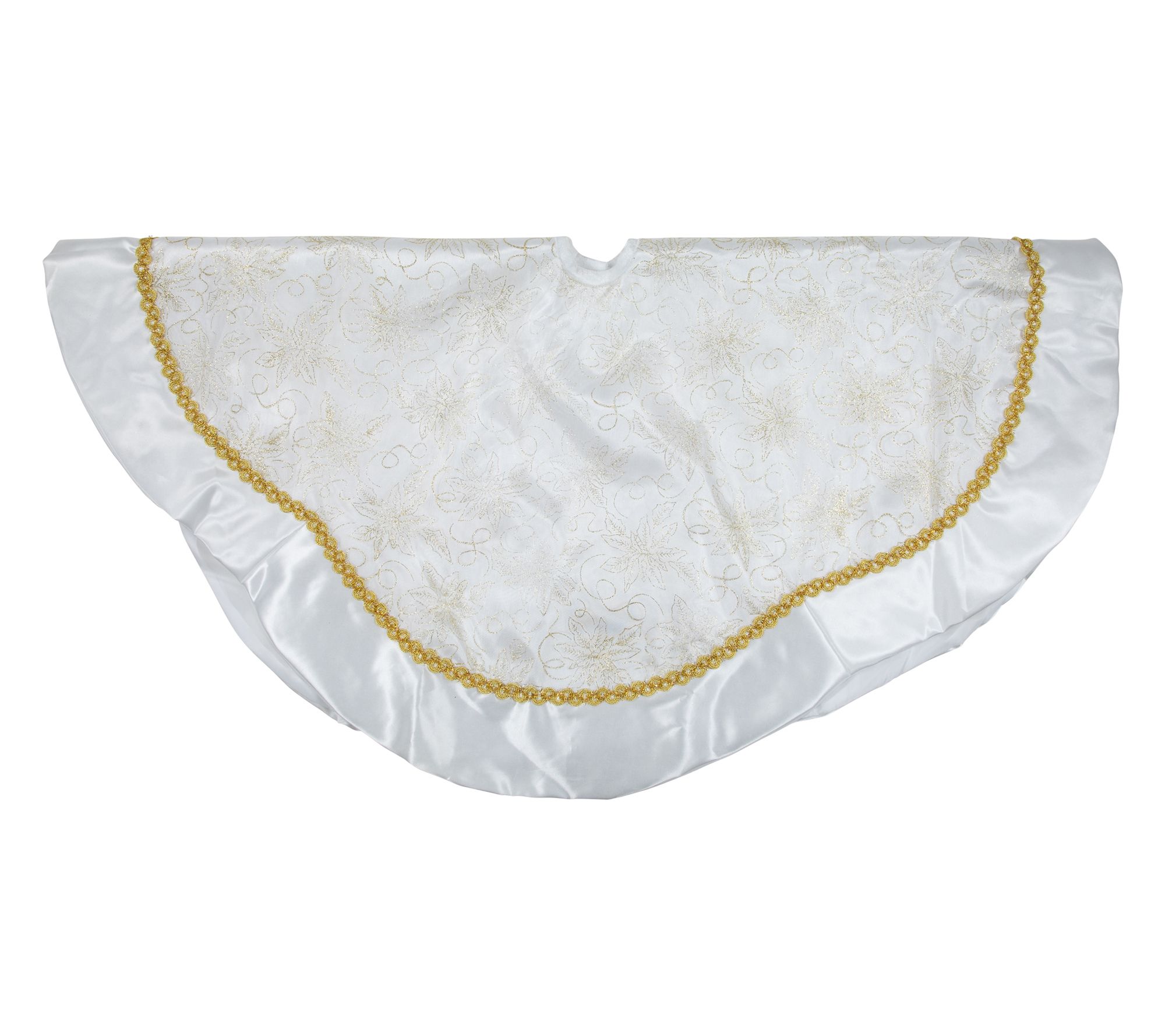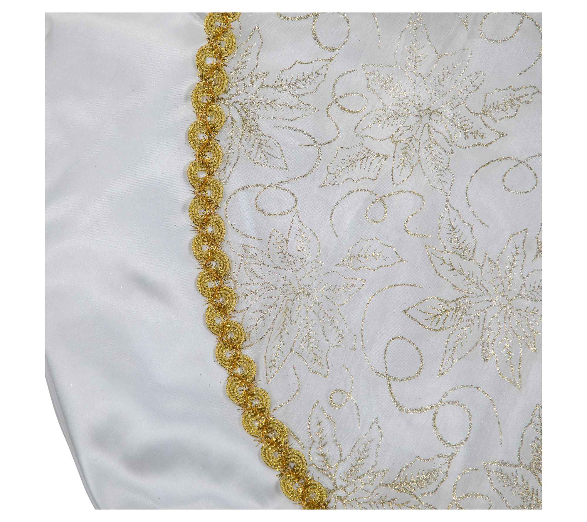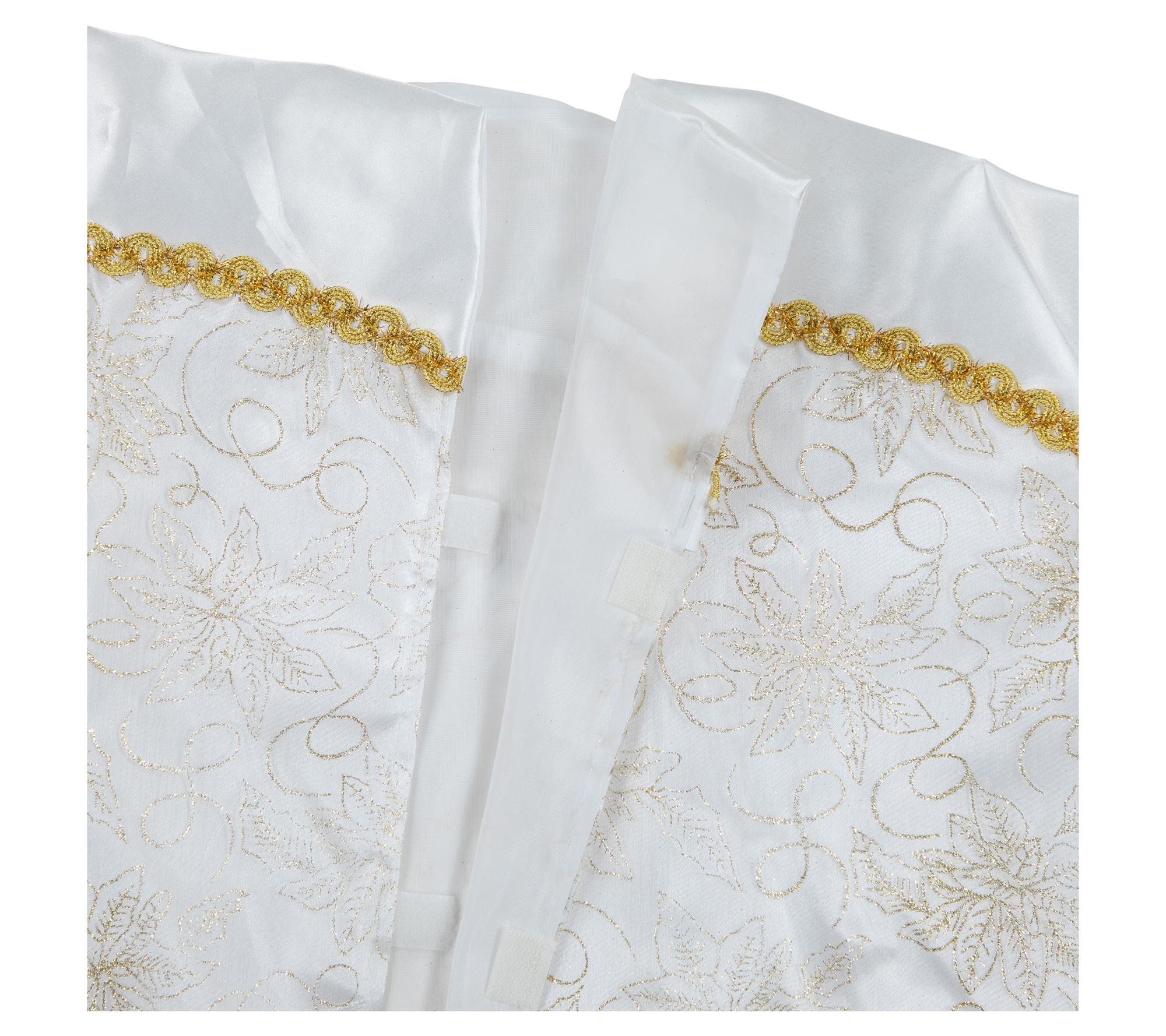 Holiday gatherings feel extra special when your tree is dressed in shimmering style. The lush white background and sparkling goldtone glitter poinsettia details lend a festive glow, while a scalloped satin edge and sheer organza bring softness to the scene. With an easy hook-and-loop closure, it's a simple finishing touch that completes your seasonal setup. From Northlight.