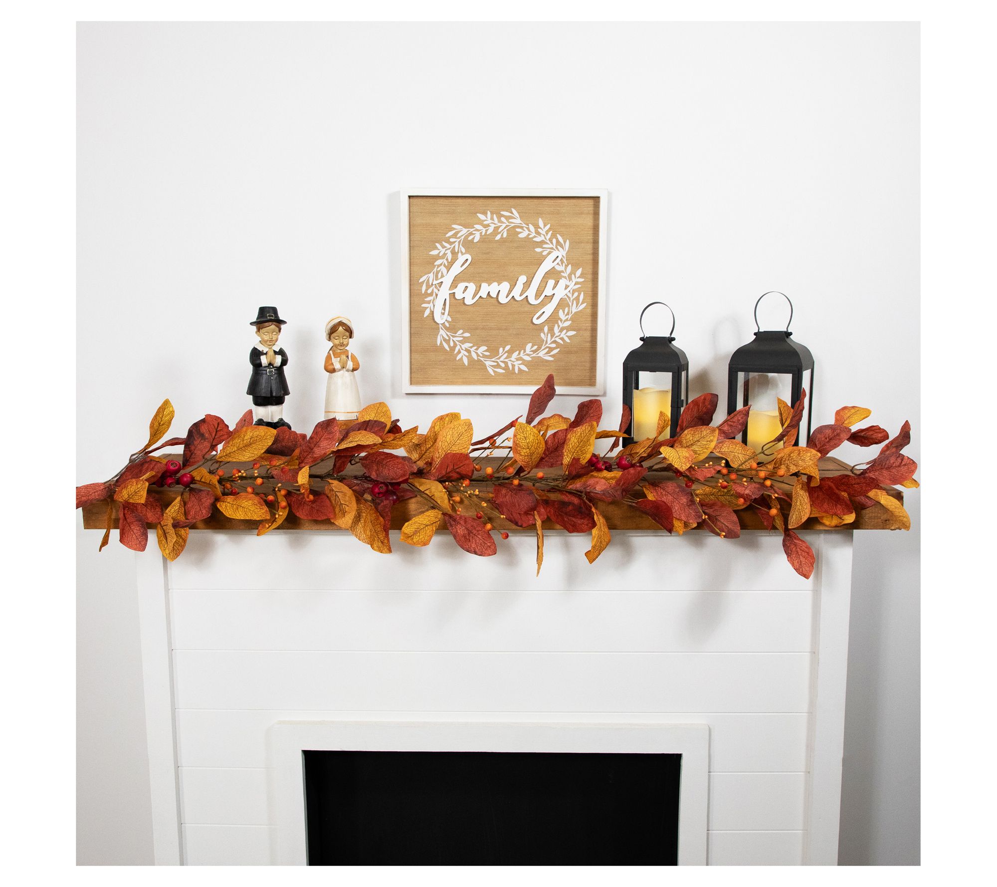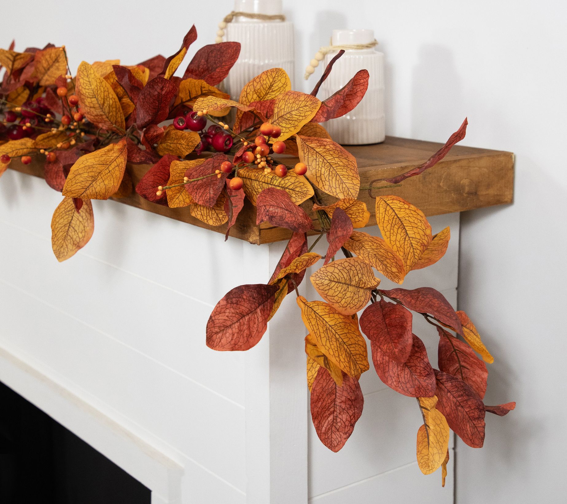 Create a warm, inviting atmosphere in your home this fall with this berries and leaves harvest garland. Draped along a mantel, wrapped around a banister, or set down a dining table, the vibrant orange and red leaves with berry accents bring a charming touch of the season to any gathering space. From Northlight.
