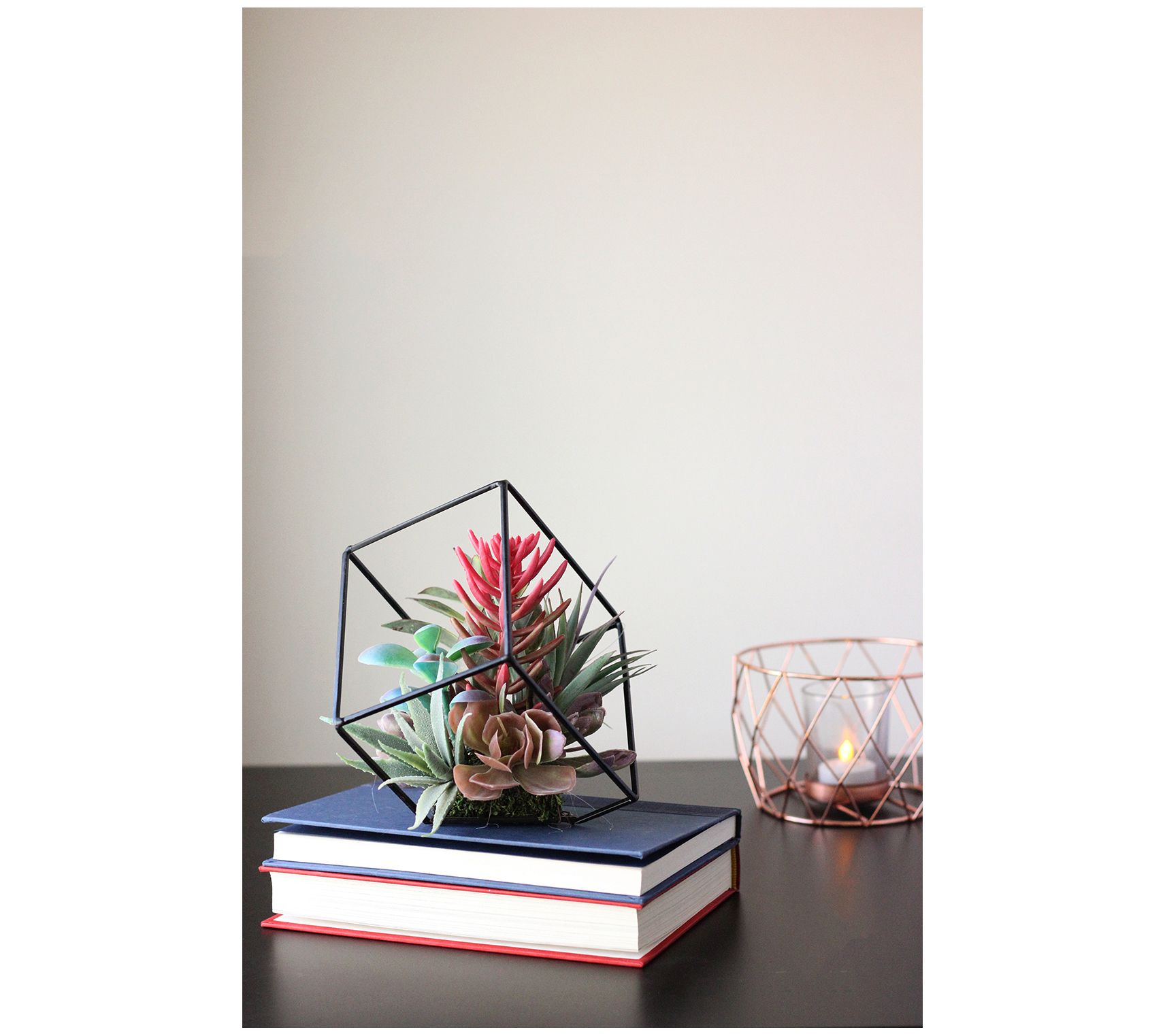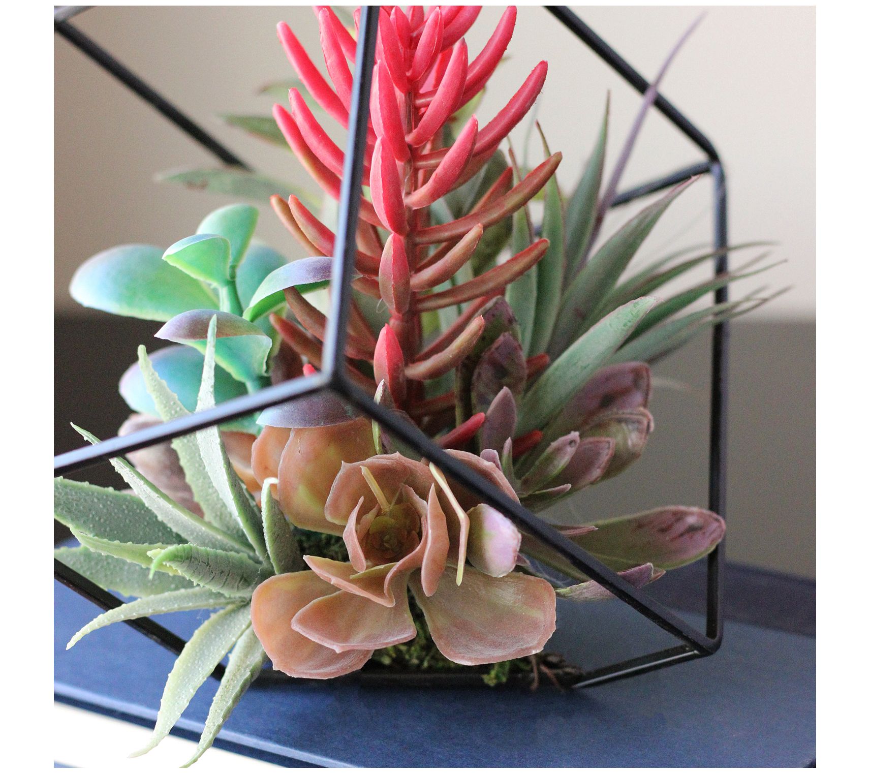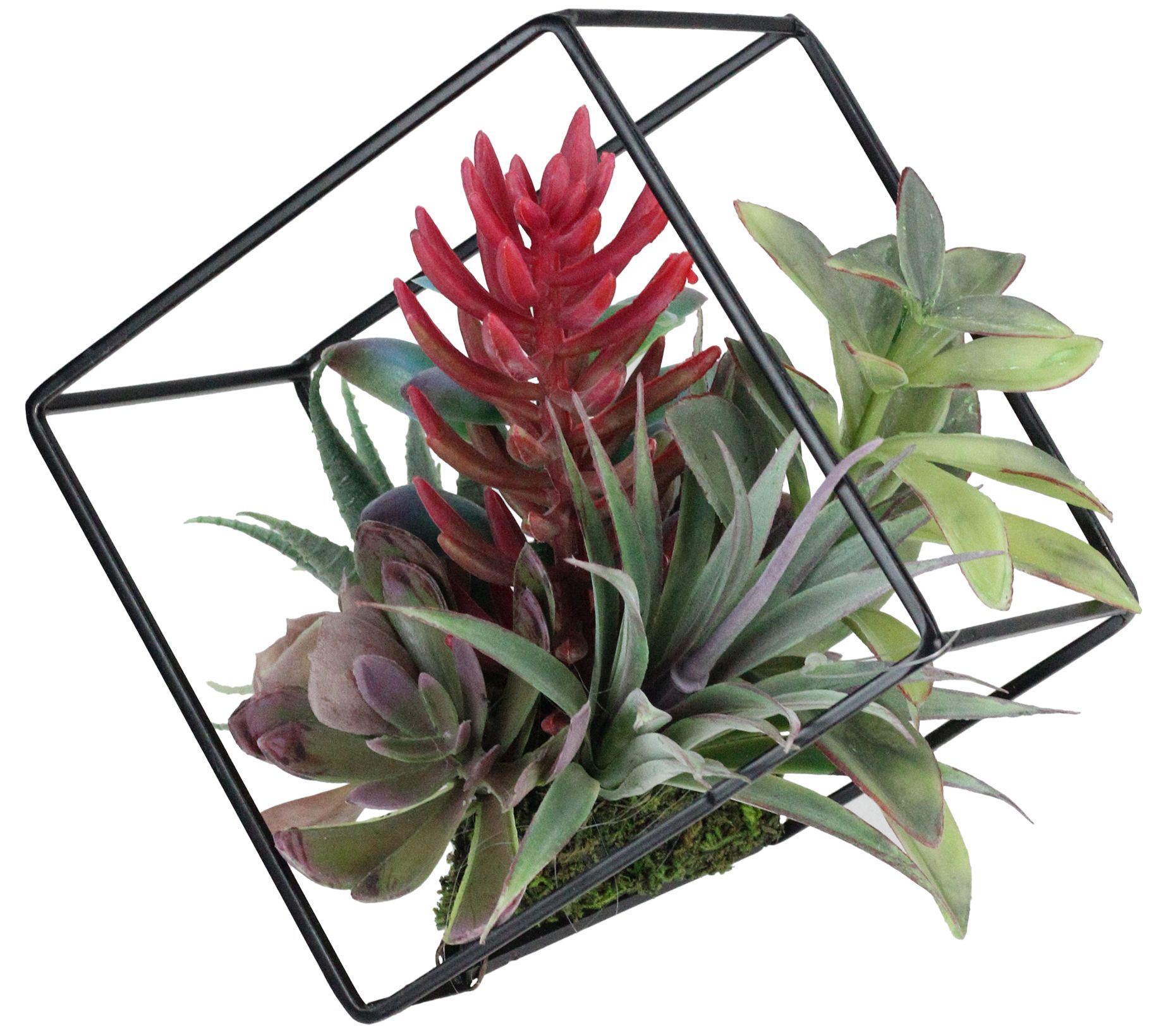 Add modern intrigue and geometric style to your home with this beautiful arrangement, featuring a collection of lifelike succulents and faux moss nestled in a black abstract metal frame. From Northlight.