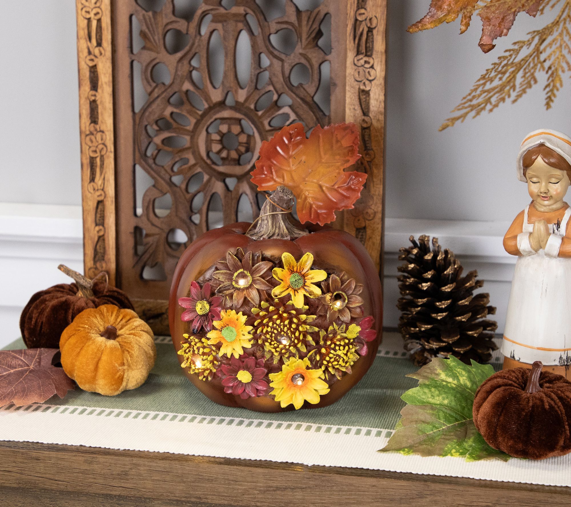 For Thanksgiving Day or as a harvest display, this petal-filled pumpkin lights the way all on its own with solar power. From Northlight.