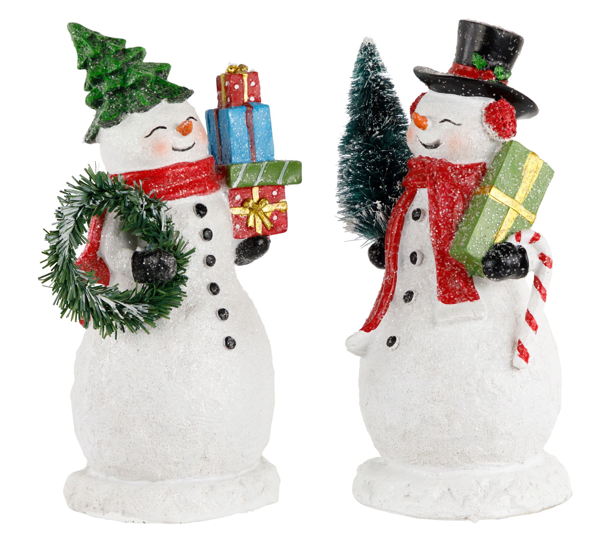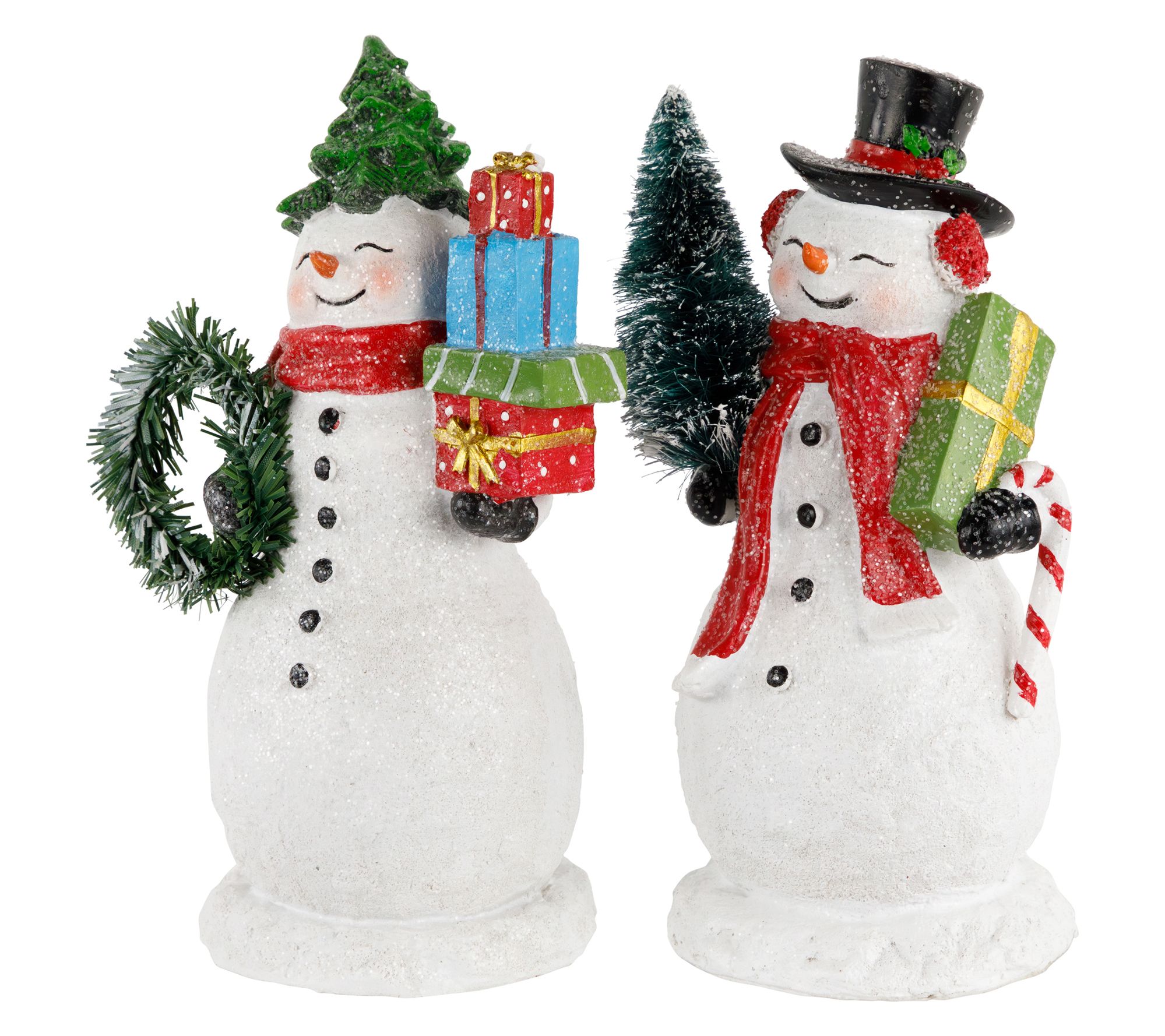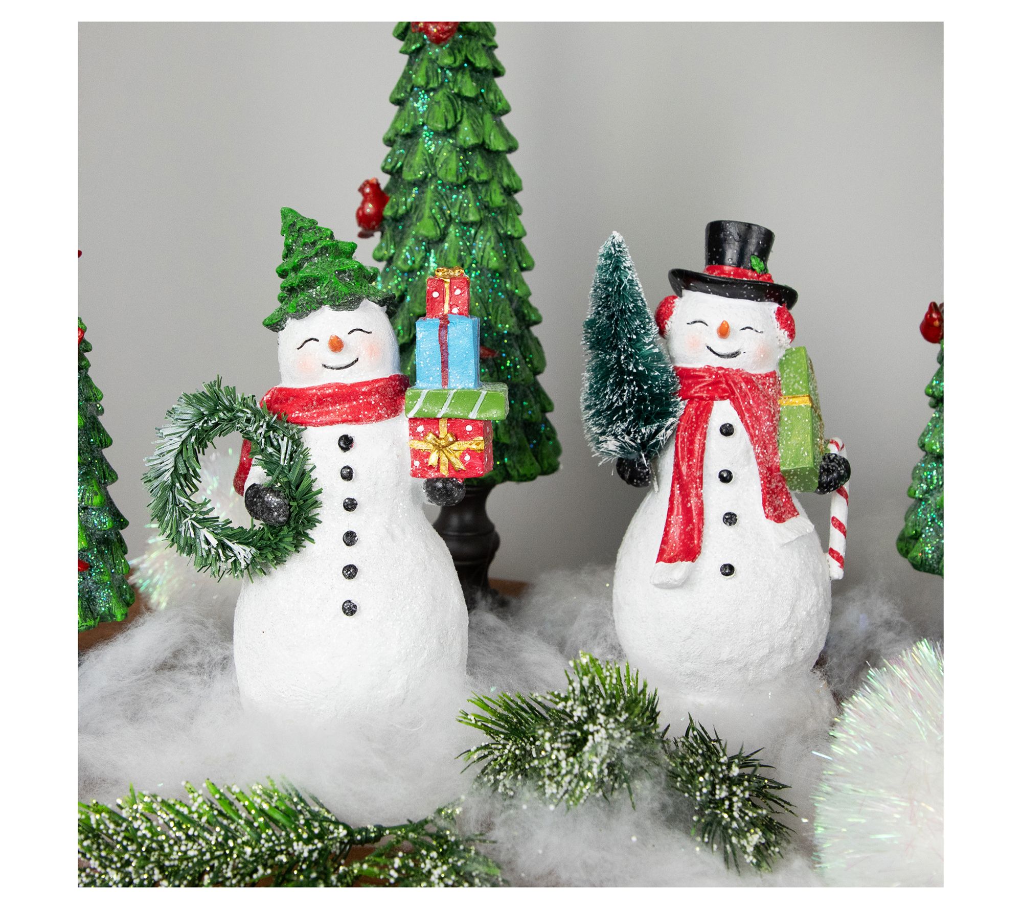 Celebrate the magic of winter with two delightful snowman figurines that bring charm to any setting. Dressed in cozy scarves and topped with jaunty hats, these cheerful friends each carry bundles of gifts that spark festive joy. Perfect for tabletops or mantels, their fun design is sure to draw smiles from your family and guests. Make them part of your indoor holiday display and enjoy a touch of whimsy. From Northlight.