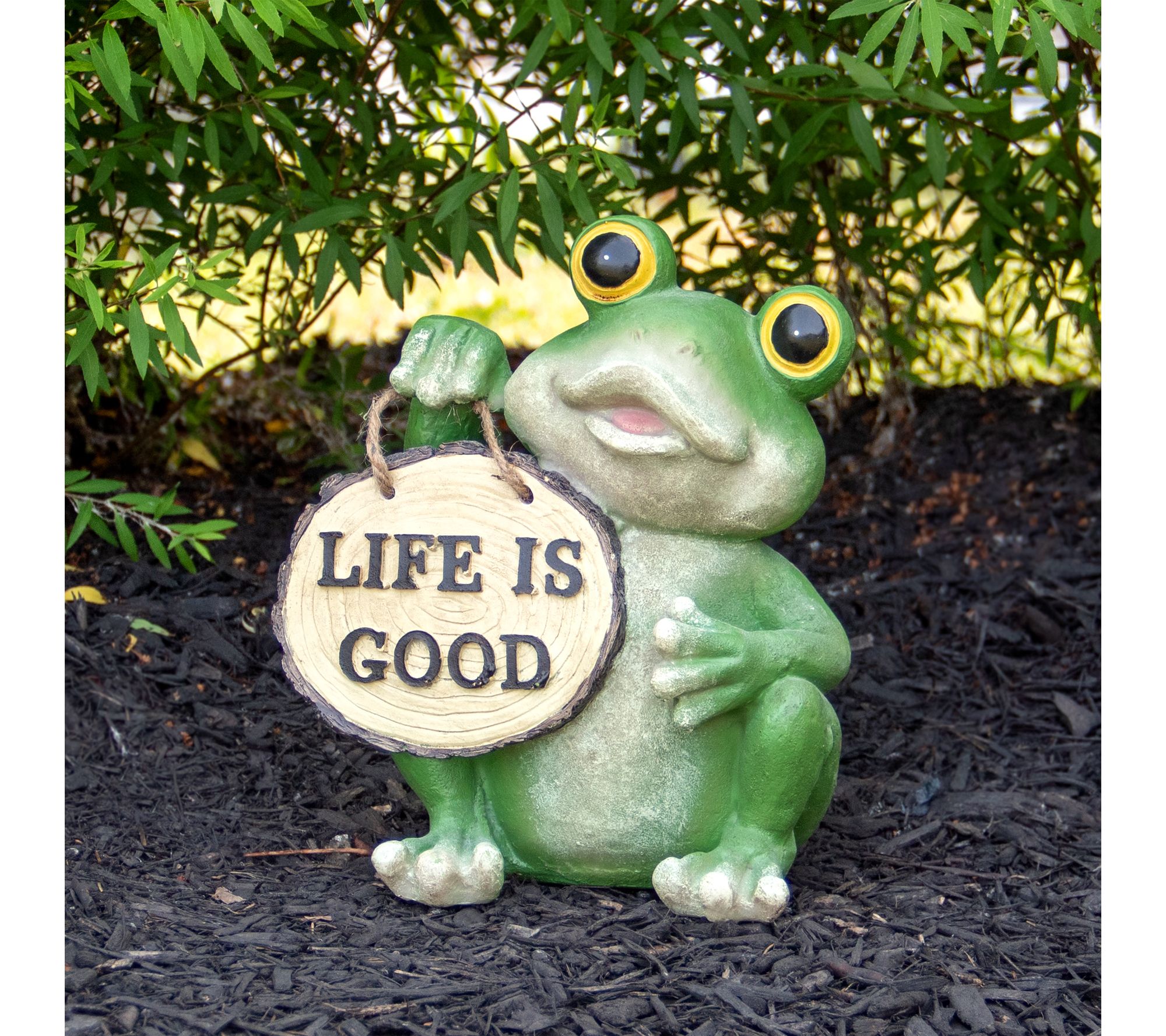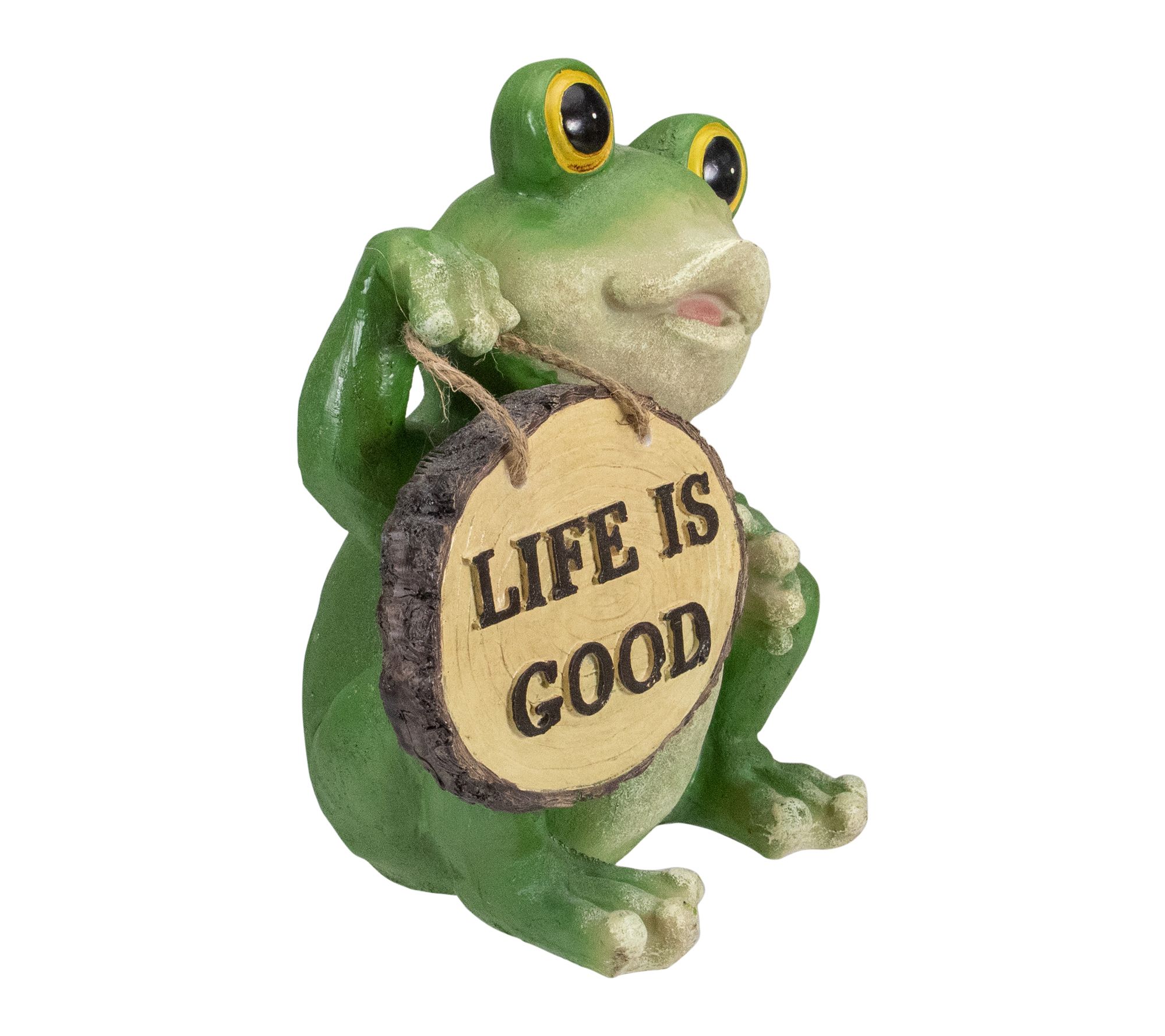 • Frog holding "Life is Good" sign statue adds an uplifting accent to gardens or patios