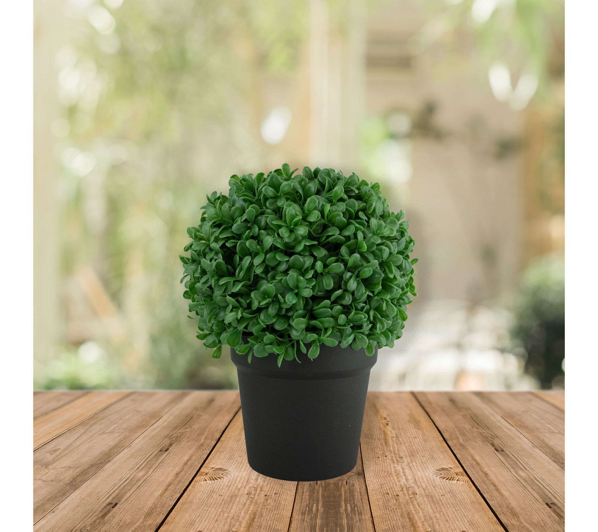 • Includes one 9.5" faux boxwood ball topiary in weighted round pot