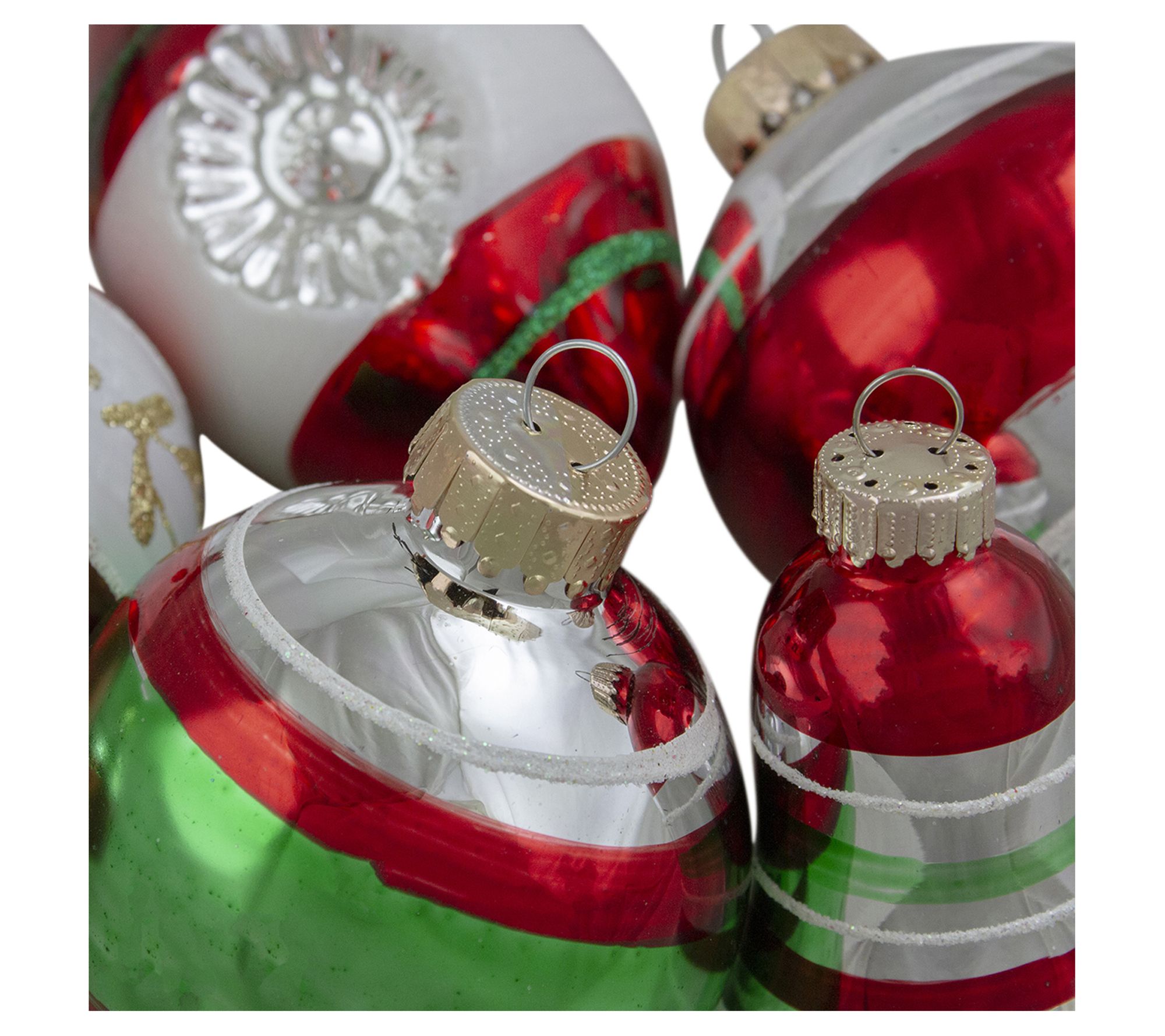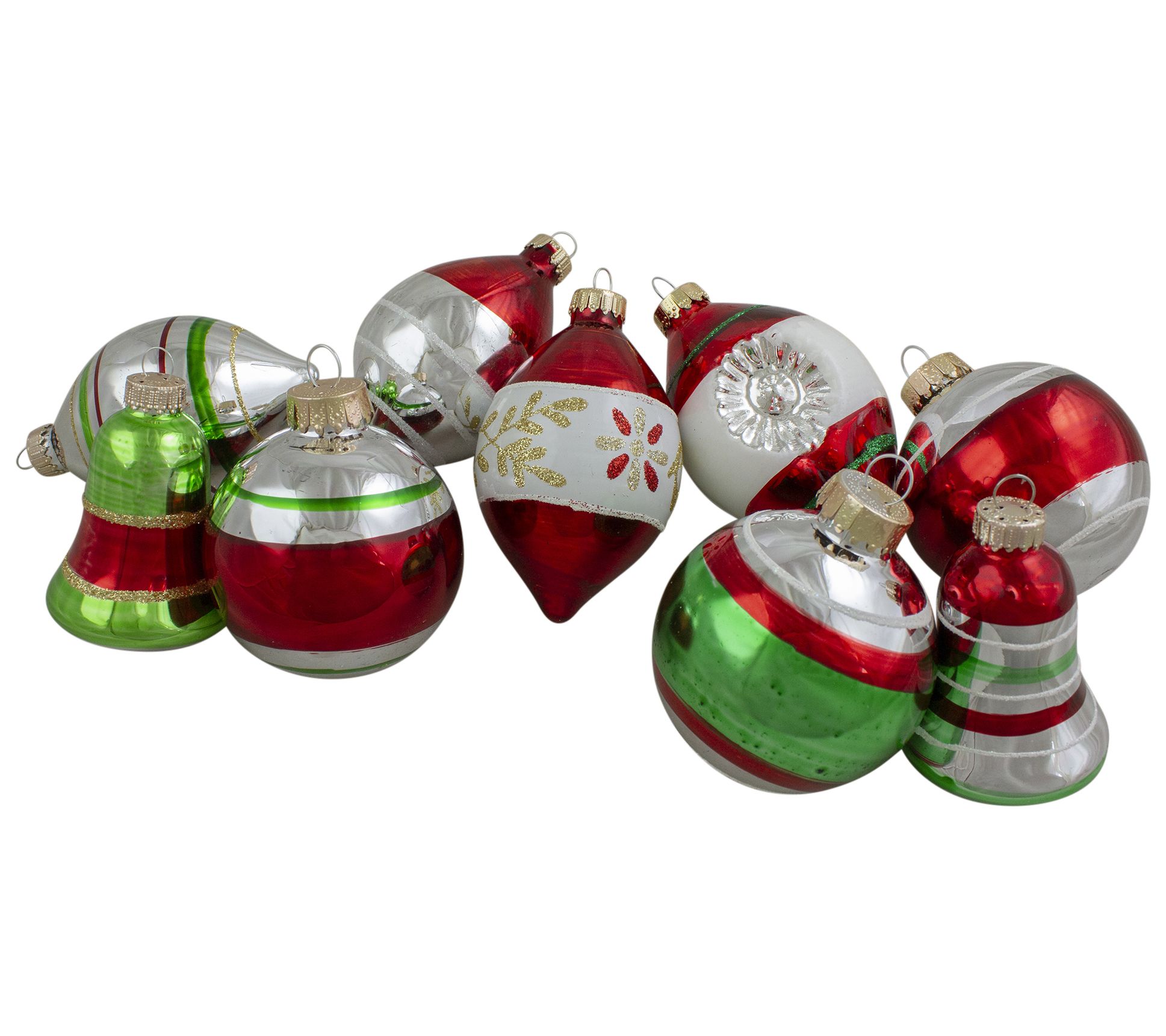 Elevate your holiday decor with these elegant glass ornaments, featuring a blend of shiny and glitter finishes. These ornaments come in an assortment of shapes including balls, bells, and finials, each adorned with glitter stripes, floral designs, and a unique retroreflector detail for a touch of vintage charm. Perfect for adding a festive sparkle to your tree, these ornaments are sure to become a cherished part of your holiday collection. From Northlight.