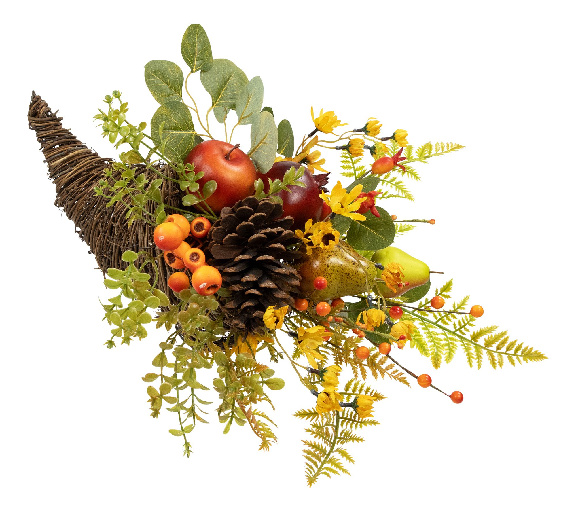 A bountiful display of autumn's colors, this apples and pears cornucopia brings inviting warmth to your table or entryway. Adorned with lifelike fruits, berries, sunflowers, and a pinecone, it's just the centerpiece to celebrate seasonal gatherings and create memories around meals with loved ones. From Northlight.