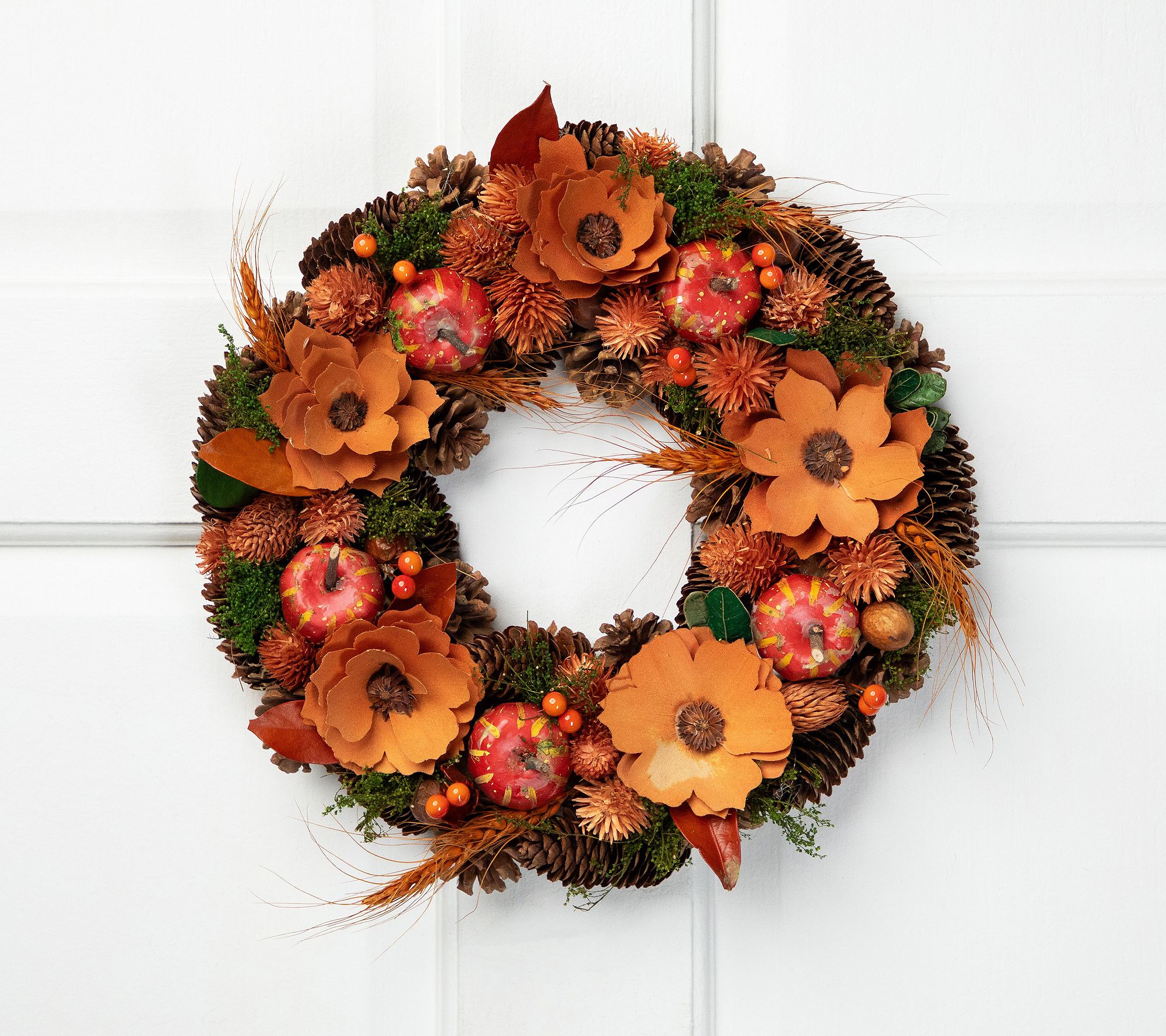 Add a taste of the harvest to your home with this artificial autumn wreath adorned with gourds, flowers, and dried foliage. From Northlight.