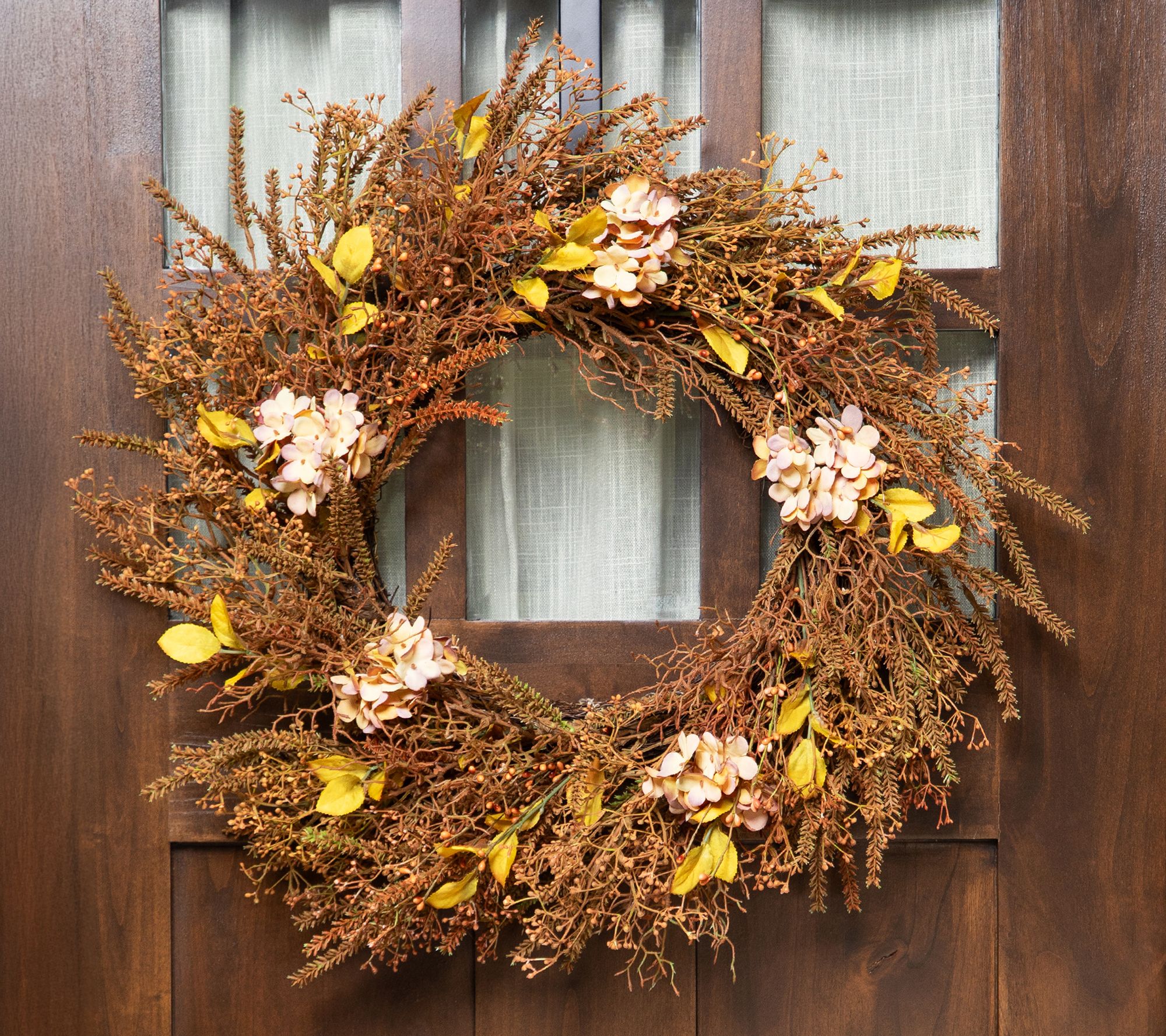 Hang up this harvest-themed wreath on your front door to greet guests with a fetching arrangement of twigs, leaves, and flowers. From Northlight.