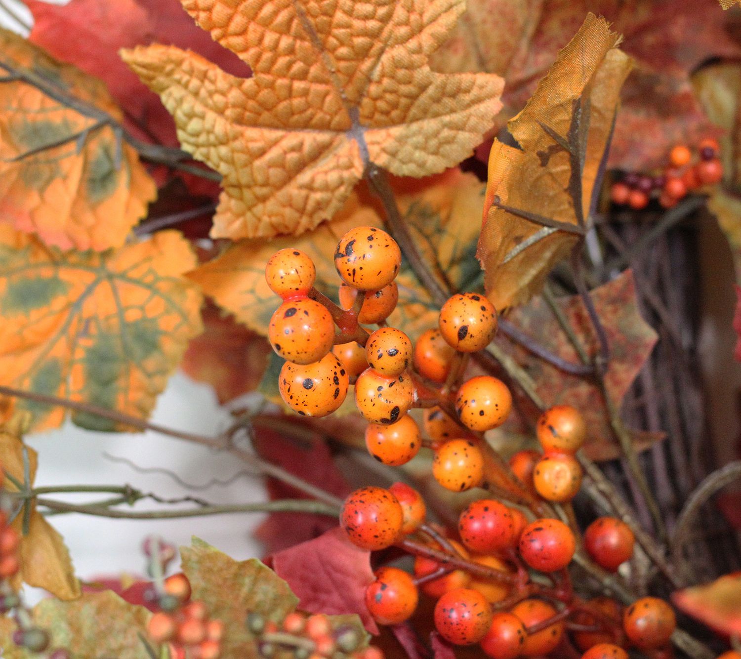 • Fall colored leaves; orange, red, green, and gold berries; natural twig backing