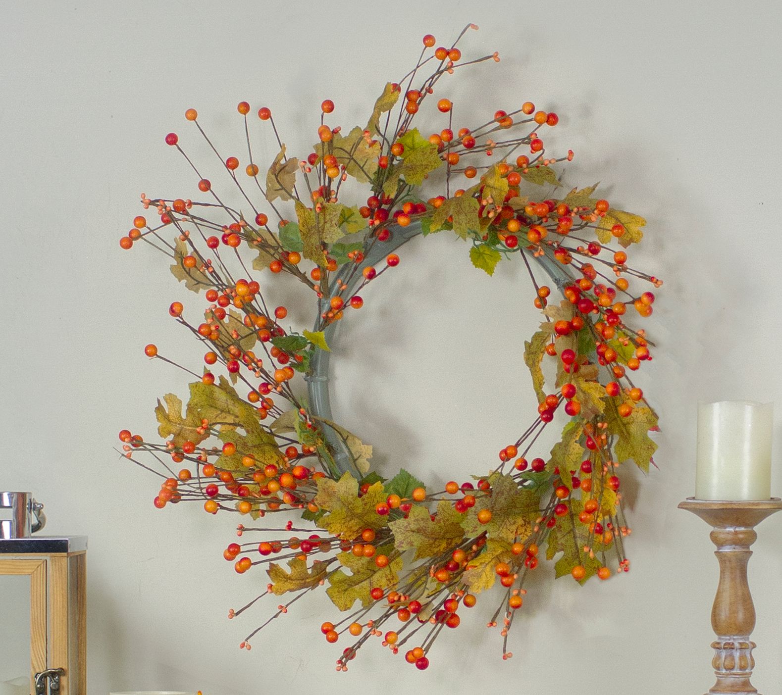 • Features red and orange berries with rustic fall leaves