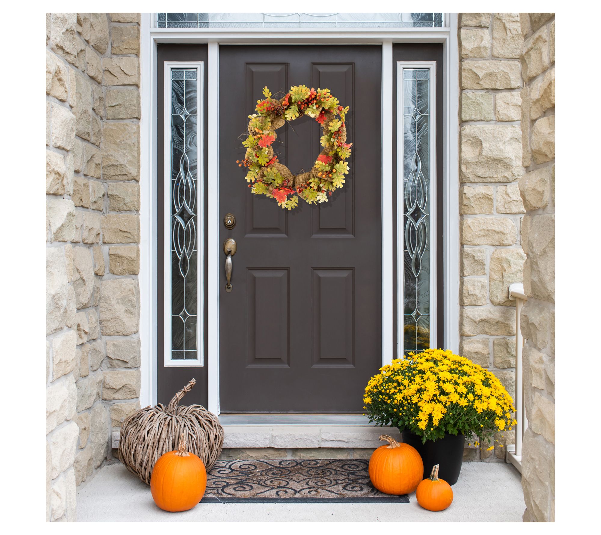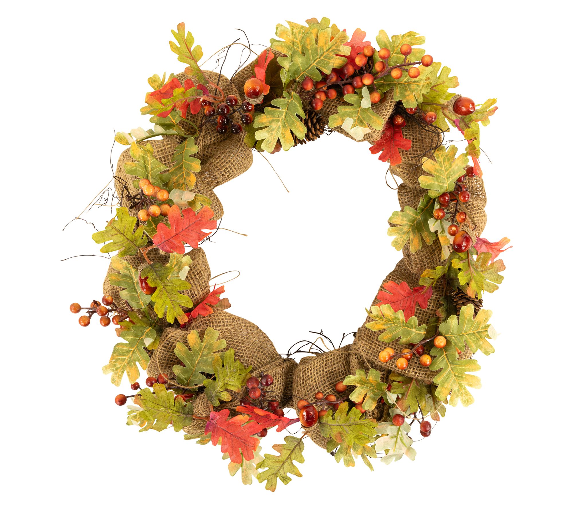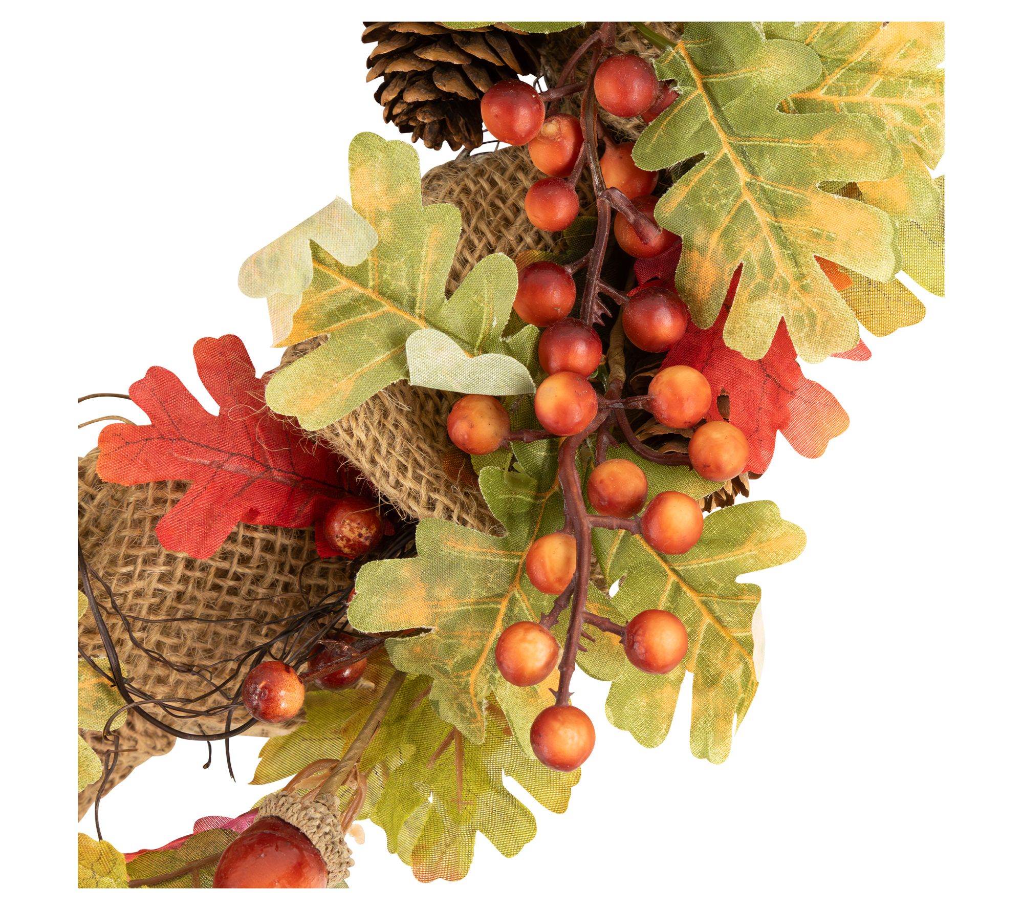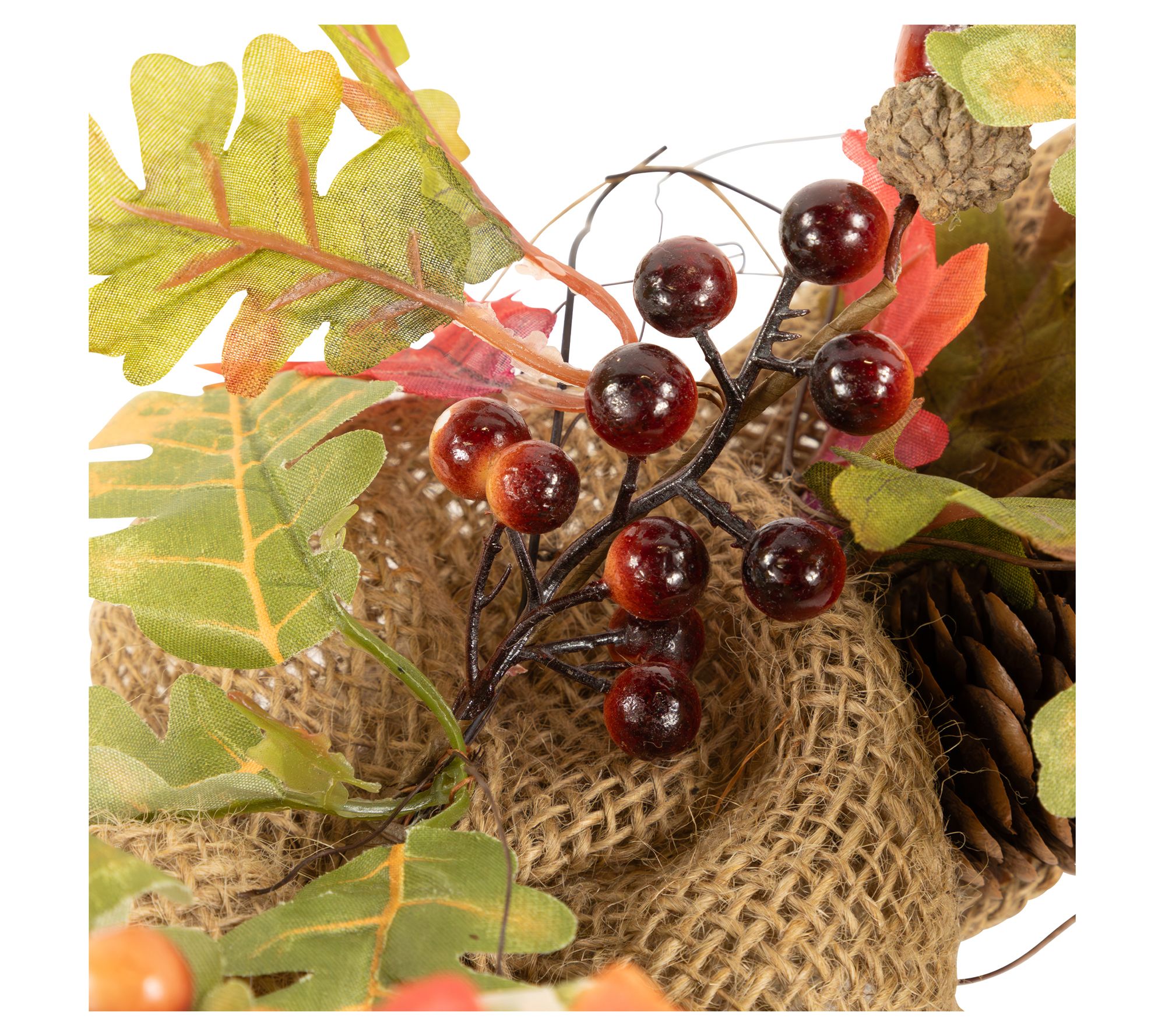 • Accented with autumn leaves, acorns, pinecones, and orange berries