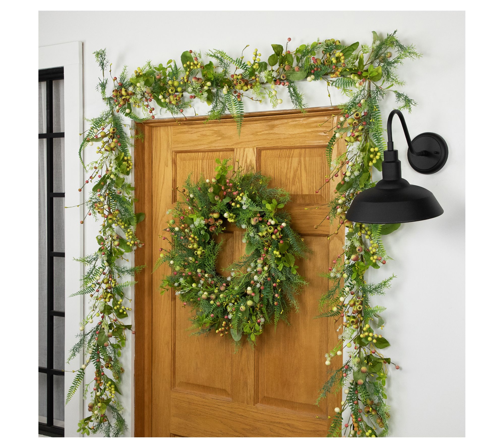 Welcome spring and summer into your home with this lush berry and crabapple fern foliage wreath. Intricately designed with a mix of ferns, green leaves, and pops of red berries and two-tone crab apples, this wreath brings vibrant life to any space. Whether hung on its natural grapevine base or laid flat as a centerpiece, it adds charm and a warm welcome to mantles and entrance doors. From Northlight.