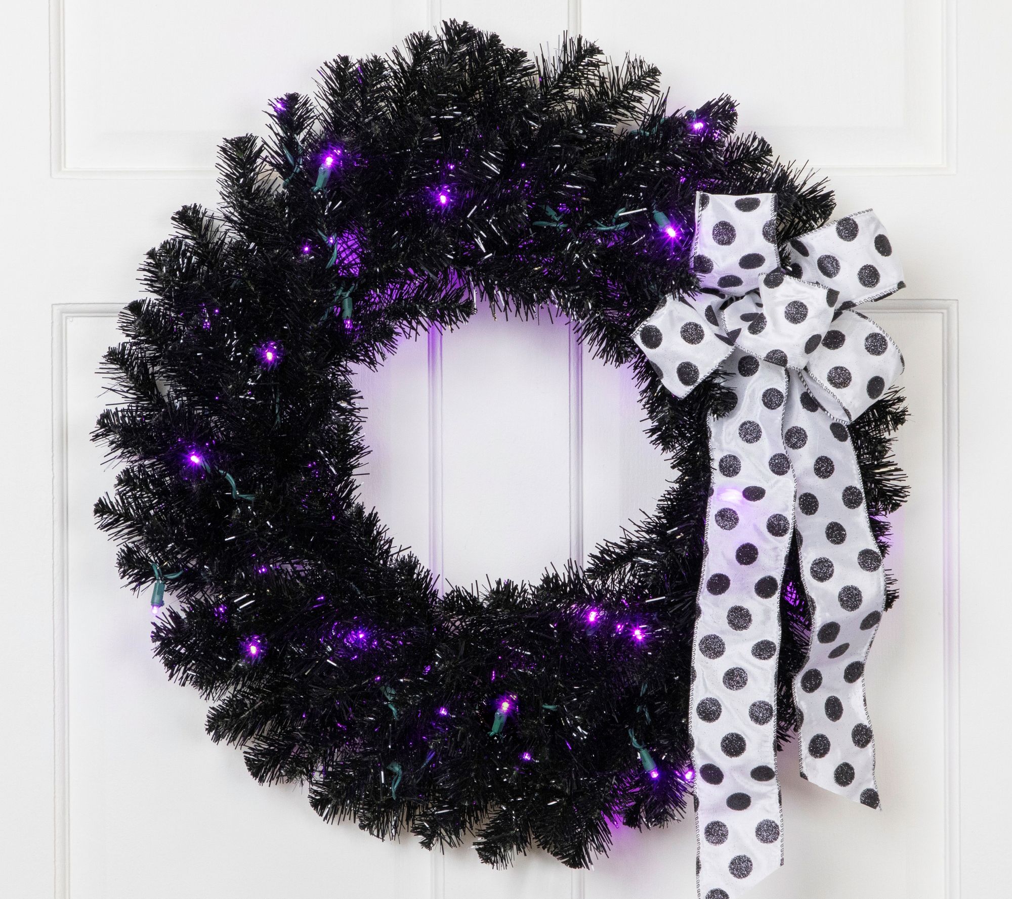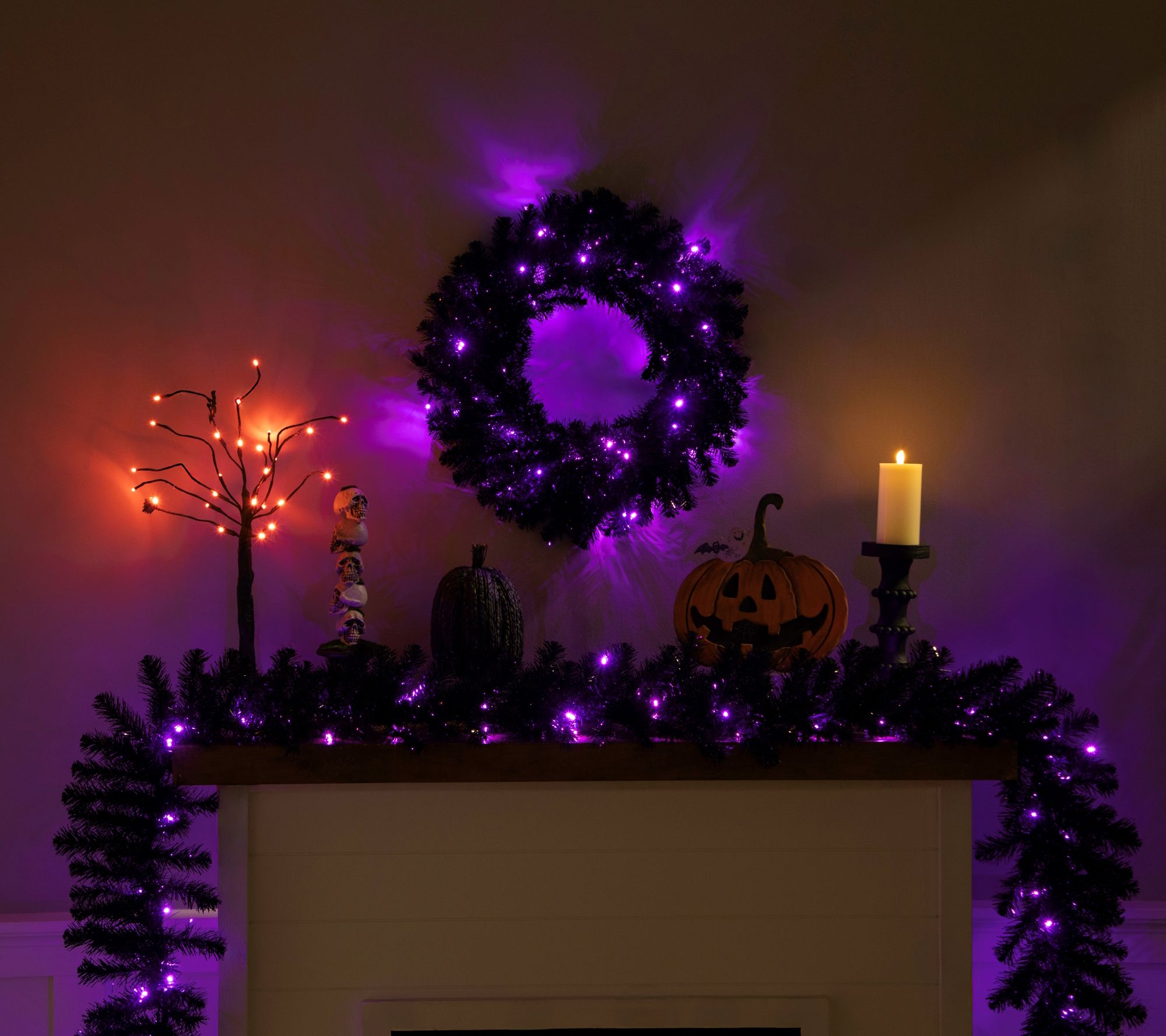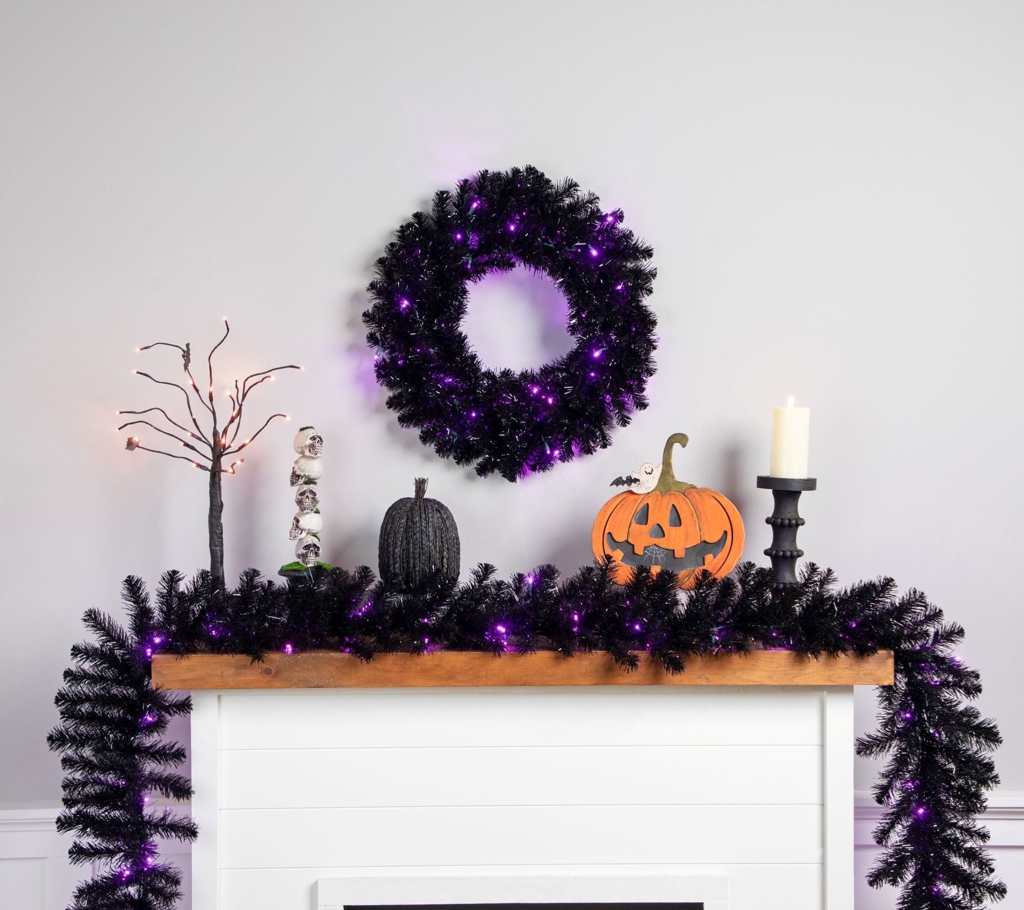 Add a spellbinding touch to your entryway or mantel with this black crystal pine Halloween wreath, featuring a sleek shiny finish and glowing purple LED lights. Whether greeting trick-or-treaters on your front door or creating a bewitching accent indoors, this wreath brings just the right mix of style and spooky fun to your seasonal decor. From Northlight.