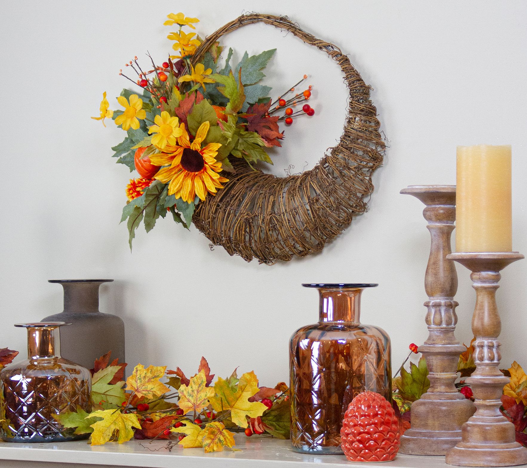 • Lifelike foliage, sunflowers, pumpkins, twigs, and pinecones