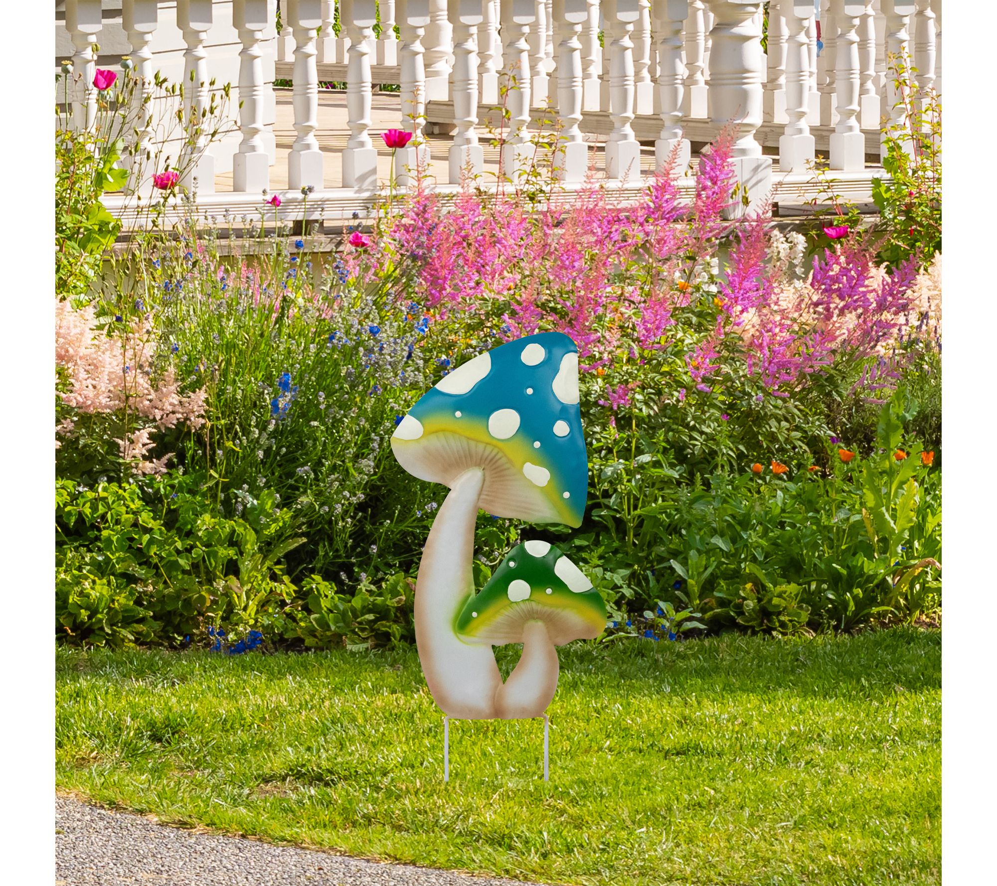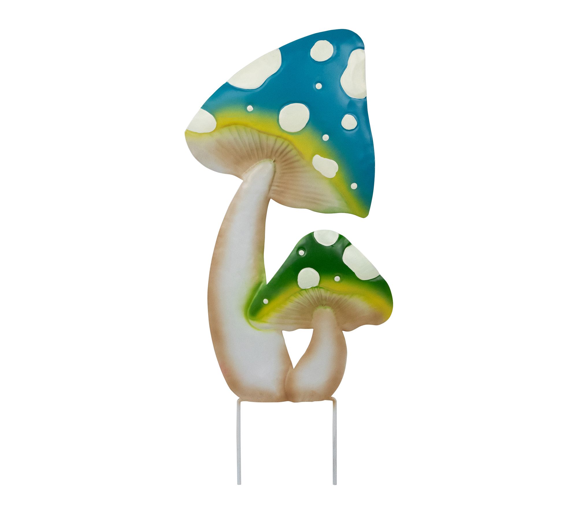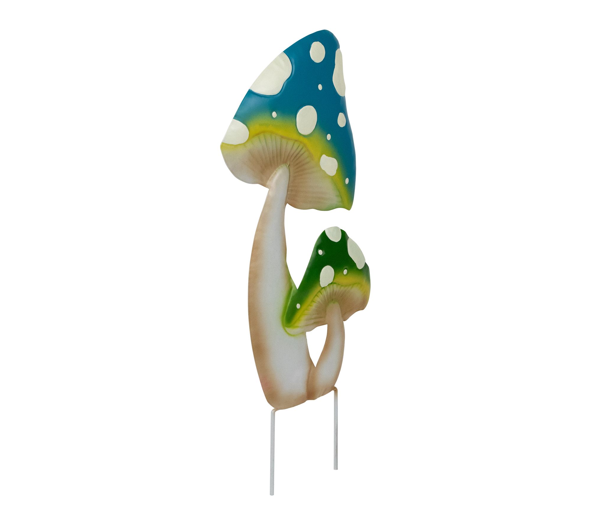 Enchant your garden with the playful charm of this metal mushroom garden stake, showcasing two spotted mushrooms in vibrant blue and green hues with cheerful yellow accents. Create a whimsical outdoor retreat by placing it along a pathway or beside your front door -- no assembly needed, just instant color and magic for your yard. From Northlight.