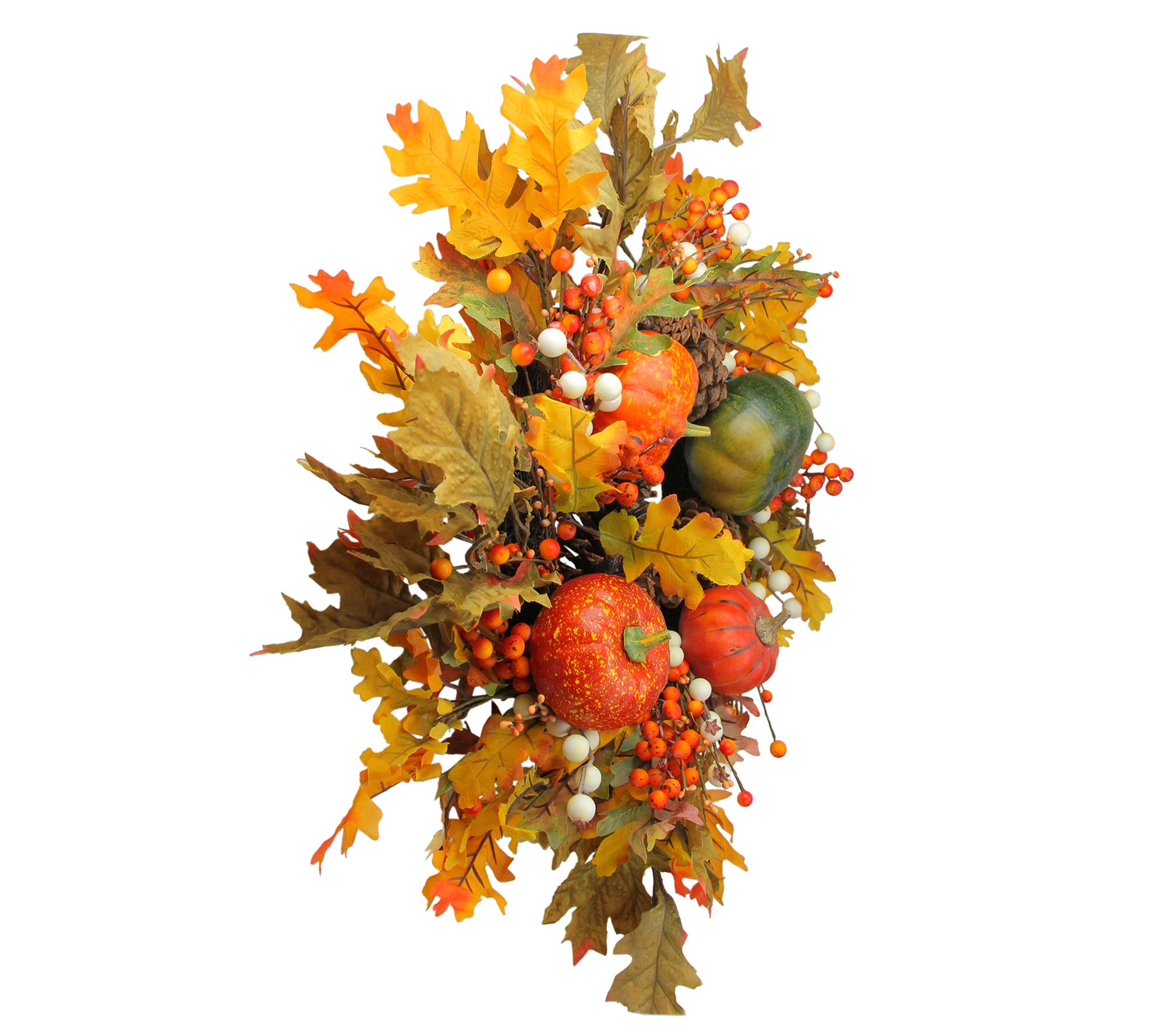 • Orange and green leaves; orange berries; brown pinecones; green and orange pumpkins