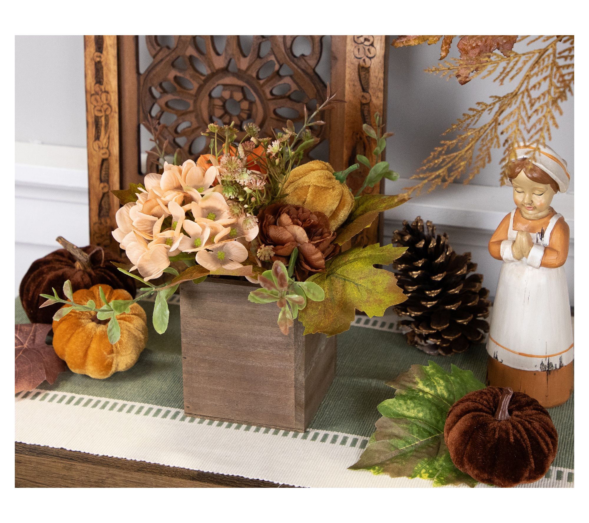 Welcome seasonal warmth into your space with this floral and pumpkin box harvest decor. Earth-tone pumpkins and lifelike flowers nestle in a distressed taupe wooden box, instantly adding a cozy autumn touch to tabletops, mantels, or desks. From Northlight.