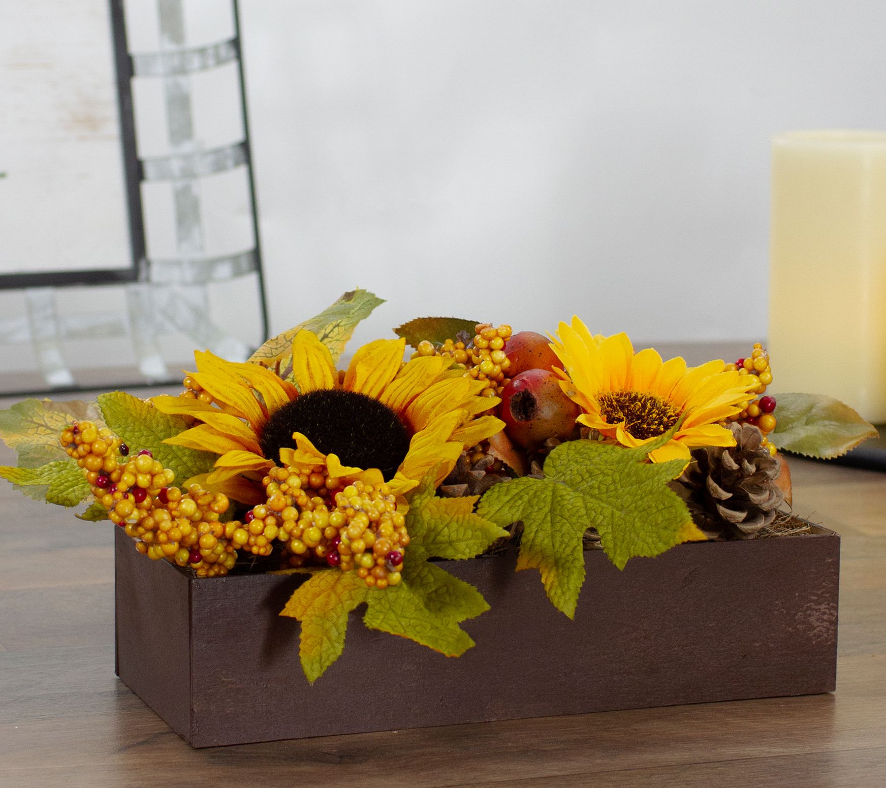 • Lifelike sunflowers and leaves accented with berries in a brown box