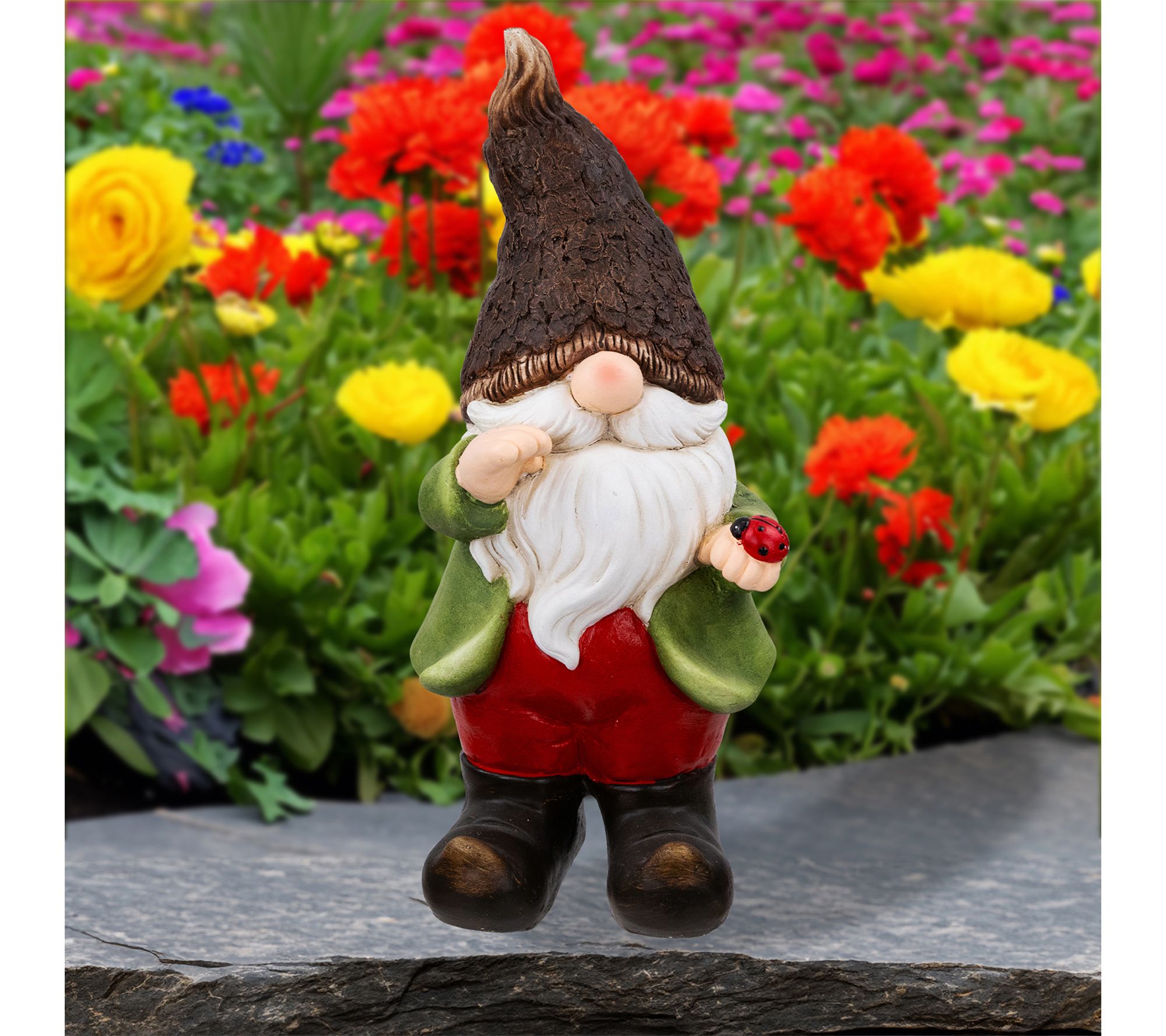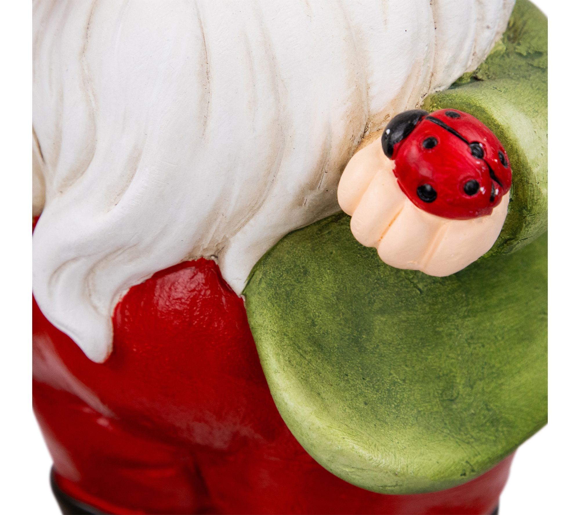 • Gnome garden statue features bright attire and a ladybug accent